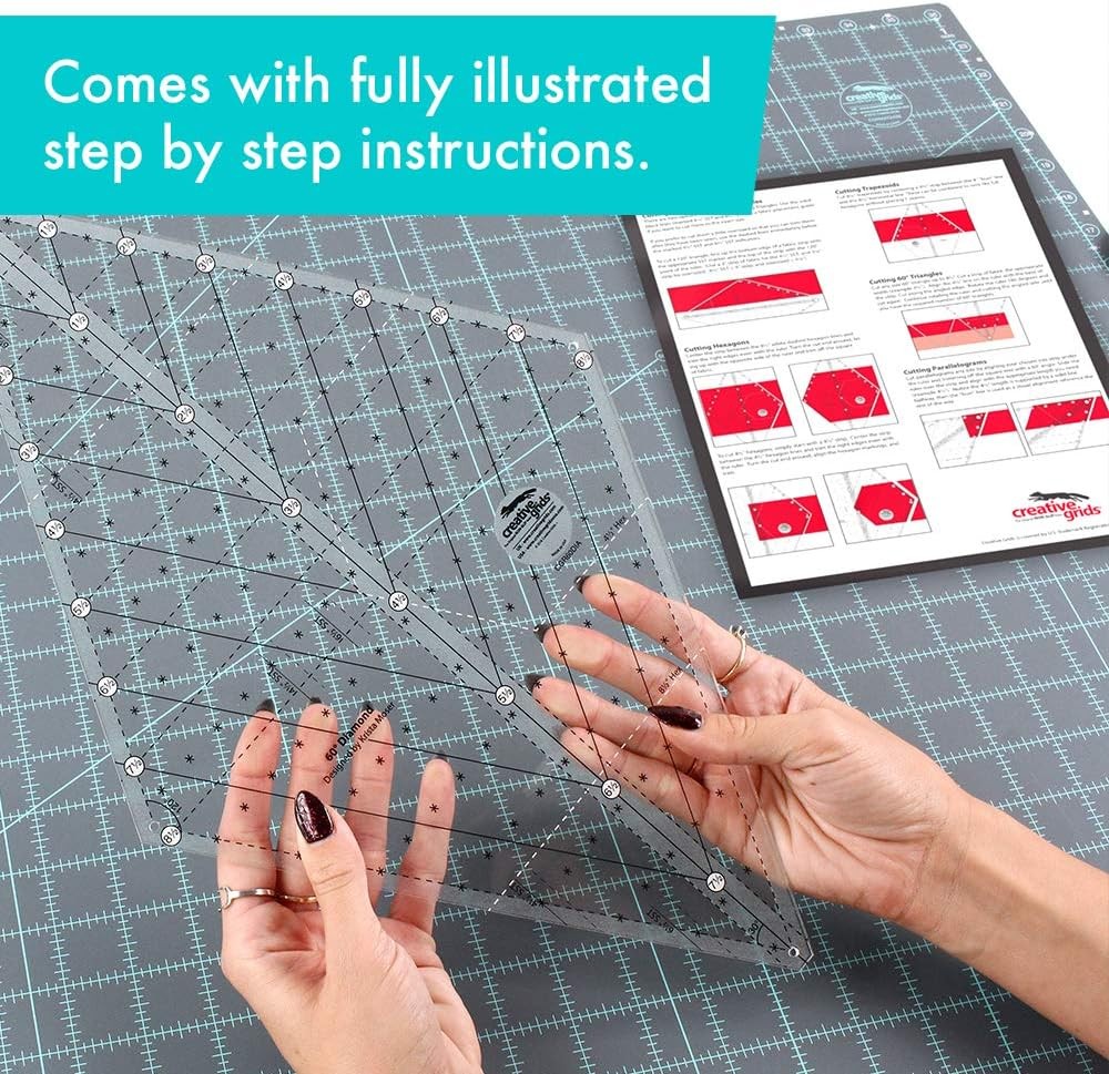 Creative Grids 60 Degree Diamond Ruler - CGR60DIA Transparent Product Details Product Dimensions: 14.09 x 8.7 x 0.2 inches Is Discontinued By Manufacturer: No Item Weight: 1.6 ounces Manufacturer: Checker Notions Company Inc Material: Acrylic Brand: Creative Grids Color: Transparent Style: Traditional Product Dimensions: 16"L x 4"W Increase your diamond design possibilities with the 60 degree Diamond Ruler. Cut 60 degree diamonds, hexies, and triangles up to 8-1/2 inches. Maximize the design potential by cutting them from strip sets. There are even markings included to cut 120 degree side setting triangles. The ruler slides easily over the fabric until pressure is applied. Then, our exclusive gripper holds the fabric in place while cutting, eliminating slipping and miss-cuts! Want a smaller size? The Mini 60 Degree Diamond Ruler (CGR60DIAMINI) has all of the great features of the 60 degree Diamond Ruler but in a smaller, easier to manipulate size for smaller projects! Both come with fully illustrated step by step instructions or scan the QR Code printed on the instructions to view a video demonstration. Total Size - 9-3/4in x 16-1/2in Made in the USA