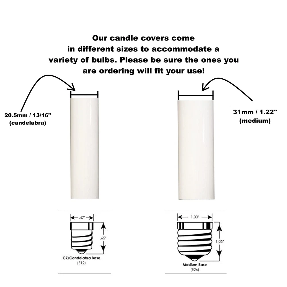 Store New Arrivals Add to Favorite View Feedback Contact Creative Hobbies® 1.75" White Plastic Candle Covers Sleeves Chandelier Socket Covers ~ 1.75 Inch Candelabra Base | Set of 12 Description Item model number 1749 Item Shape 1.75 Inch Mounting Type Floor Mount Color white Product Dimensions 5.3 x 0.85 x 2 inches; 0.71 ounces Material Plastic Base Type Candelabra Is Discontinued By Manufacturer No Brand Creative Hobbies Manufacturer Creative Hobbies 🕯️ Set of Twelve Candle Covers: Replace your discolored, old, or missing covers with these high-quality candelabra candle covers, perfect for enhancing the look of your chandeliers and light fixtures. 📏 Perfect Size: Each candle cover measures 1.75 inches in height, making them ideal for a variety of chandelier and sconce designs. ✨ Standard Candelabra Fit: These covers have a 7/8" outside diameter and 13/16" inside diameter, designed to fit standard candelabra base E12 lamp sockets, ensuring a secure and snug fit. 🏠 Durable Construction: Made from durable extruded white plastic, these candle covers are built to last, maintaining their color and integrity over time. Enhance the appearance of your chandeliers and light fixtures with Creative Hobbies 1.75 Inch White Plastic Candle Cover Sleeves. This 12-pack includes high-quality covers designed to replace old, discolored, or missing candle sleeves on your candelabra base E12 lamp sockets. Constructed from durable extruded white plastic, these covers offer longevity and a clean, polished look. Each cover has a 7/8" outside diameter and a 13/16" inside diameter, providing a perfect fit for standard candelabra sockets. The classic white finish complements any décor style, making these covers a versatile addition to your lighting fixtures. Measuring 1,75 inches in height, these covers are ideal for a variety of chandelier and sconce designs. ABOUT US We offer the best prices around on high quality products. Our E-store includes media such as books, movies, music and games while offering electronics, toys, sporting apparel, clothing, tools, general home, garden items and more. SHIPPING We are always working hard to ensure your package arrives as soon as possible. Please understand that some factors like weather, high postal traffic, and the performance of shipping companies are outside of our control. We offer free shipping to the lower 48 states and ship within 2 business days of payment, usually sooner. We do not accept P.O. Boxes. Please provide a physical address. RETURNS We offer a 30-Day Return Policy on items which you are not completely satisfied with. You have the option for a full-refund or an exchange of the item. No returns are available on items shipped outside of the USA. PAYMENT We accept PayPal. CONTACT US This page content is yet to come Please ad us to your favorite seller and visit again later Thank You CUSTOMER SATISFACTION We try our very best to make sure every customer is completely satisfied. If there's a problem, message us! We're happy to help.