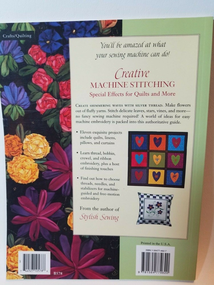 Creative Machine Stitching Special Effects for Quilts by Patricia Nelson 2003 - 112 pgs. Soft cover. Create shimmering waves with silver thread. Make flowers out of fluffy yarns. Start a snowfall with iridescent threads. Stitch delicate leaves, stars, vines, and much more--no fancy sewing machine required! A world of ideas for easy machine embroidery is packed into this authoritative guide. Eleven exquisite projects include quilts, linens, pillows, and curtains Learn thread, bobbin, crewel, and ribbon embroidery, plus a host of finishing touches Find out how to choose threads, needles, and stabilizers for machine-guided and free-motion embroidery From the author of Stylish Sewing. We are always happy to combine shipping. If buying more than one item, "add to cart" instead of clicking the "buy it now" button. Then click on ?Request Total? link. Please do not pay until you have requested and received a combined shipping invoice. Please check out our other items! ! ! ! . Happy buying! Happy shopping!