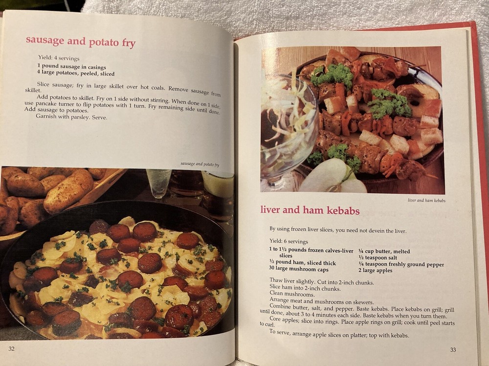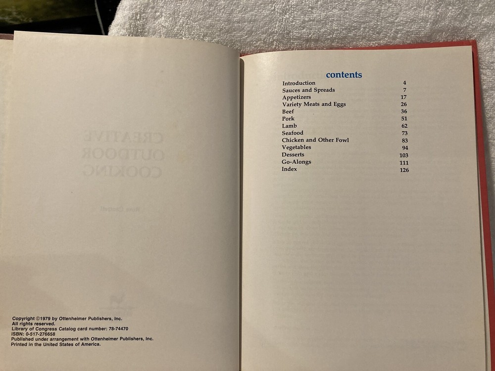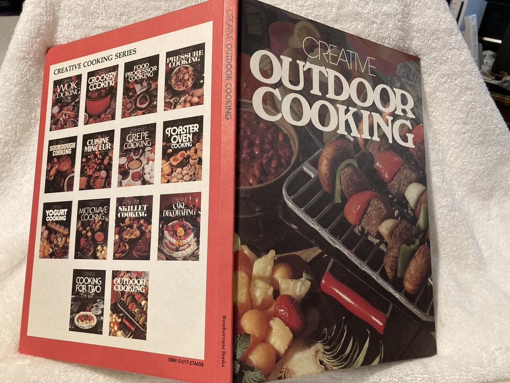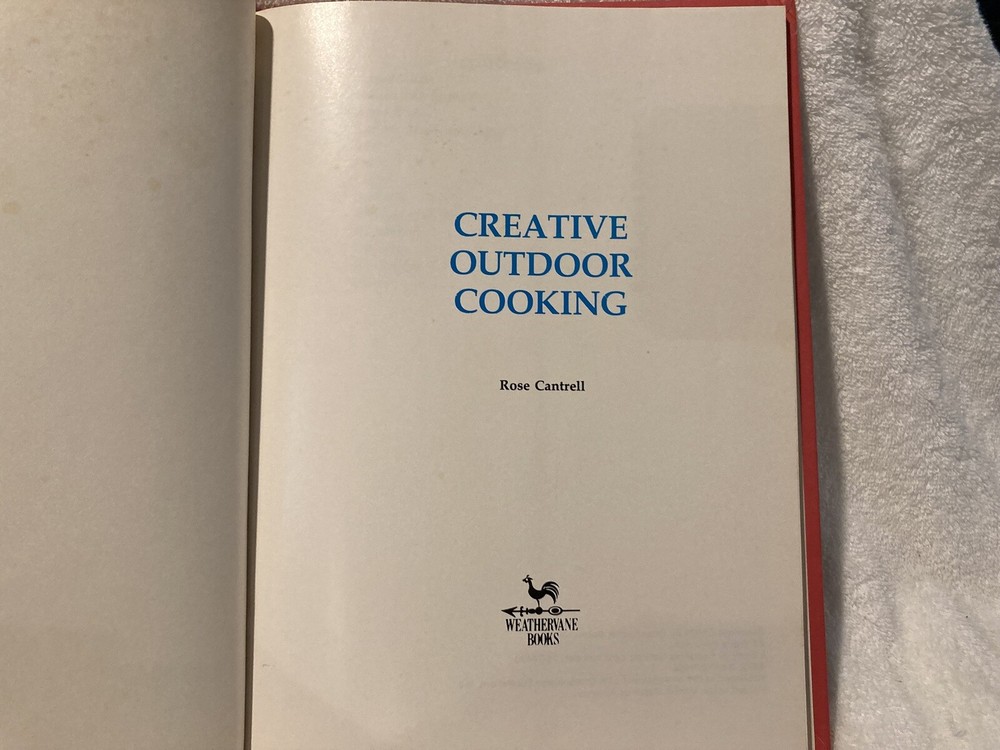 Free Shipping. Creative Outdoor Cooking by Rose Cantrell from 1979 is a hard cover and it is in very good condition. The covers have some minor wear on corners and some edges, the corners have some minor wear on some and one is bumped. The pages are in very good condition, I see no rips or dog eared corners, there is very light foxing on the inside back and front covers and on the first and last pages. The spine is strong and the pages are tight. The book measures 8 1/4" by 11", has 128 pages and was published by Randomhouse Publishers, Inc.