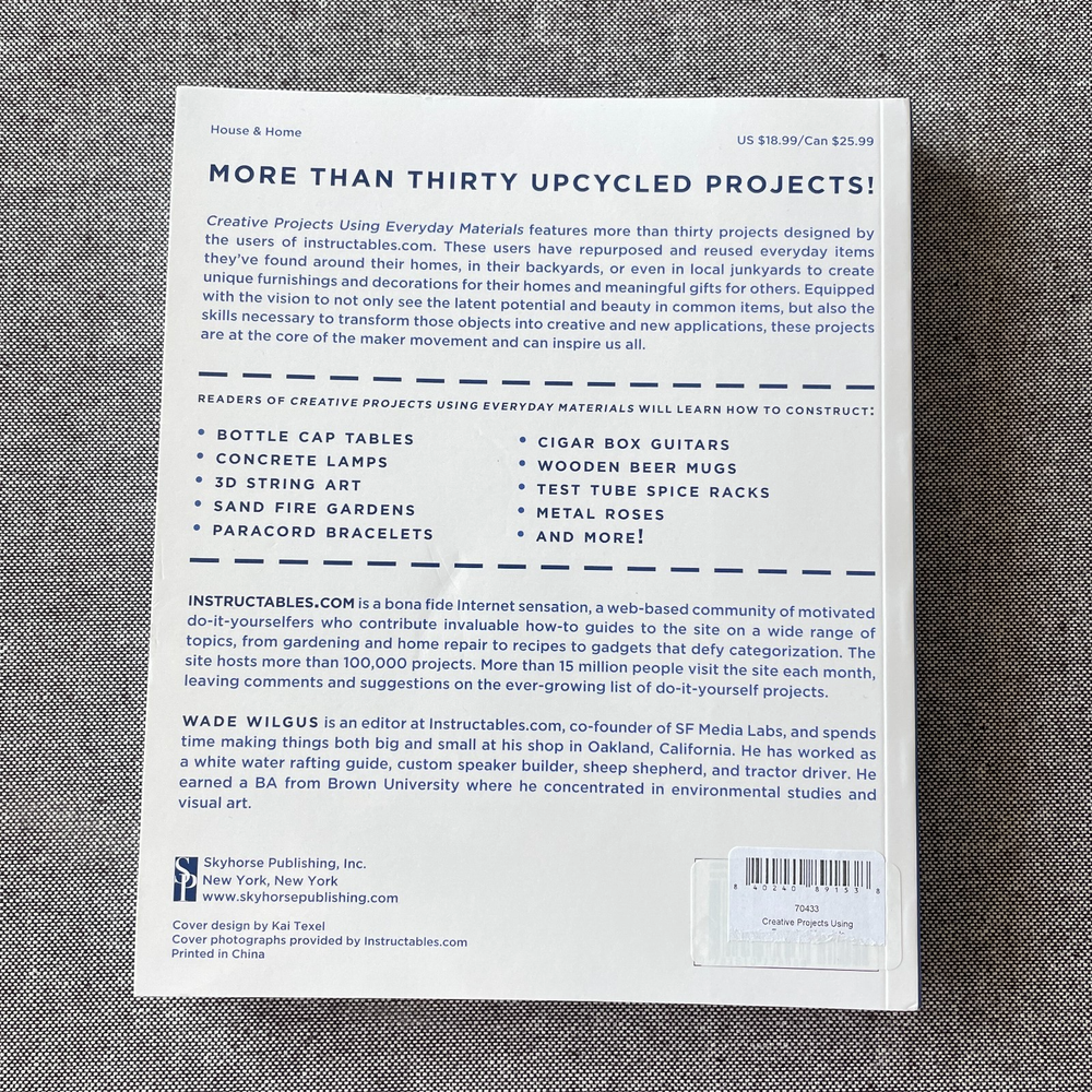 Creative Projects Using Everyday Materials : 33 Innovative Ideas for Your Home, Yard, or Back 40 Edited by Noah Weinstein Such a fun and useful book with detailed instructions for making all kinds of cool thigs. And inspiration! Creative Projects Using Everyday Materials features more than thirty projects designed by the users of instructables.com. These users have repurposed and reused everyday items they've found around their homes, in their backyards, or even in local junkyards to create unique furnishings and decorations for their homes and meaningful gifts for others. Equipped with the vision to not only see the latent potential and beauty in common items, but also the skills necessary to transform those objects into creative and new applications, these projects are at the core of the maker movement and can inspire us all. Readers Of Creative Projects Using Everyday Materials Will Learn How To Construct: Bottle Cap Tables, Concrete Lamps, 3D String Art, Sand Fire Gardens, Paracord Bracelets, Cigar Box Guitars, Wooden Beer Mugs, Test Tube Spice Racks, Metal Roses, And More!, Instructables.com is a bona fide Internet sensation, a web-based community of motivated do-it-yourselfers who contribute invaluable how-to guides to the site on a wide range of topics, from gardening and home repair to recipes to gadgets that defy categorization. The site hosts more than 100,000 projects. More than 15 million people visit the site each month, leaving comments and suggestions on the ever-growing list of do-it-yourself projects., Creative Projects Using Everyday Materials features more than thirty projects designed by the users of instructables.com. These users have repurposed and reused everyday items they've found around their homes, in their backyards, or even in local junkyards to create unique furnishings and decorations for their homes and meaningful gifts for others. Equipped with the vision to not only see the latent potential and beauty in common items, but also the skills necessary to transform those objects into creative and new applications, these projects are at the core of the maker movement and can inspire us all. Readers of Creative Projects Using Everyday Materials will learn how to construct: Bottle cap tables Concrete lamps 3D string art Sand fire gardens Screw-nut and wooden rings Paracord bracelets Cigar box guitars Wooden beer mugs Test tube spice racks Metal roses And more!, Creative Projects Using Everyday Materials features more than thirty projects designed by the users of instructables.com. Photos show the actual book for sale. Sorry, we don't accept returns on books.