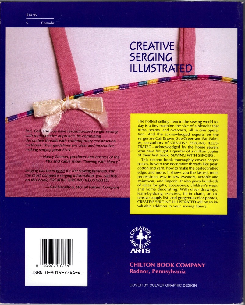 Item Description Chilton Book Company Creative Machine Arts ©1987 Pati Palmer, Gail Brown and Sue Green "Creative Serging Illustrated" Good Condition Pictures are taken by me of the actual item you are purchasing, not stock or stolen photos. Please review the pictures carefully! Domestic economy shipping via USPS is FREE! Purchase 3 or more of my 'FREE SHIPPING' needlework kits at one time using the E b a y 'Shopping Cart' feature and they ship via USPS Priority Mail for FREE! International Shipping: To Canada, The UK, France, Germany and Australia via USPS First-Class Package International service; Worldwide via USPS Priority Mail International Legal Flat Rate Envelope only, with charges based on location. Thanks for visiting Sew Many Stitches and Things! General Shipping & Handling Information I ship via USPS to your confirmed e B a y shipping address, and can accommodate other reasonable requests. I make every effort to ship the next business day after receiving cleared payment. Local pick up is allowed for most items and required for certain items. I do combine shipping where possible to save you money! If you are bidding on other of my auctions that end within a 3 day period, please let me know and I will send an invoice after the last auction has ended, including the combined shipping! International buyers are responsible for all taxes, duty and customs fees. Payments Payment is expected within 4 days unless prior arrangements have been made. If you are going to have difficulty making payment, PLEASE just contact me! I know things come up and am happy to work with my customers! I accept PayPal only. If you have questions or need additional information, ask BEFORE bidding and I will try to get the information for you as soon as possible. Feedback I will leave positive feedback for you when you pay in a timely manner. I will ship your item(s) quickly and would appreciate positive feedback after you receive your item. If for any reason you feel you cannot leave positive feedback and 5 star detailed seller ratings, please contact me first and give me an opportunity to make things right. Thank You! ****Allergy Alert**** I have a bird and rabbit in my non-smoking home.