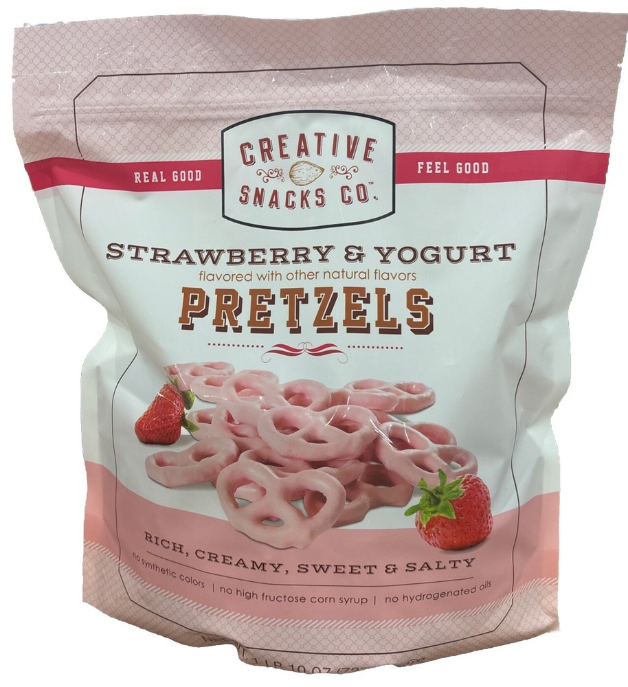 Creative Snacks Co offers a 26-ounce pack of Strawberry Yogurt Pretzels with an expiration date of 06/2025. Made in the United States, these pretzels are flavored with a delicious combination of strawberry and yogurt. The product is free from high fructose corn syrup, hydrogenated oils, synthetic colors, and contains 0g trans fat per serving. Each serving has 140 calories and the product is certified kosher. The packaging is a bag perfect for the pantry.