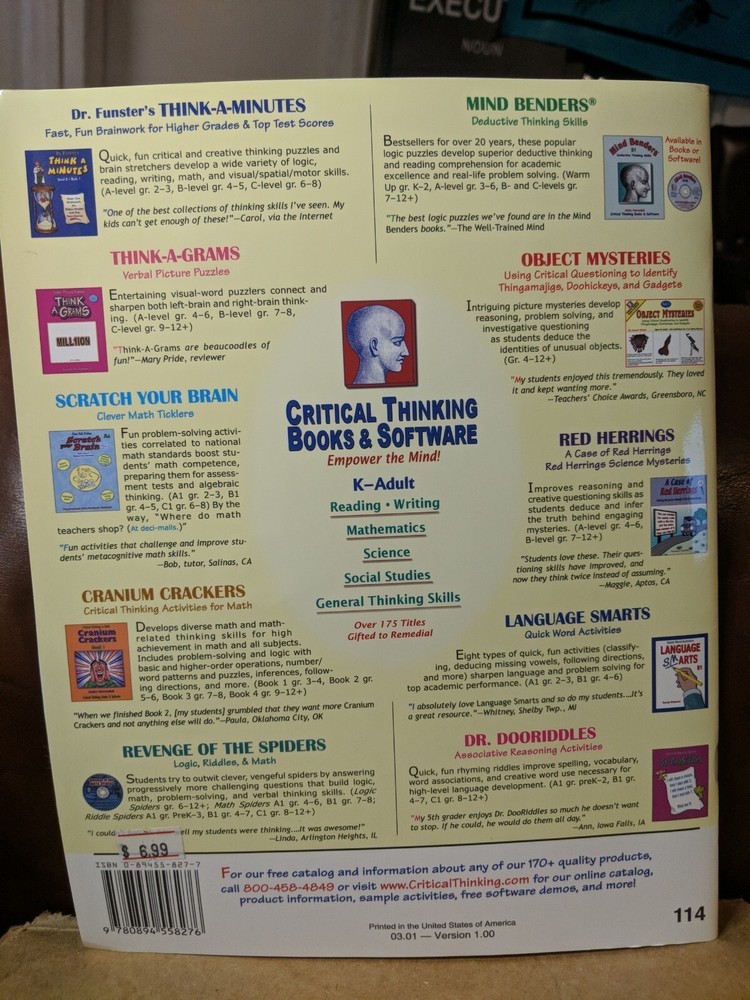 Love this book for sharpening kids' minds! The puzzles are clever and engaging, making problem-solving fun. Perfect for grades 6-8—my child looks forward to tackling each challenge. Great condition for a used book, with just minor wear. A steal for the price!