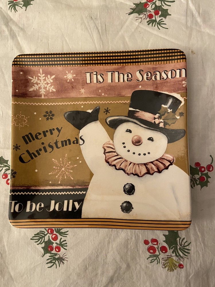 Creative co-op by Kimberly Poloson Pre Owned But in Excellent Shape Collectible 6 1/4 Inche Square Ceramic Glass Desert or Snack Plate. Features Snowman and Tis The Season To Be Jolly.