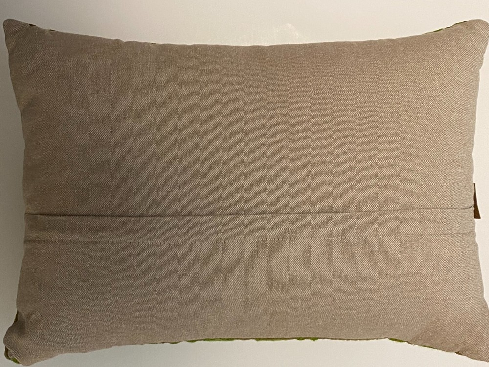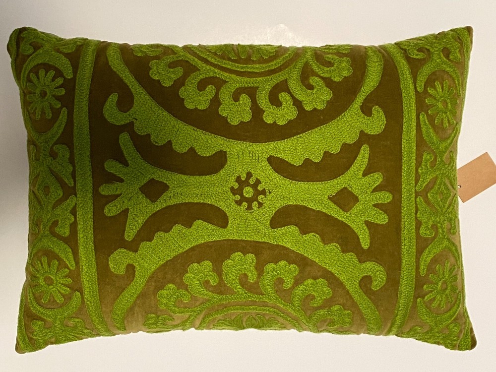 Creative co-op Throw Pillow- Made in India, Botanist Collection 20x14. Beautiful green embroidery of a soft, boho style graphic design on the front with tan cotton backing. Removable cover with zipper closure.