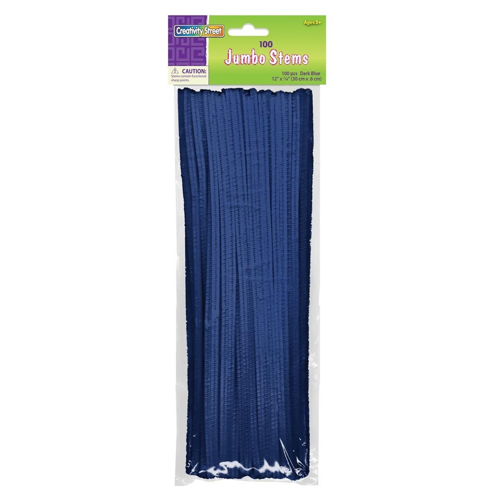 Also known as chenille stems or pipe cleaners, these stems are terrific for crafts. The hidden wire allows them to be twisted together easily, plus they can be glued onto surfaces. Also great for stringing beads. Jumbo stems are 12" long and 1/4" wide. 100 stems per package. Dark blue. Check out this art project made with stems: Easy Beginner Baskets