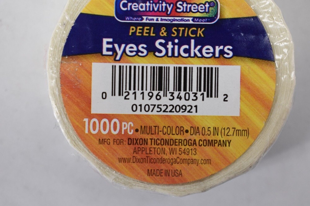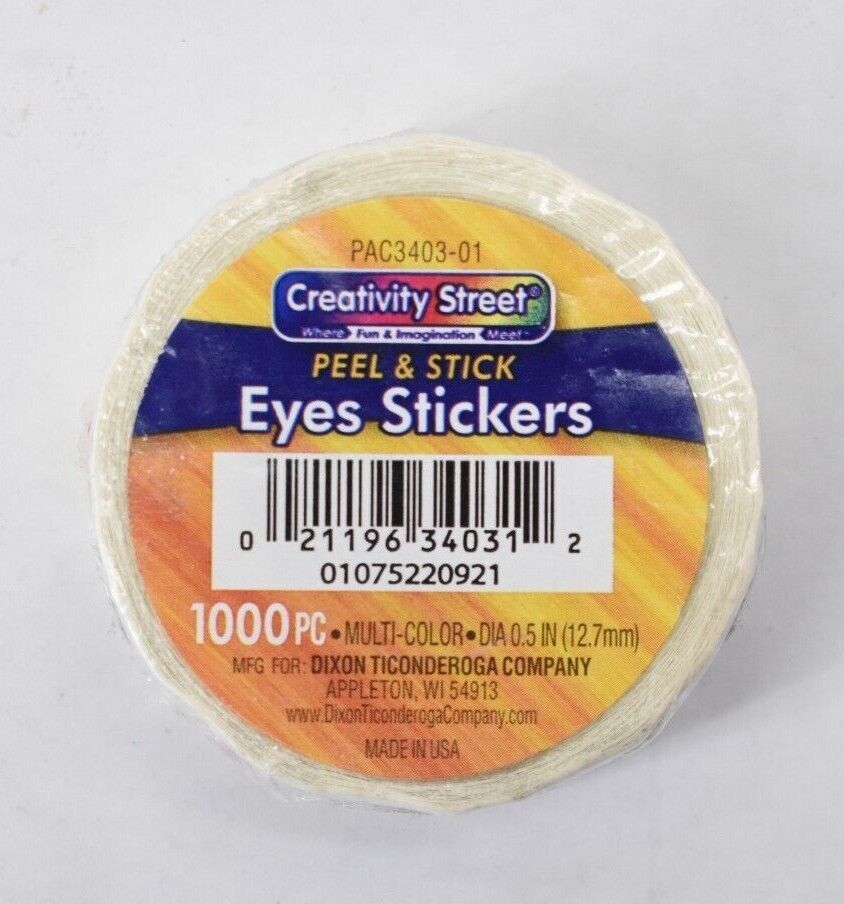 Creativity Street Peel & Stick Wiggle Eyes 1/2" Stickers 1000-Piece Multi-Color 1000 piece eye stickers. Why Shop with US? Customer Service is our #1 Priority Excellent Pricing Excellent Feedback Quality Assurance Fast Shipping Feedback If you are completely satisfied with your purchase please leave us positive feedback. If there is an issue with your order, please understand we are human and we do make mistakes. Please send us a message and give us a chance to resolve before returning or opening a dispute with eBay. Shipping Policy We will ship almost all items within 1 business day. All items ship from Kansas City KS and take 2-5 days depending on shipping service. On rare occasion, USPS or FedEx may delay a package. Please understand this is out of our control. If you order/pay before 12 PM CST we will try our best to get your package out same day. If you would like an express delivery option, please message us before purchasing, we can update the listing to reflect an express option. (Additional Shipping charges will apply) Disclaimer BI-STATE Deals is not sponsored by or affiliated with the brands associated with the products being sold. Furthermore, there is no guarantee or assumption that we can provide support or offer any warranty on this product after purchase. Bi-State Deals Copyright © Bi-State Deals Listing and template services provided by inkFrog