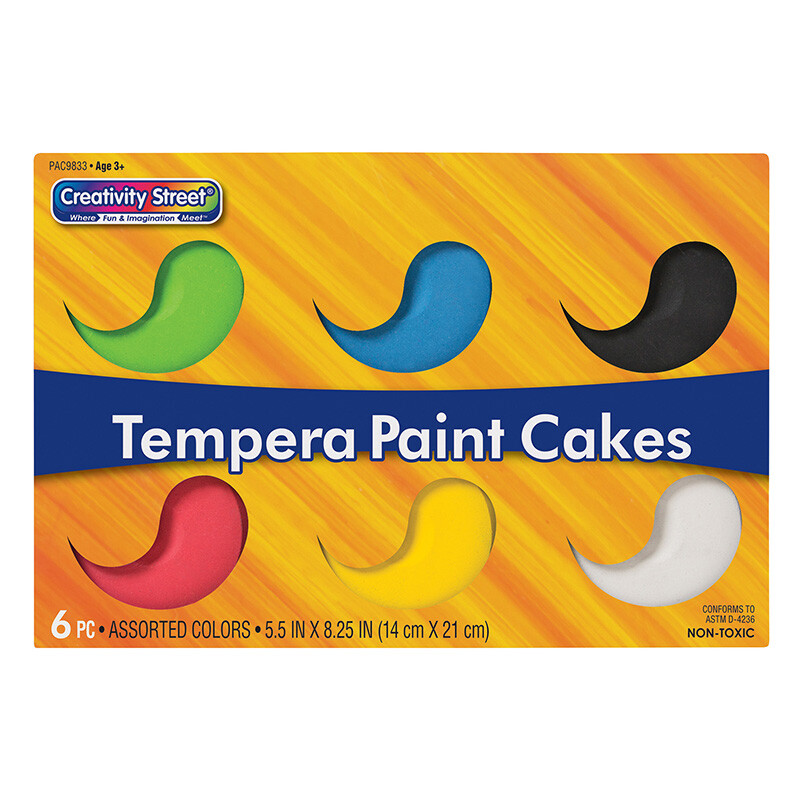Features: Tempera cakes are an economical source of brilliant, opaque, non-toxic tempera paint When colors are mixed directly on the blocks, simply rinse with water for a fresh new surface of pure color Non-toxic Each tempera block is 2-1/4" in diameter and 3/4" thick Creativity Street(r) Tempera cakes are an economical source of brilliant, opaque, non-toxic tempera paint. Just wet with water. For a bright velvet texture, brush on any surface - even glass. No more messy spills! When colors are mixed directly on the blocks, simply rinse with water for a fresh new surface of pure color. Each tempera block is 2-1/4" in diameter and 3/4" thick. One tempera block will cover more than 16 ounces of liquid tempera. Each set includes 6 tempera cakes: Red, Yellow, Blue, Green, White and Black.