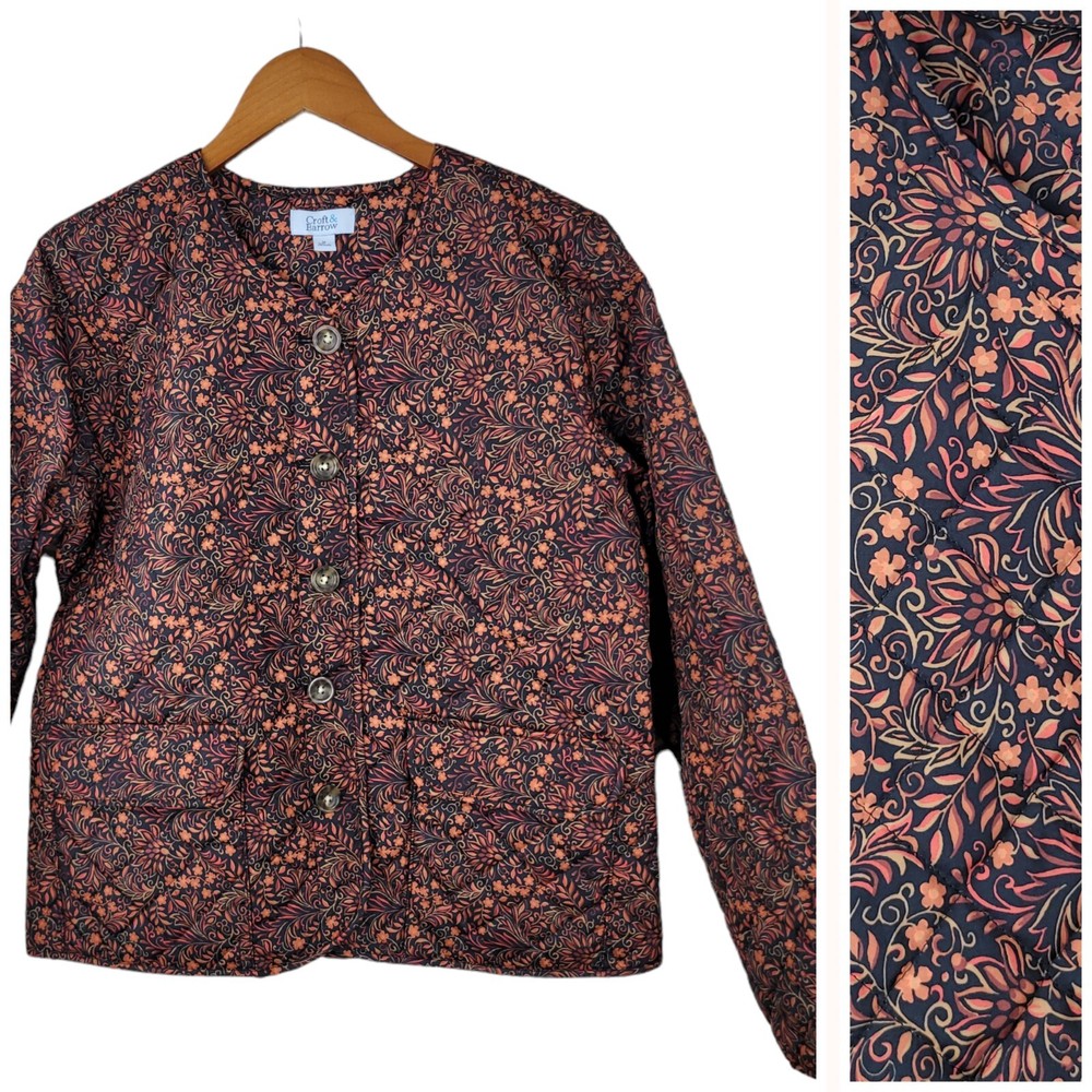 Croft Barrow Quilted Jacket Coat Size Medium Mid-weight Button Up Floral Orange This coat is in excellent condition It measures approximately 21.5" from armpit to armpit and 25" from shoulder to hem...