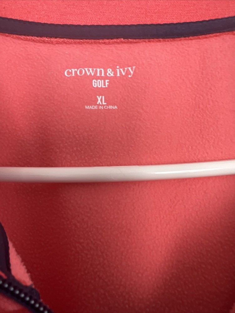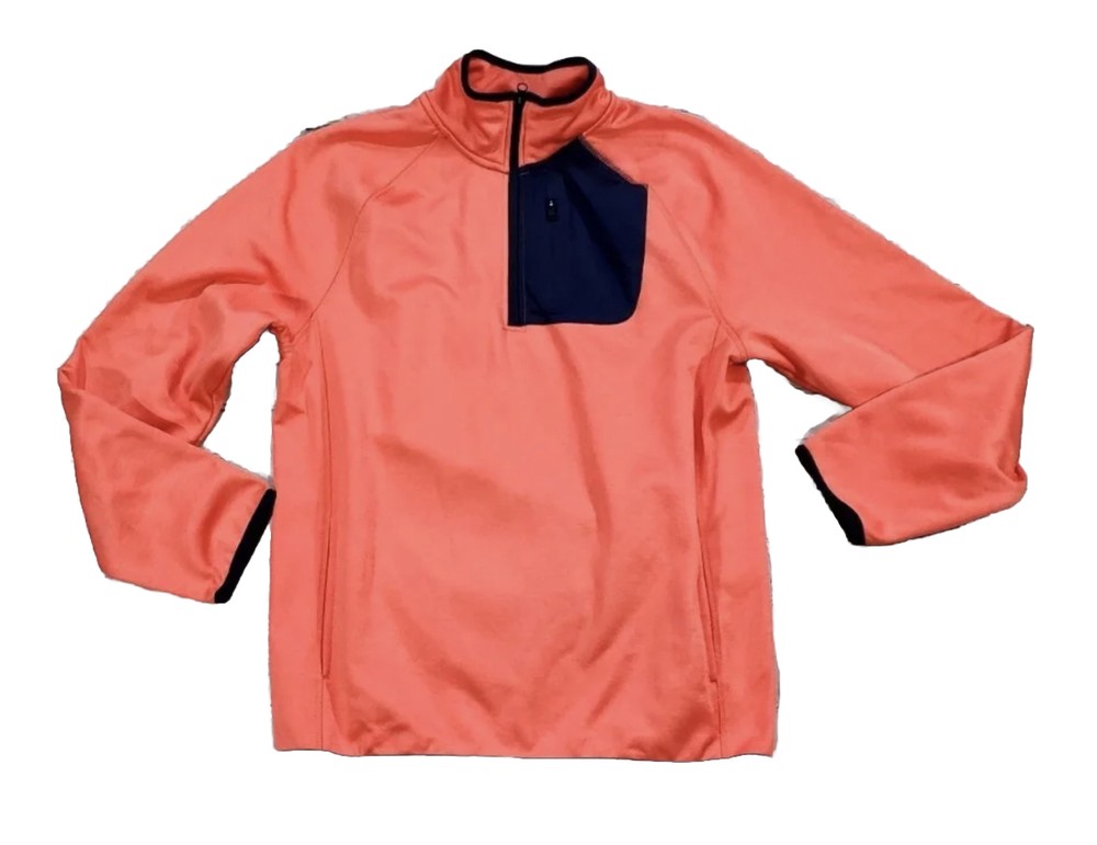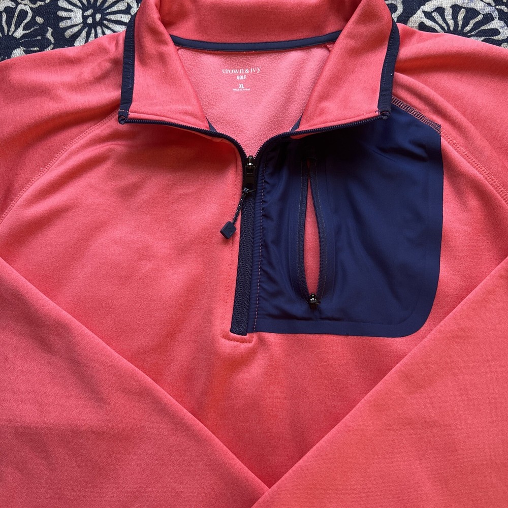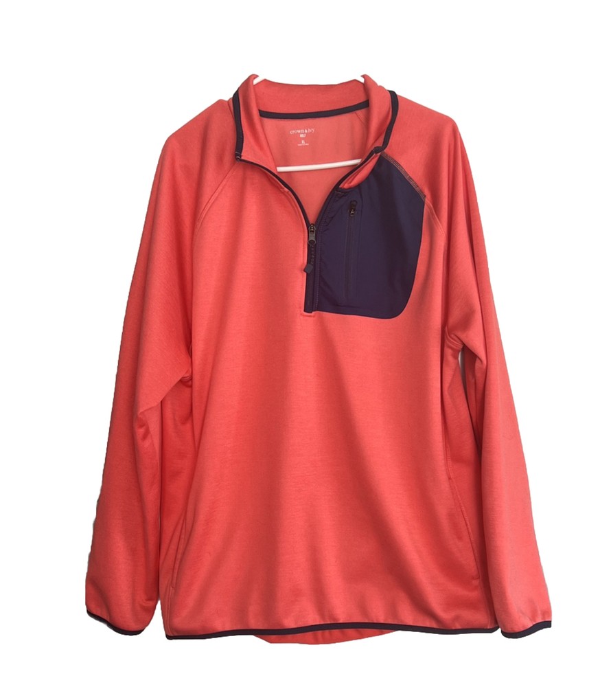 Crown & Ivy Men's Pullover 1/4 Zip Golf Jacket. This mid-length jacket features a coral orange color with navy blue pocket and trim accents, making it perfect for casual occasions. The jacket is made of polyester and comes with a straight collar style, kangaroo and chest pockets, and a soft fleece interior, providing breathability and comfort in regular fit, and is available in XL size, and is machine washable. Ideal for golf enthusiasts, the jacket is perfect for fall, winter, and spring seasons. No damage or defects. See photo for measurements and thanks for looking. C