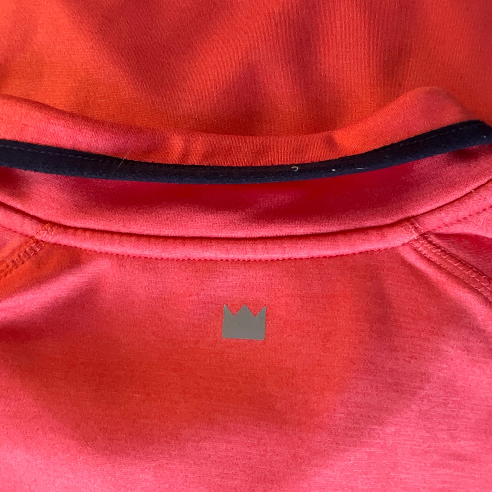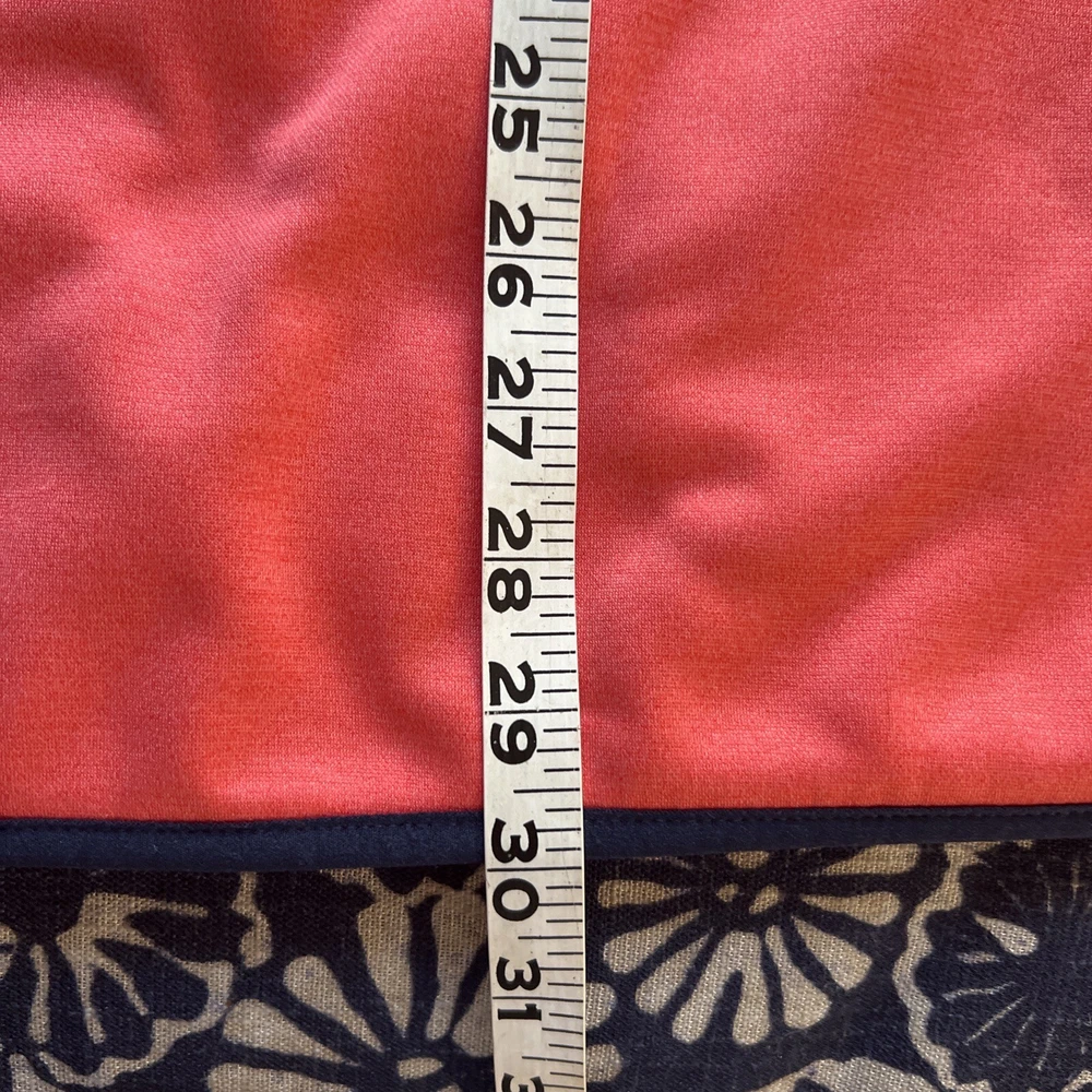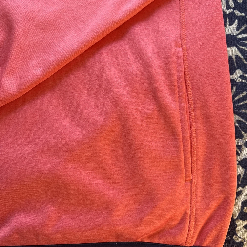 Crown & Ivy Men's Pullover 1/4 Zip Golf Jacket. This mid-length jacket features a coral orange color with navy blue pocket and trim accents, making it perfect for casual occasions. The jacket is made of polyester and comes with a straight collar style, kangaroo and chest pockets, and a soft fleece interior, providing breathability and comfort in regular fit, and is available in XL size, and is machine washable. Ideal for golf enthusiasts, the jacket is perfect for fall, winter, and spring seasons. No damage or defects. See photo for measurements and thanks for looking. C