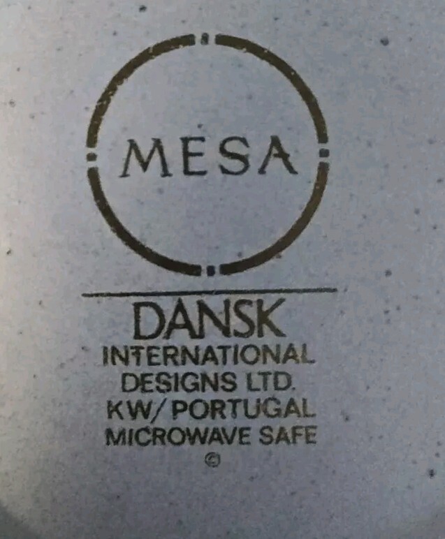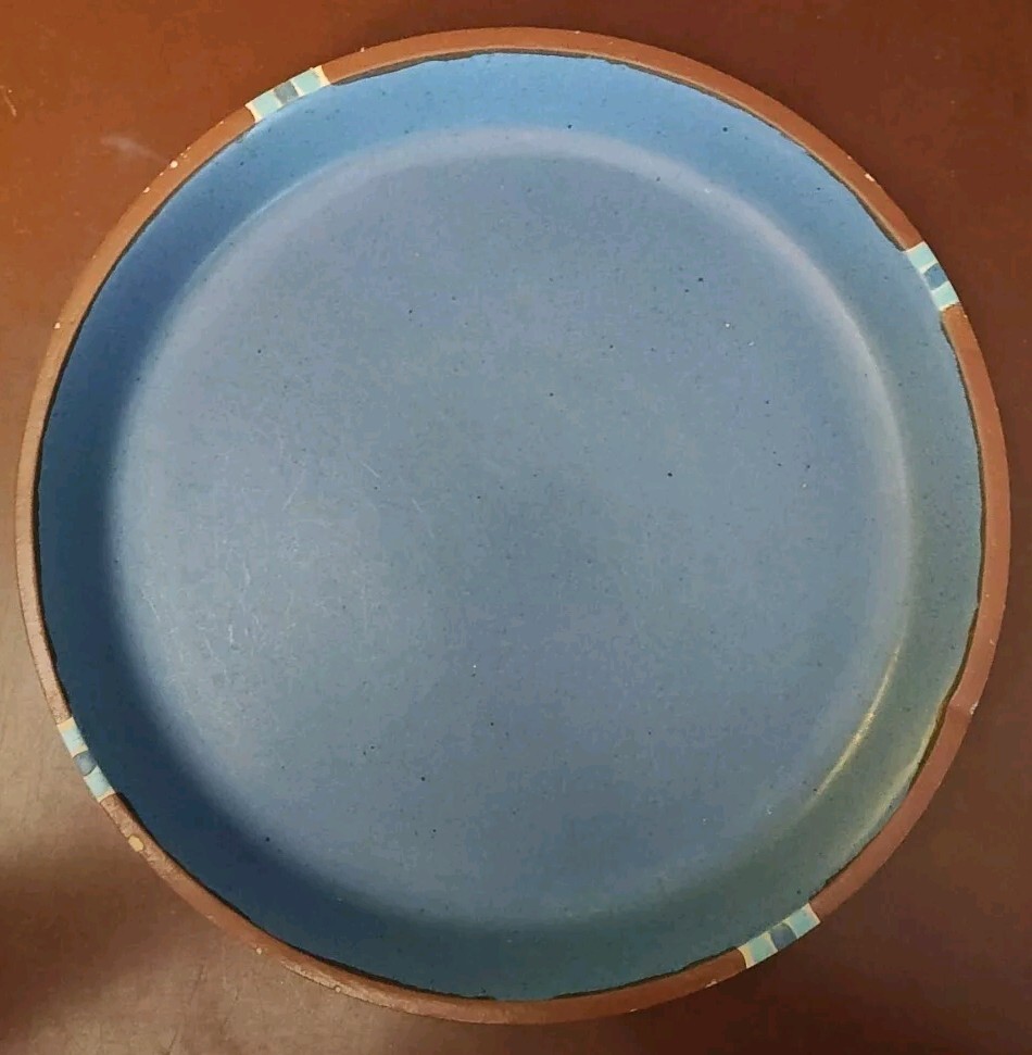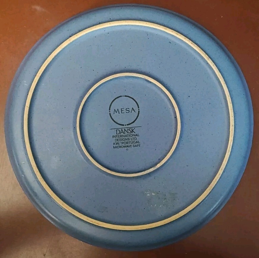 This DANSK Mesa dinner plate features a round shape with a diameter of 10.5 inches, made of sky blue stoneware in a southwest theme. Produced in Portugal in the 1990s, it showcases a matte finish and a printed backstamp. While not vintage, the plate shows signs of wear with some chips, as depicted in the provided pictures. Perfect for all occasions, this dinner plate is a part of the Mesa product line by Dansk, known for its earthy and rustic design inspired by the southwest aesthetic.
