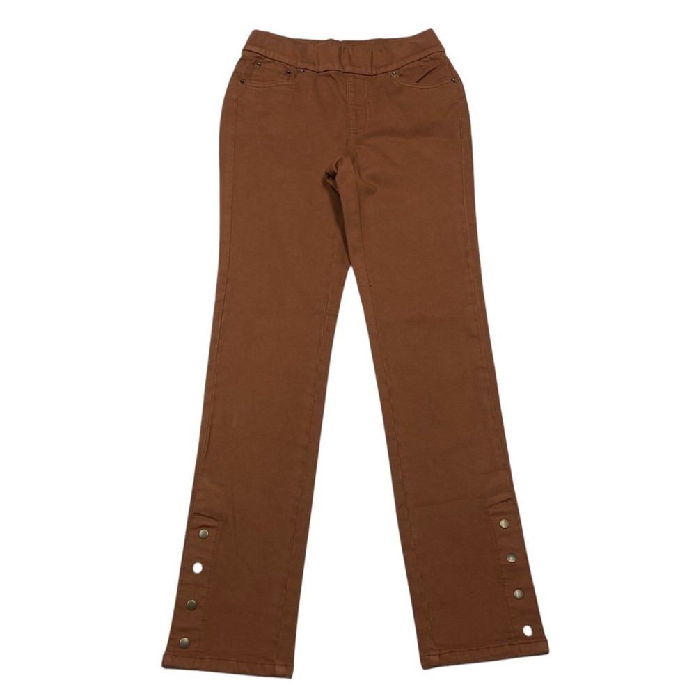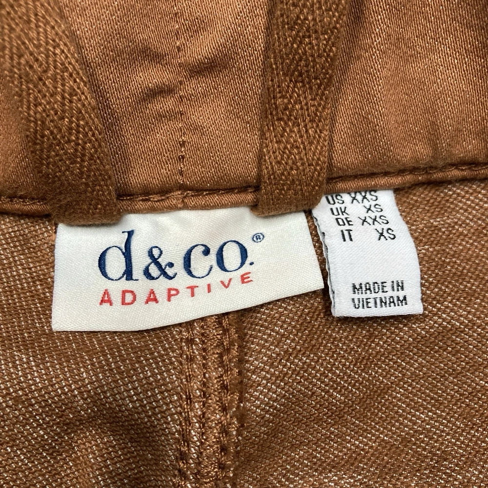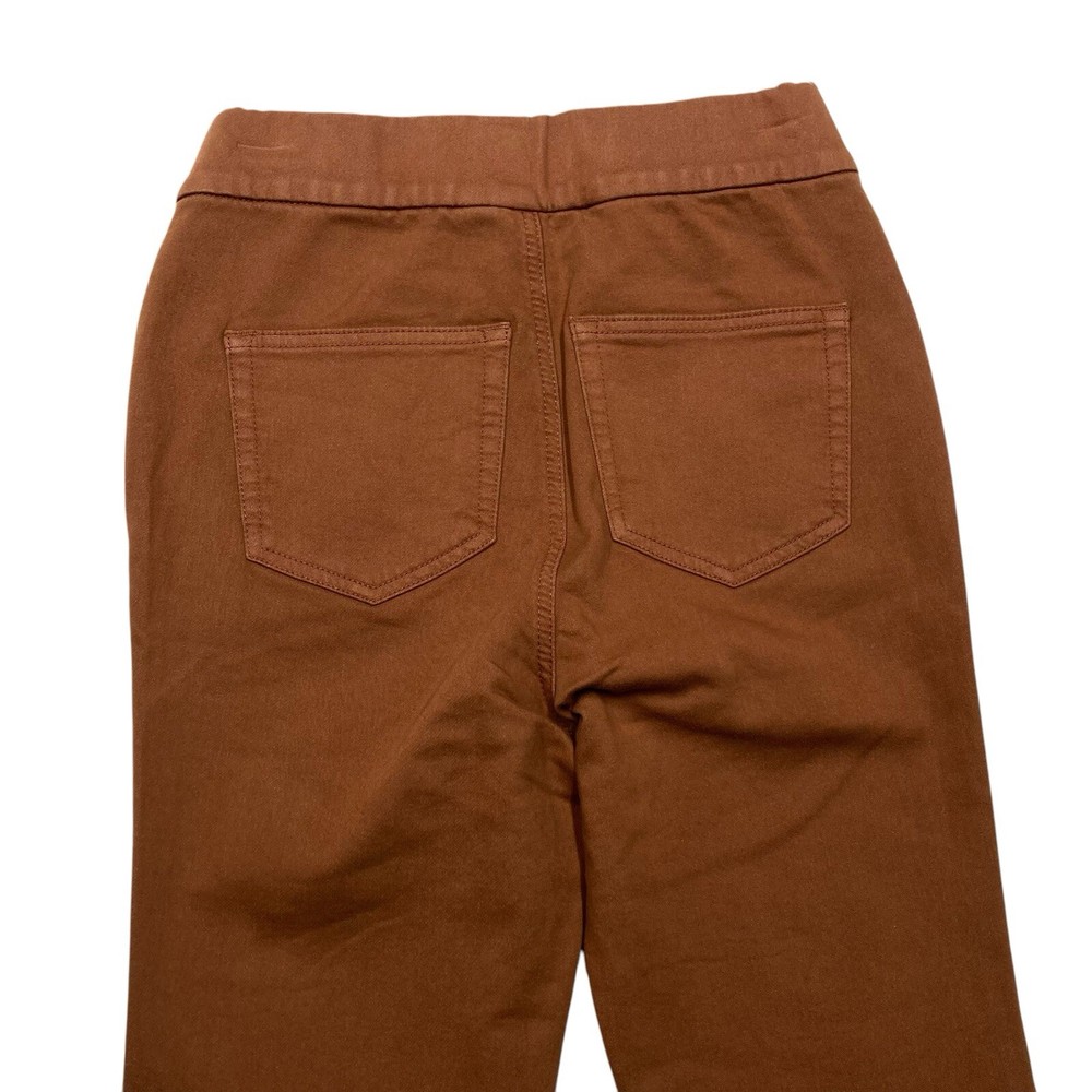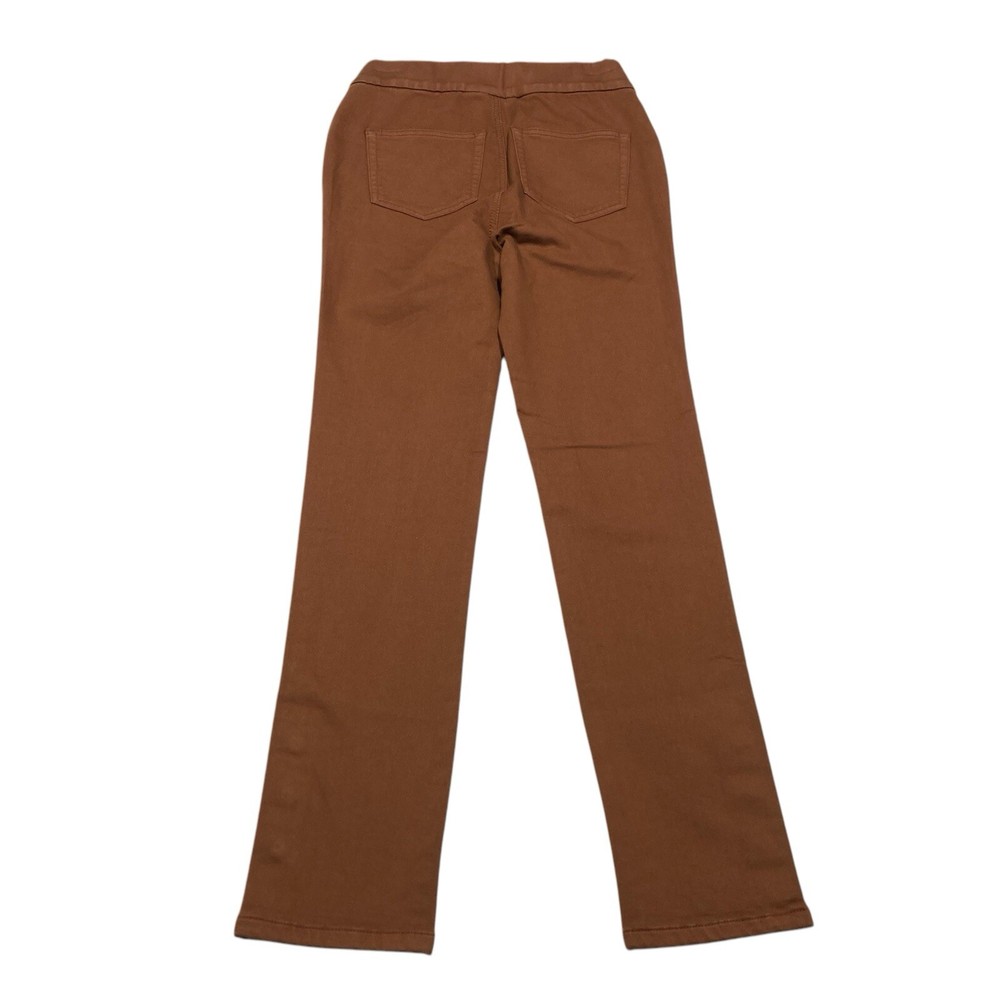 These Denim & Co. jeans are designed for women in size XXS with a rustic orange color. They feature a solid pattern, mid-rise fit, and elastic waist for easy pull-on styling. The jeans have a straight leg style, 5-pocket design, and are made of a cotton blend material. Perfect for winter, summer, fall, and spring seasons.