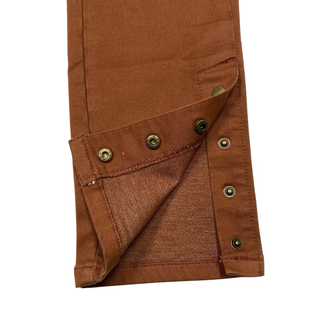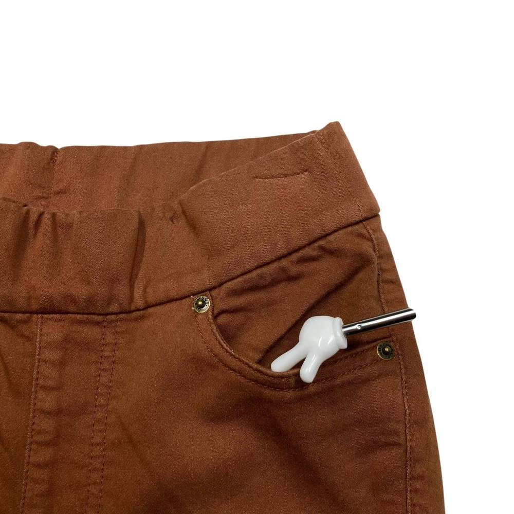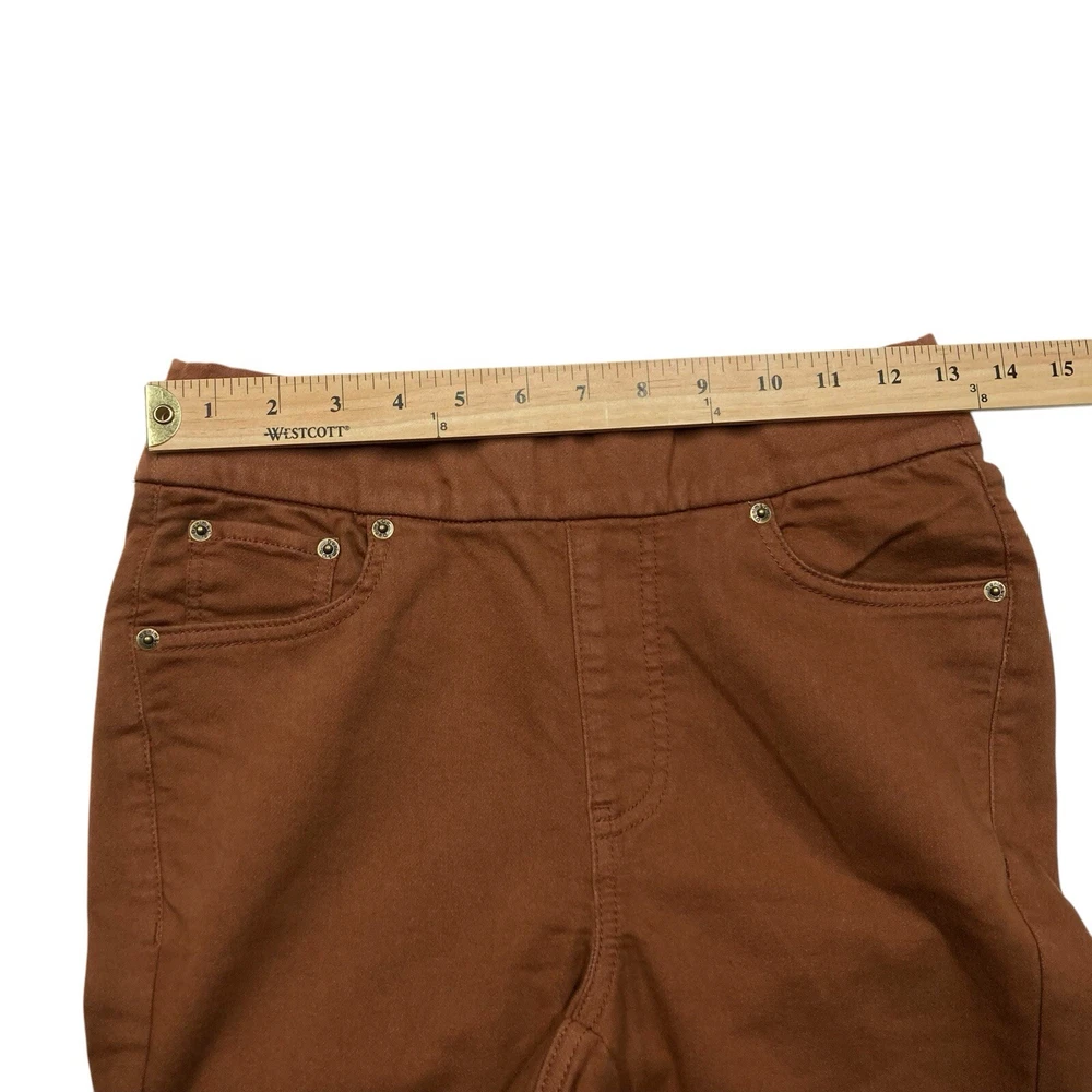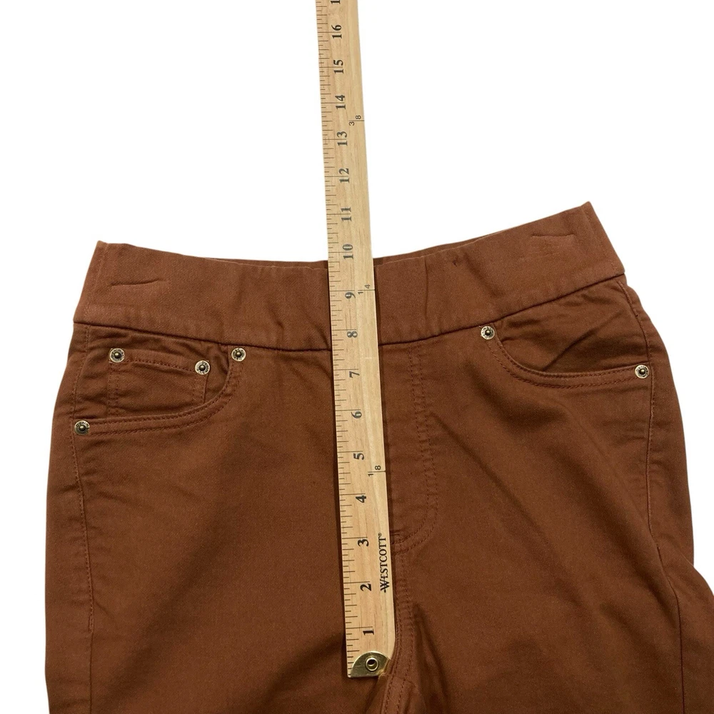 These Denim & Co. jeans are designed for women in size XXS with a rustic orange color. They feature a solid pattern, mid-rise fit, and elastic waist for easy pull-on styling. The jeans have a straight leg style, 5-pocket design, and are made of a cotton blend material. Perfect for winter, summer, fall, and spring seasons.