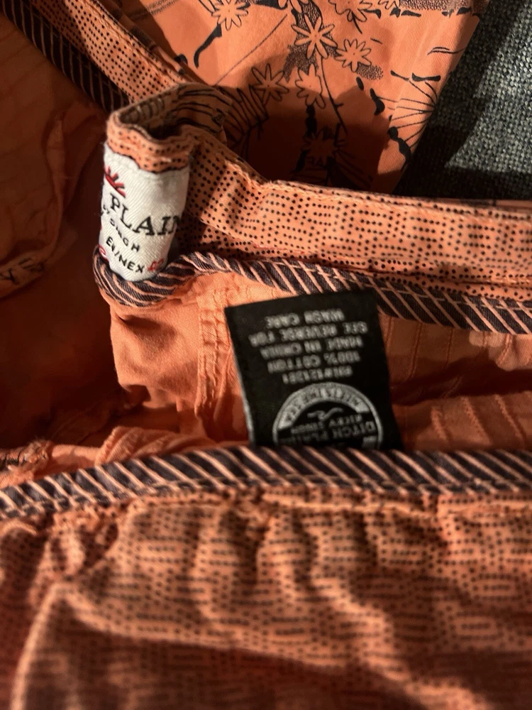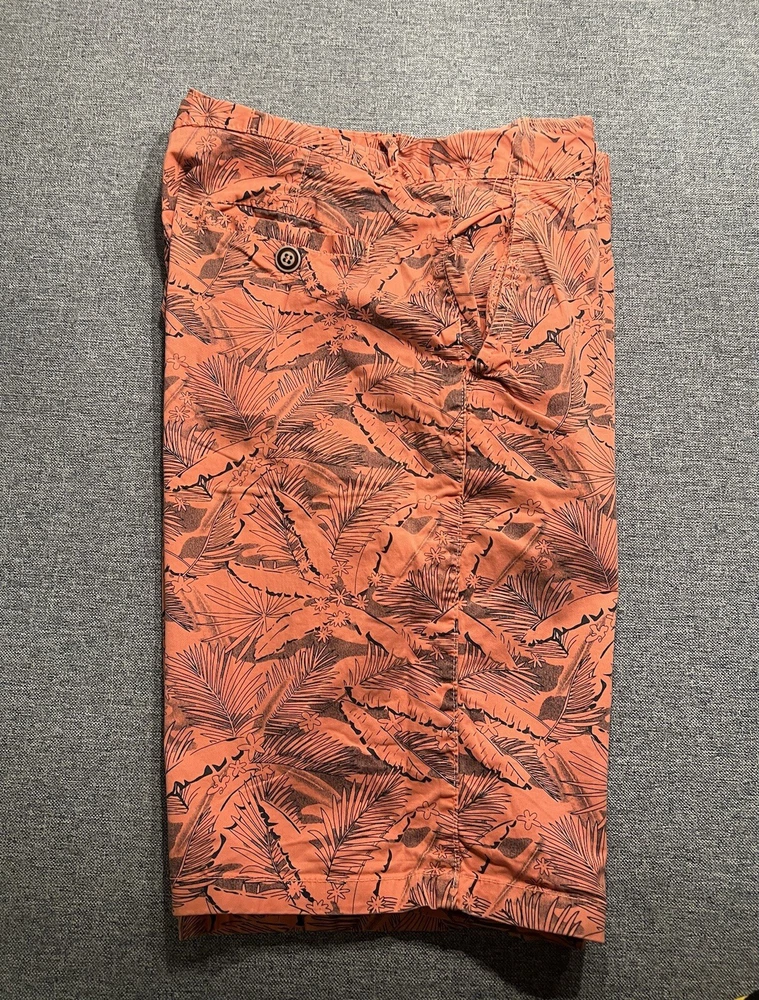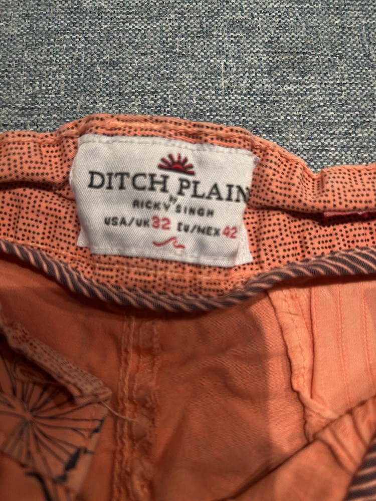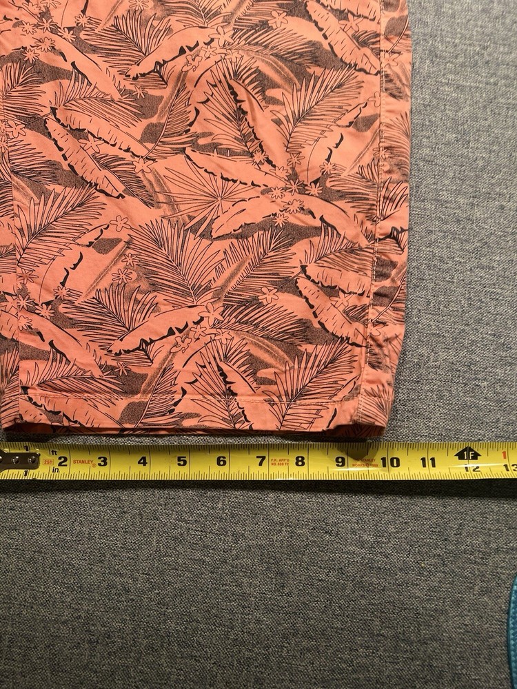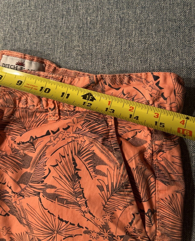 Elevate your summer wardrobe with these stylish Ditch Plains by Ricky Singh chino shorts in a vibrant orange color with a tropical leaf print. These flat-front shorts feature a zip closure, slash pockets, and belt loops with a comfortable mid-rise fit. The cotton twill material provides a stretchy and breathable wear, making them perfect for casual occasions in the summer, fall, or spring. The shorts are machine washable, and the waist size is 32 inches with a regular fit and mid-inseam of 11 inches. The classic design and timeless theme make these shorts a must-have for any fashion-conscious man. Made in China, these shorts are perfect for those who appreciate high-quality and stylish clothing. Needs a button. See pics