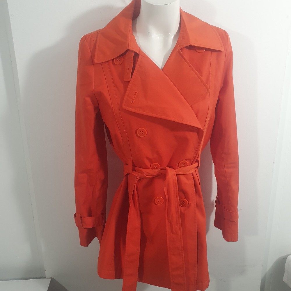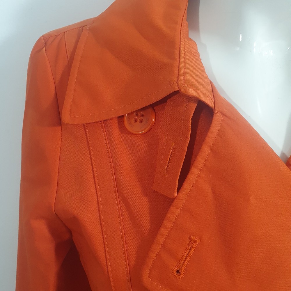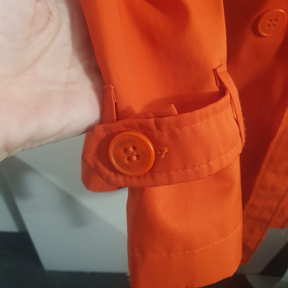 Love this vibrant orange trench—perfect for adding a pop of color to any outfit! The mid-length fit is flattering, and the cotton blend fabric feels sturdy yet comfortable. Great for layering over workwear or dressing up casual looks. The classic DKNY style shines, and even though the pocket lining needs a quick fix, it’s a steal for the price. Super versatile and eye-catching!
