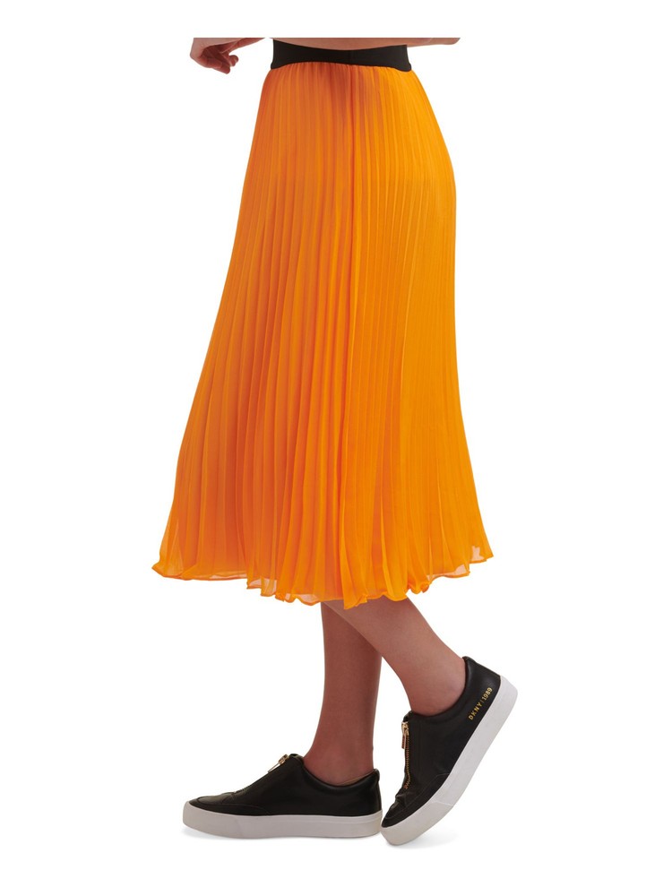 This DKNY skirt is a stylish and flattering midi with beautiful accordion pleats. The orange color is vibrant, and the stretchy polyester makes it comfortable to wear. Though it has a minor discoloration, it's barely noticeable and a great deal for the price. Perfect for casual outings, it drapes elegantly and feels lightweight. Love the semi-sheer lined detail—adds a chic touch! Dry clean only, but totally worth it for the designer look.