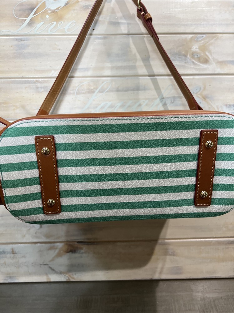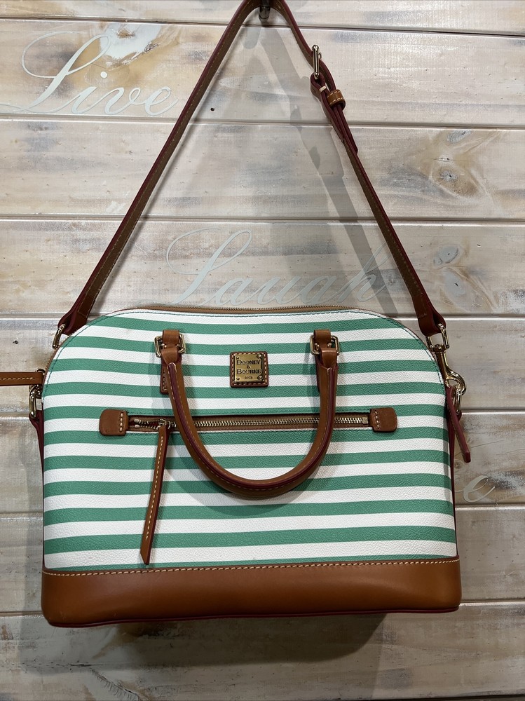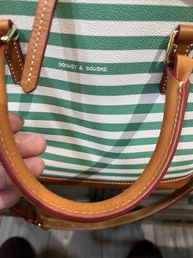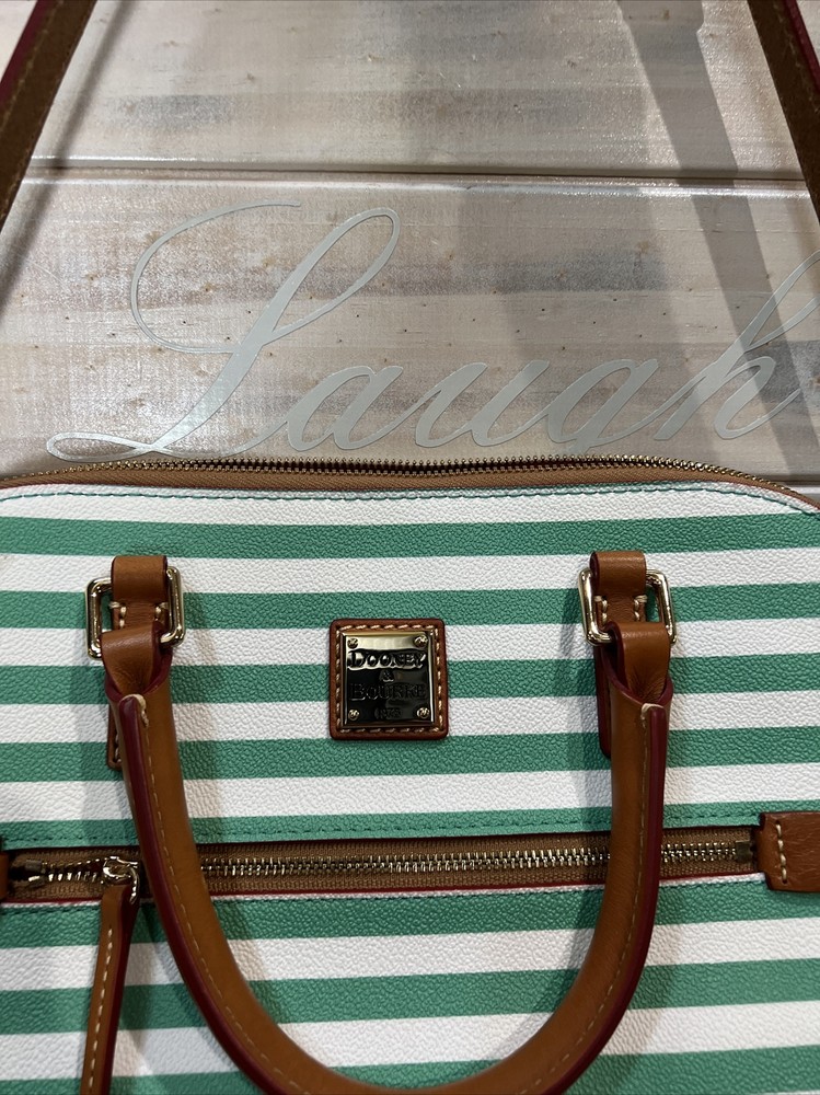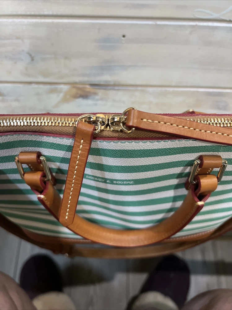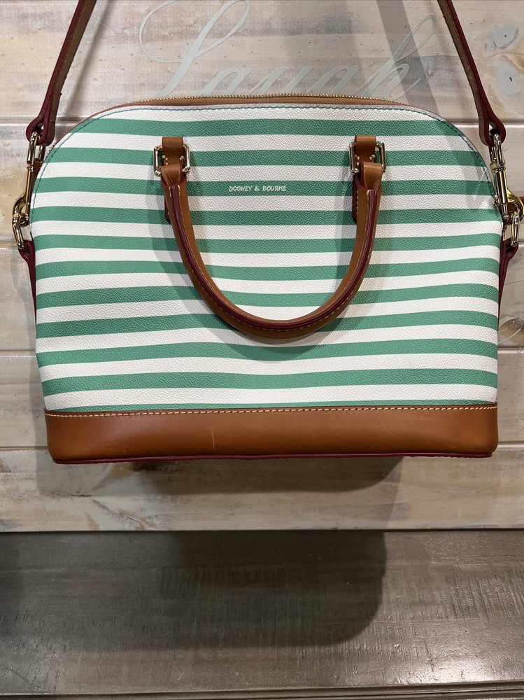 DOONEY & BOURKE SULLIVAN DOMED ZIP ZIP green/ white SATCHEL. Used one time in great condition. Doubles zipper top with zipper pocket on front , inside zipper pocket with slip pockets also key keeper . Double handles with shoulder strap . Size is 13 “ x 9” x 5” handle drop 5” strap drop up to 11 inches . Footed feet .