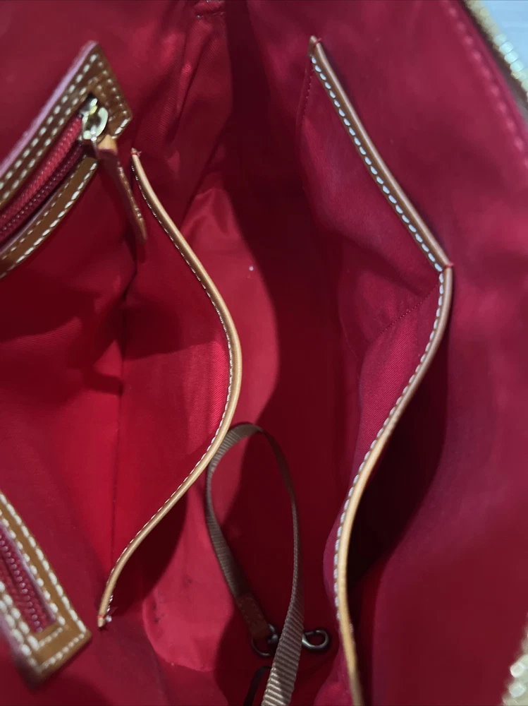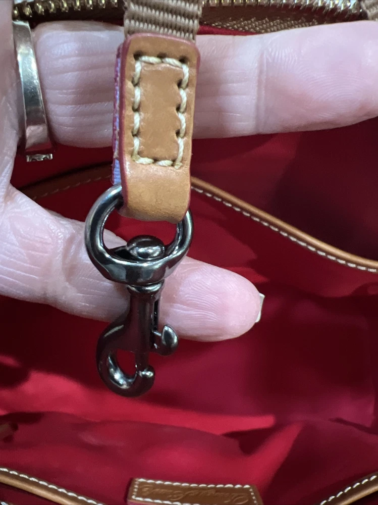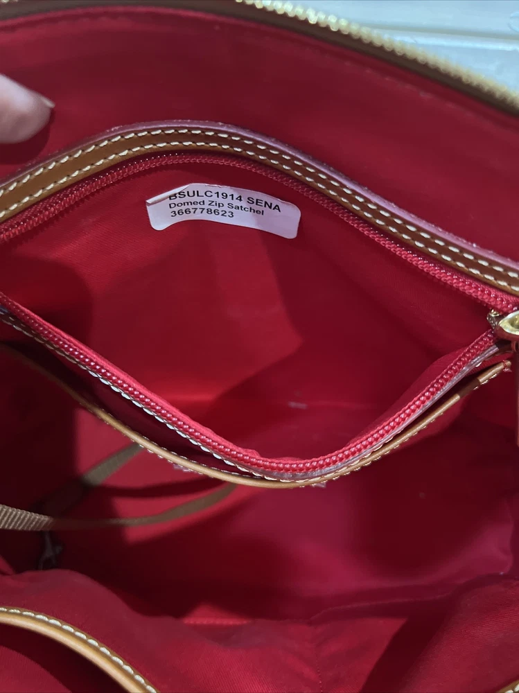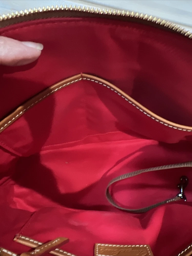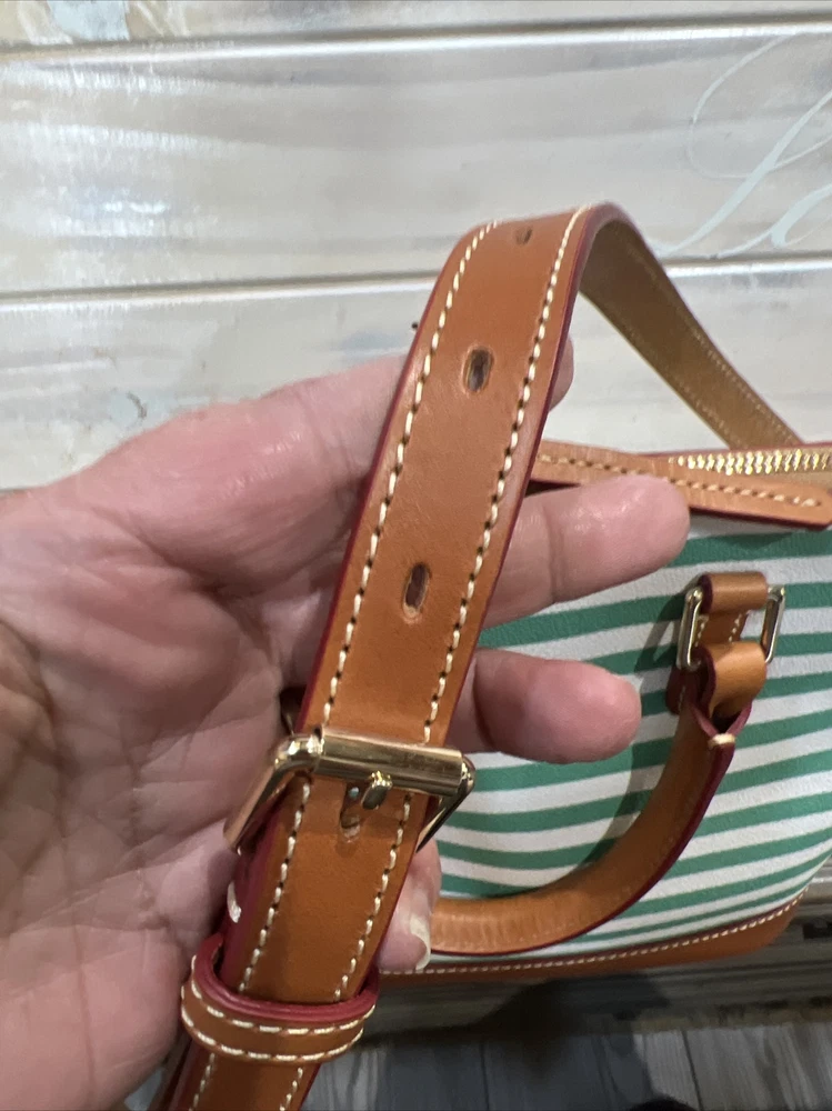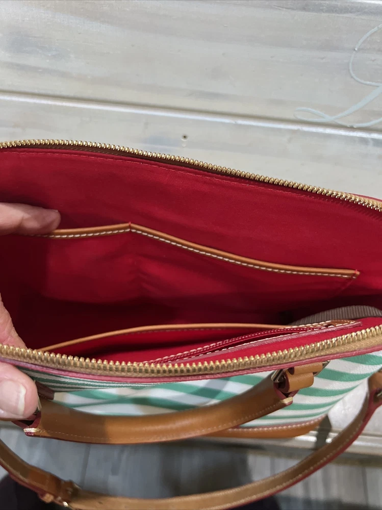 DOONEY & BOURKE SULLIVAN DOMED ZIP ZIP green/ white SATCHEL. Used one time in great condition. Doubles zipper top with zipper pocket on front , inside zipper pocket with slip pockets also key keeper . Double handles with shoulder strap . Size is 13 “ x 9” x 5” handle drop 5” strap drop up to 11 inches . Footed feet .