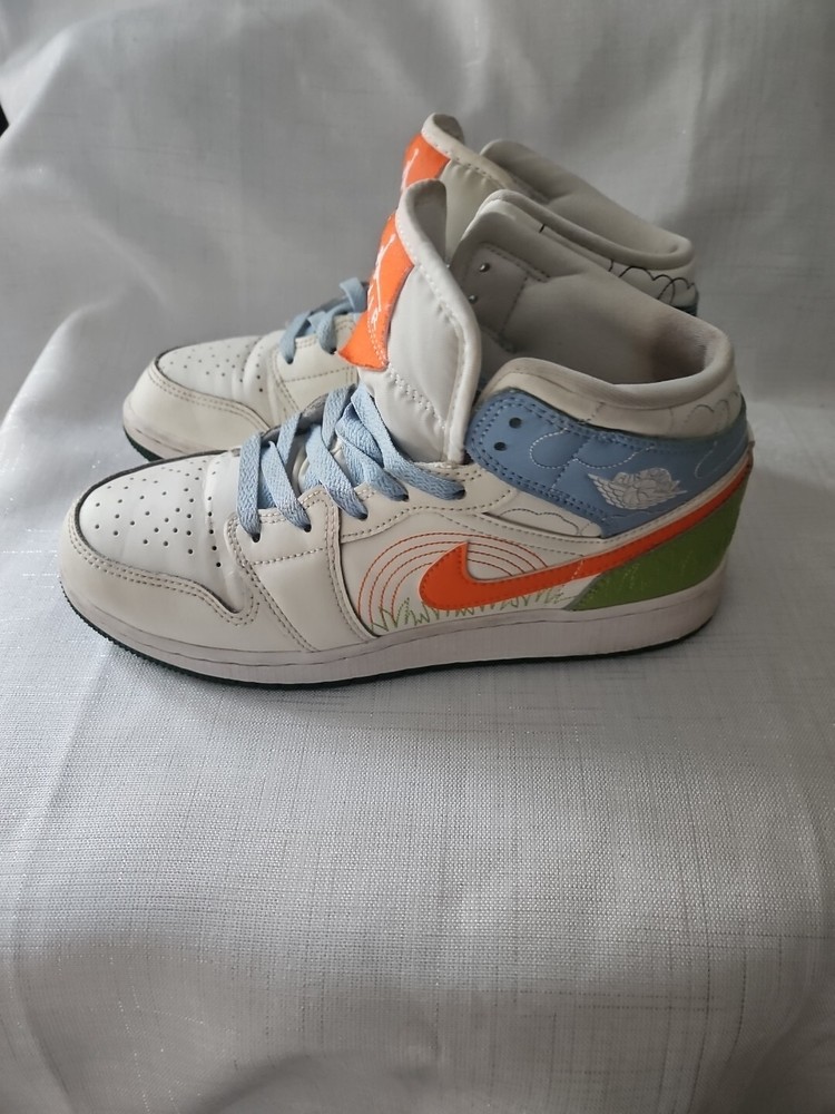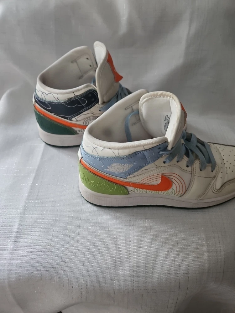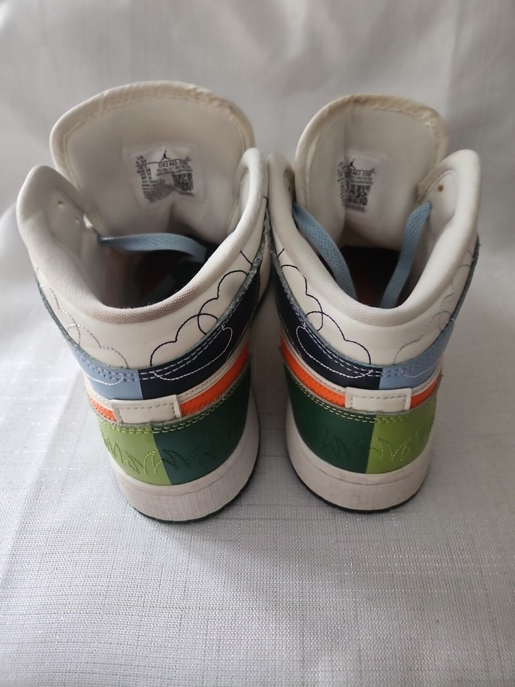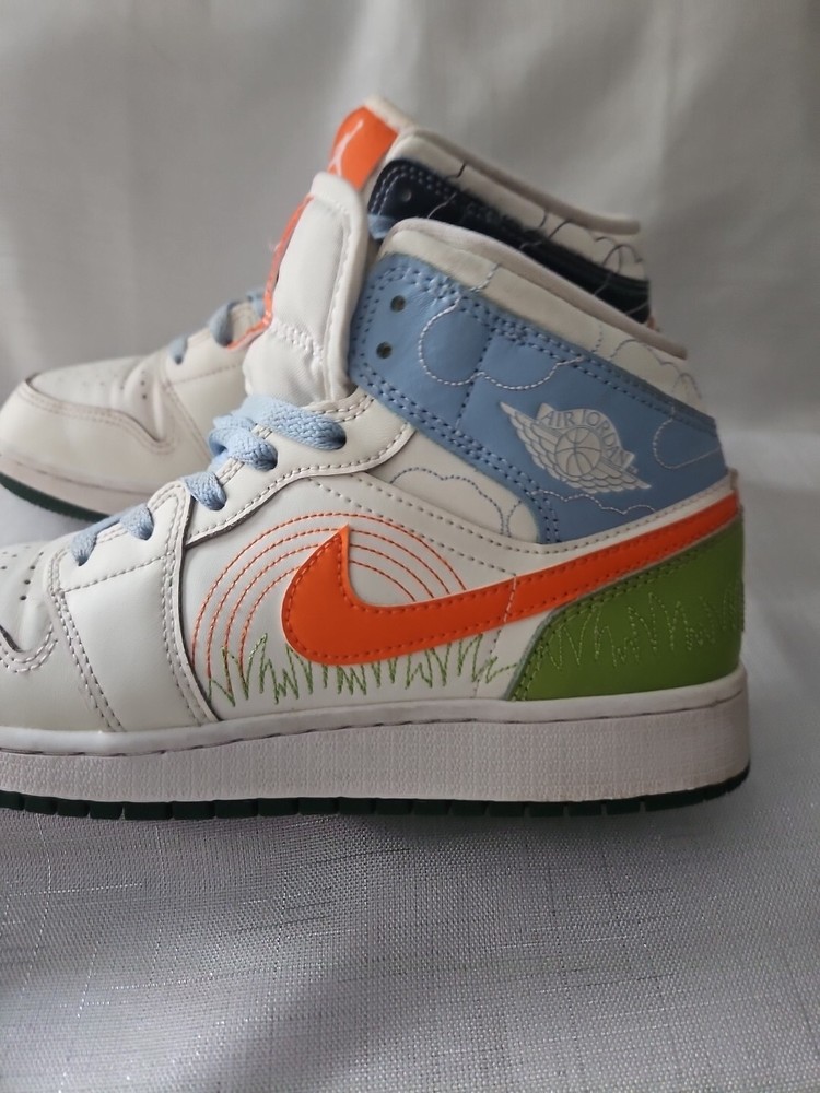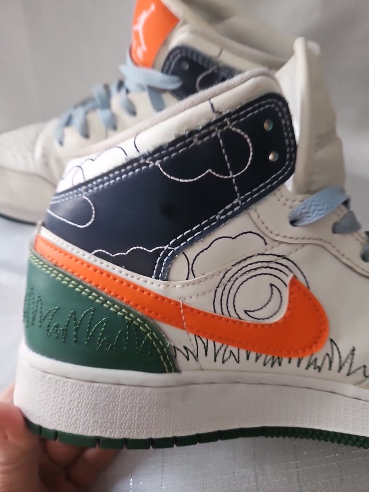 The Air Jordan 1 Mid SE GS ‘Stitch’ showcases a playful, summery motif tailor-made for big kids in size 5.5 Y. The off-white leather upper is accented with a Safety Orange Swoosh and outdoor-inspired embroidery. The stitched lines depict cloudy skies and grassy grounds, along with a radiant sun on the lateral side and a crescent moon on the opposite side. Continuing the day-and-night theme, split coloring is applied to the heel and collar overlay, featuring light and dark shades of green and blue. The multicolor design is offset by a crisp white midsole, enhanced with an Air-sole heel unit encapsulated in a lightweight foam wedge.