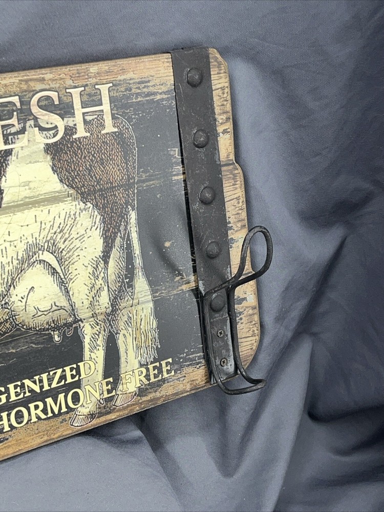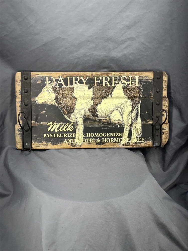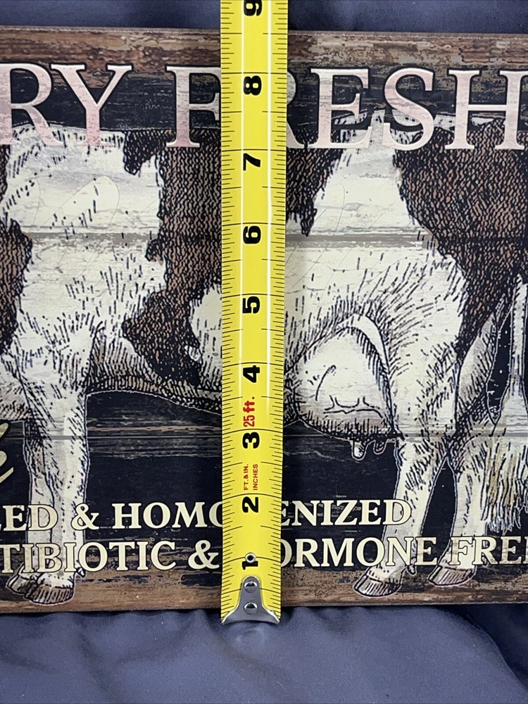 This charming rectangular sign from Creative Co-Op is perfect for any room in your home. Featuring a cute cow design, the sign is made of wood and metal and has a rusted look that adds a touch of farmhouse style to your decor. Measuring 17 inches in length and 8.5 inches in height, the sign is medium-sized and can be hung or wall mounted. The Dairy Fresh Milk Pasteurized Homogenized Antibiotic and Hormone Free Sign is ideal for those who love farm life and want to add a touch of personality to their home. It's ready to hang and comes with all the necessary features for easy display. This sign is a must-have for anyone who wants to add a bit of charm to their living space.