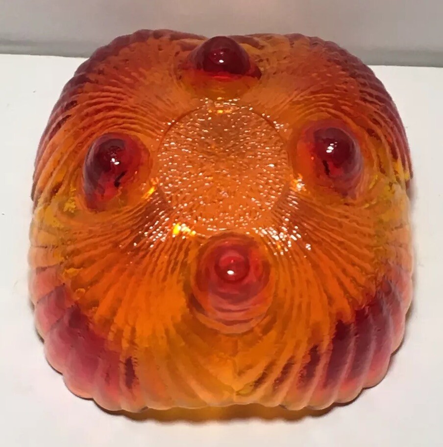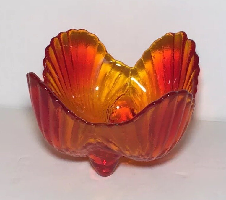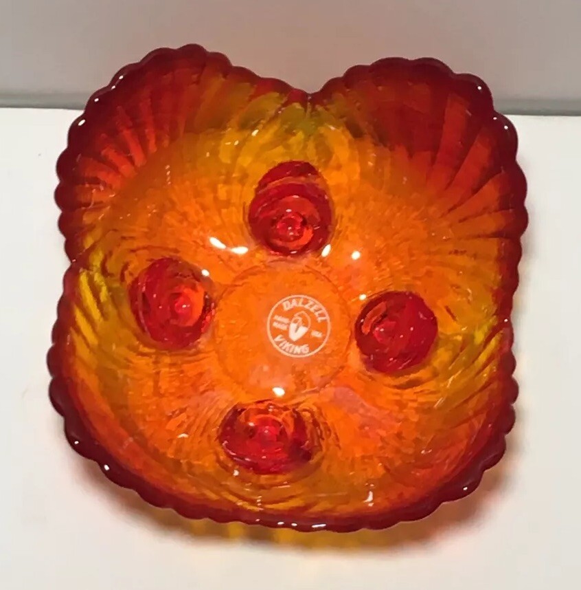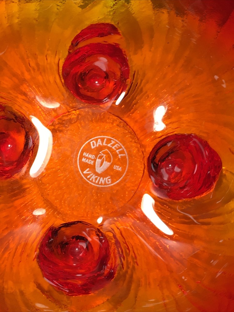 Add a touch of Mid-Century Modern to your decor with this beautiful handmade glass dish from VIKING. The dish features a glossy finish and an all-over orange color, with a unique curvy shape that is sure to catch the eye. This original piece of art glass has one compartment and is perfect for serving shells or other small decorative items. Crafted in the United States in the 1950s using hand blown glass techniques, this vintage dish is a true original. The backstamp is impressed and the product line is Century. The dish is perfect for collectors of retro/vintage items and lovers of Mid-Century Modern style.