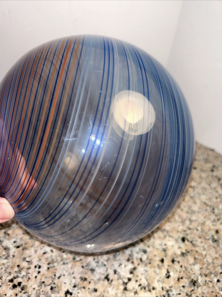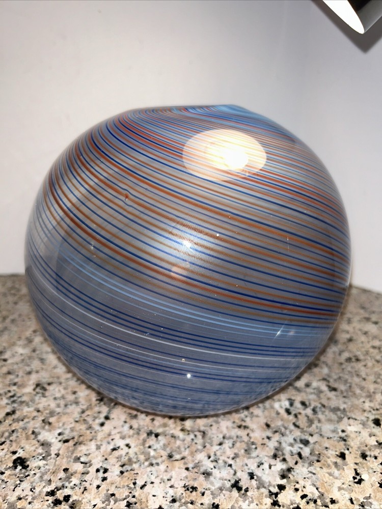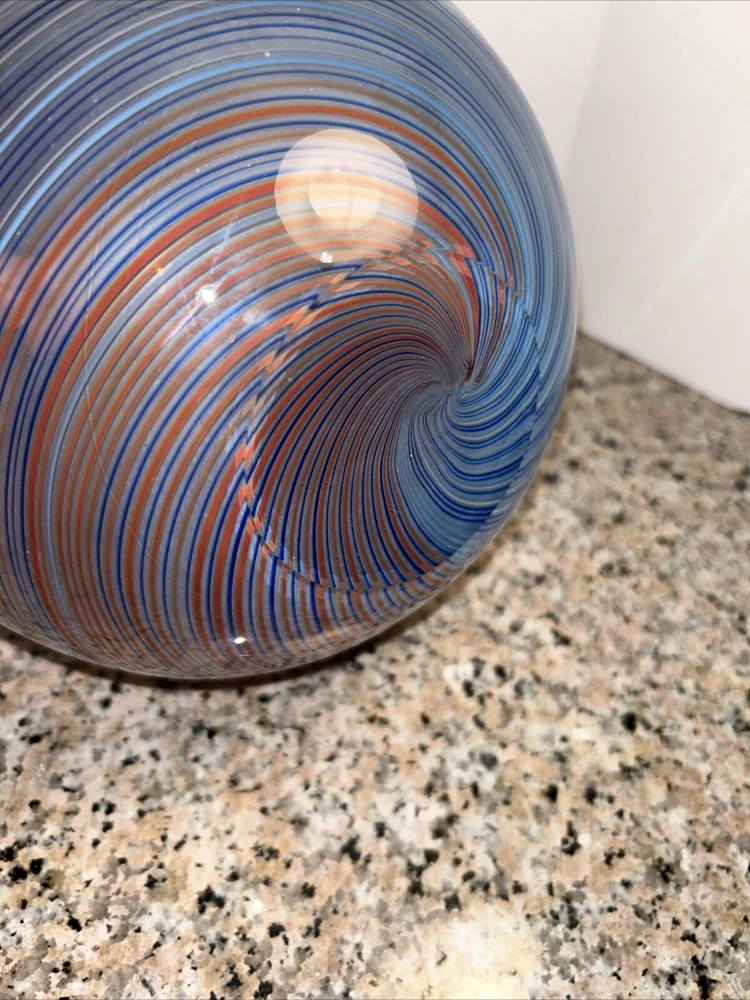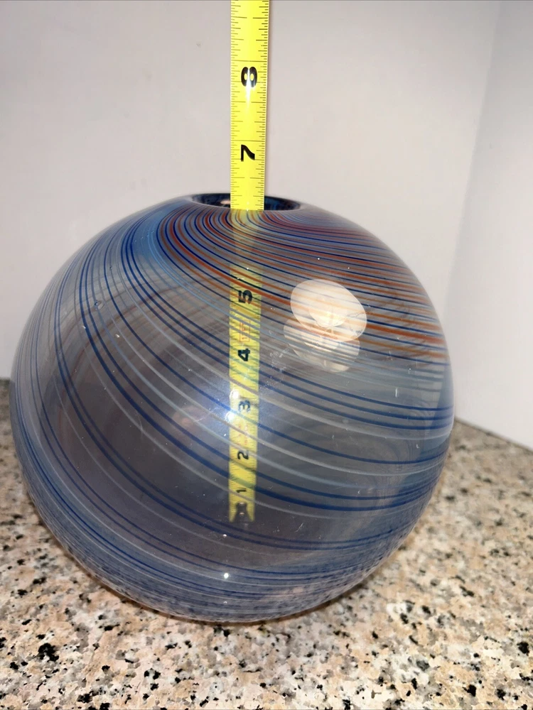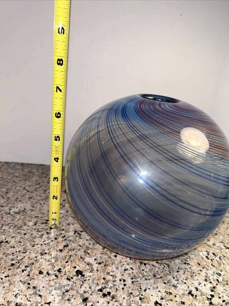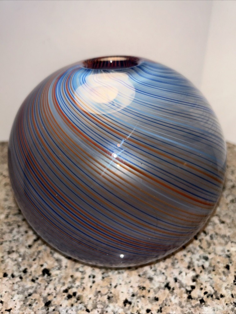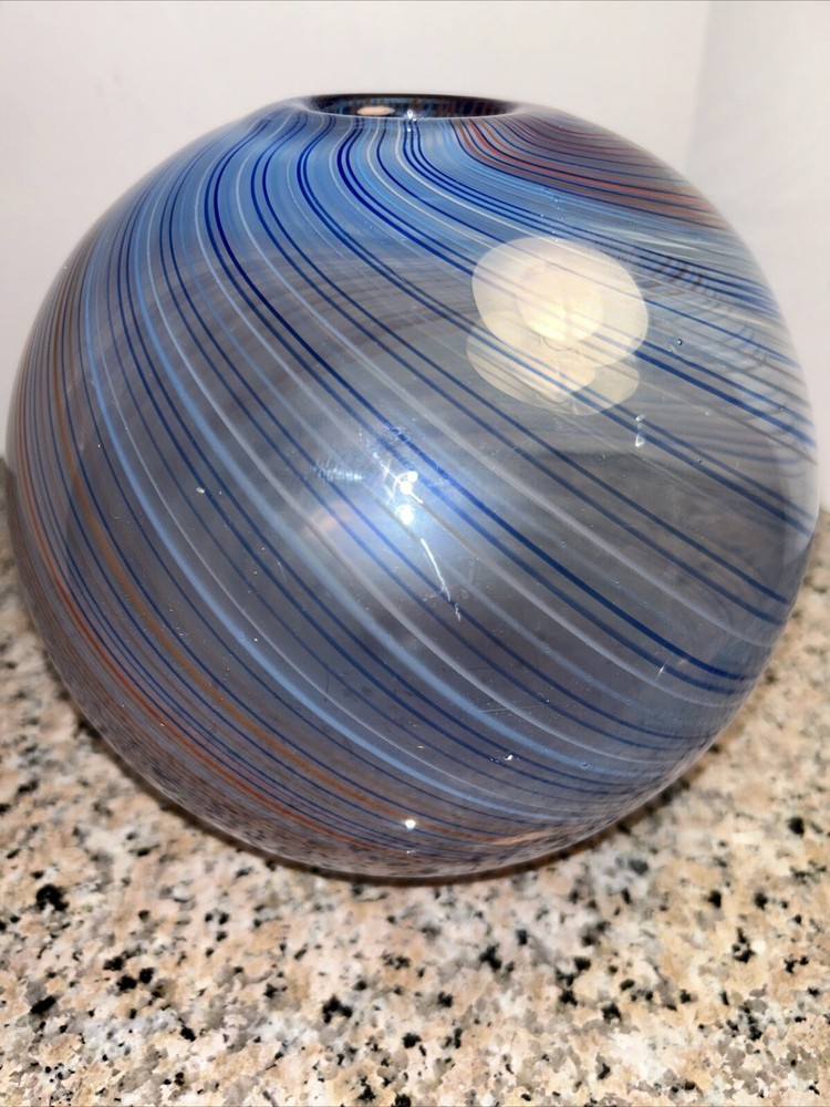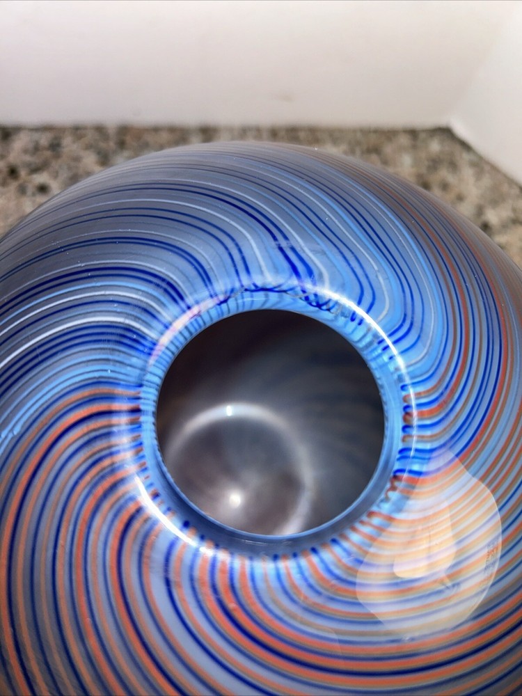 Add a touch of vintage charm to your home decor with this beautiful blue and orange swirl globular vase from Dansk's Mid-Century Mezza Filigrana product line. The vase stands at 5 1/2" tall and features a stylish swirl pattern that is perfect for displaying your favorite flowers or as a standalone statement piece. Crafted in the late 20th century, this handmade vase is a unique addition to any collection. The vase is in excellent condition and comes with a label for easy identification. Don't miss your chance to own this one-of-a-kind piece from Dansk's Century era.