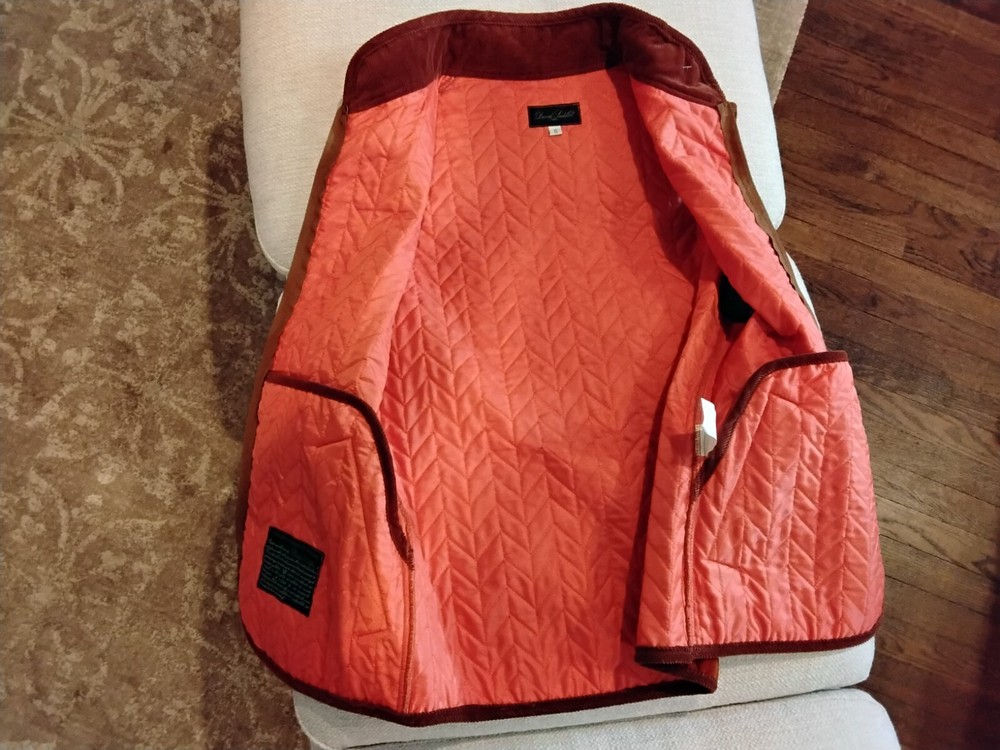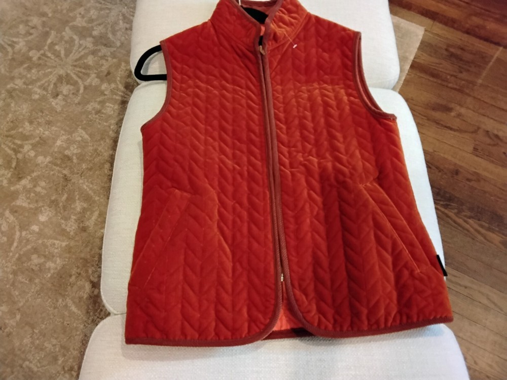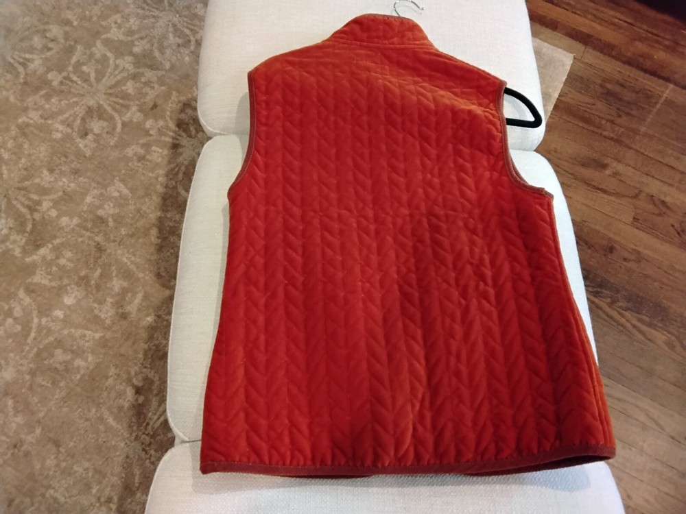This is a David Laddler women's orange quilted vest in size Small. Made of cotton with a polyester lining, it features a solid pattern with quilted accents and a zip closure. The mid-length sleeveless vest has inner pockets and pockets on the outside, making it suitable for travel, casual wear, workwear, or business attire. Perfect for winter, fall, or spring, this classic style vest with zipper accents is designed in Italy.