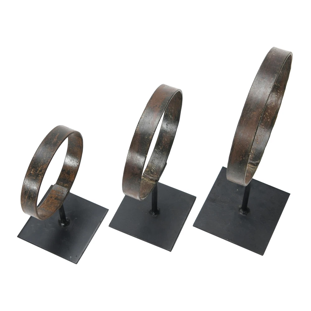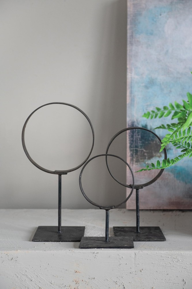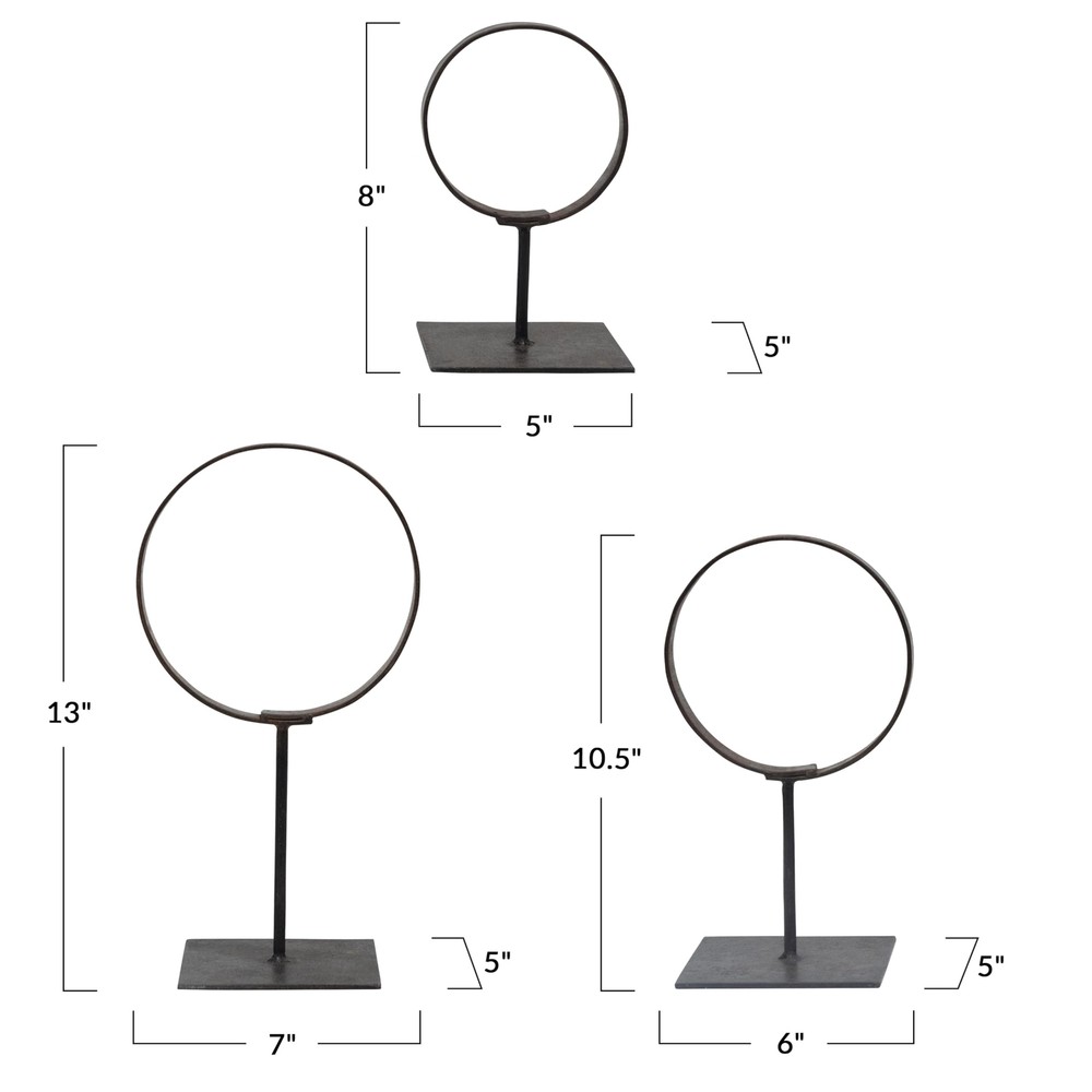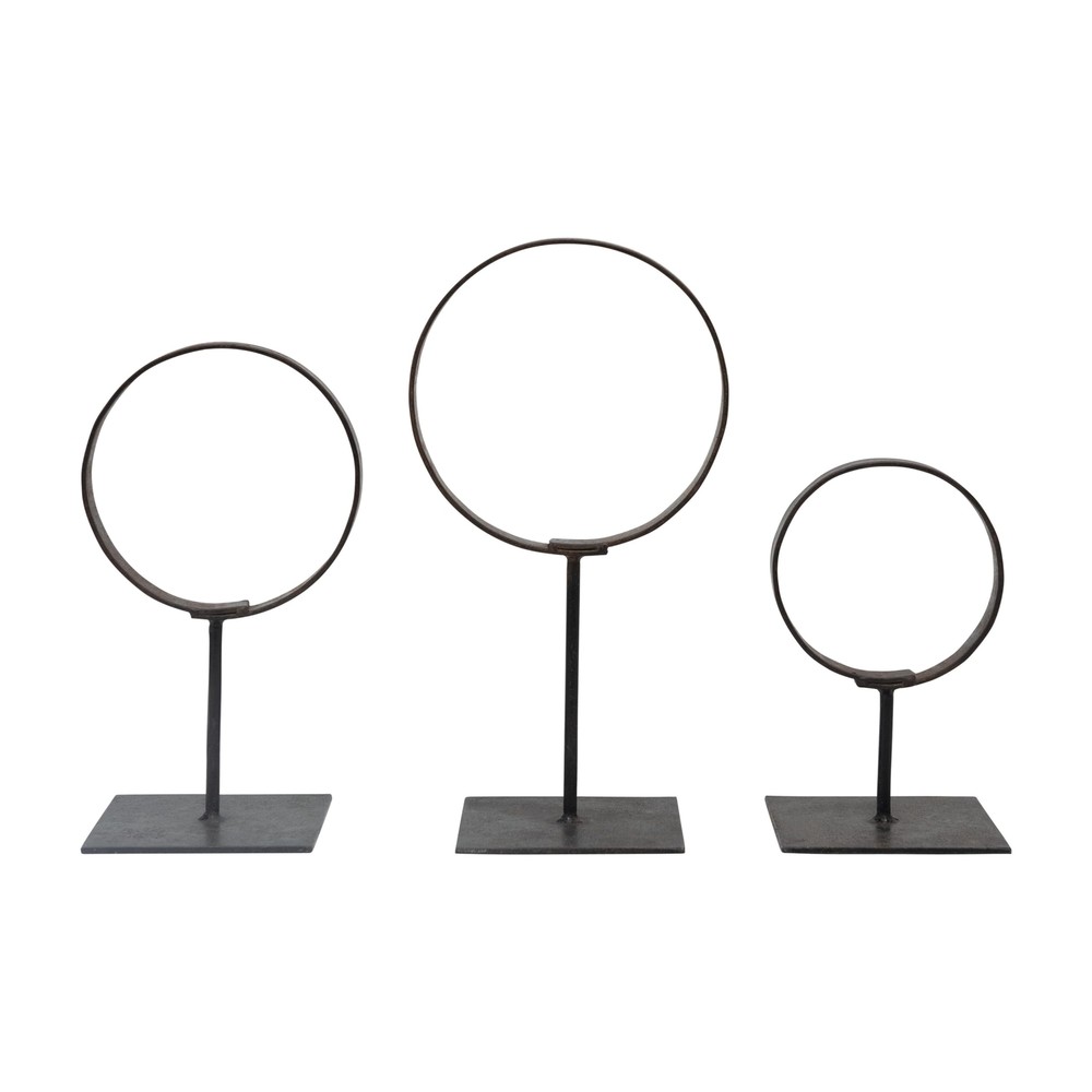 Created from found iron, this set of 3 metal rings on stands have a naturally rustic appearance that allows them to easily stand out from the rest of your home or office decor. Featuring a combination of a clean design and a rugged look, they add character and personality to any decorative setting that they are featured in. Display these unique decor proudly as part of your desk, table, or shelf decorations in the bedroom, living room, hallway, or entrance area. They are a wonderful option for any modern rustic or industrial themed setting and look especially striking paired with other small decorative items on a console or end table. This set of 3 found metal accents gives you an amazing way to add personality to your table, shelf, or desk decor; its combination of clean design and rugged coloring, makes it a wonderful conversation piece Expertly crafted from iron, this house decor has a strong and durable construction; the rings in the design have a naturally distressed finish that gives the piece unique class and visual appeal Show off your design style by displaying these shelf decor in an easily visible area in your living space; this set will beautifully complement a modern rustic or industrial design scheme For a striking look, display this table decor paired with other small accents, such as bookends, vases, and candleholders on a hallway console From the tallest to the shortest these bookshelf decor measure 7" L x, 5" wide, and 13" high; 6" L x, 5" wide, and 10.5" high; and, 5" L x, 5" wide, and 8" high