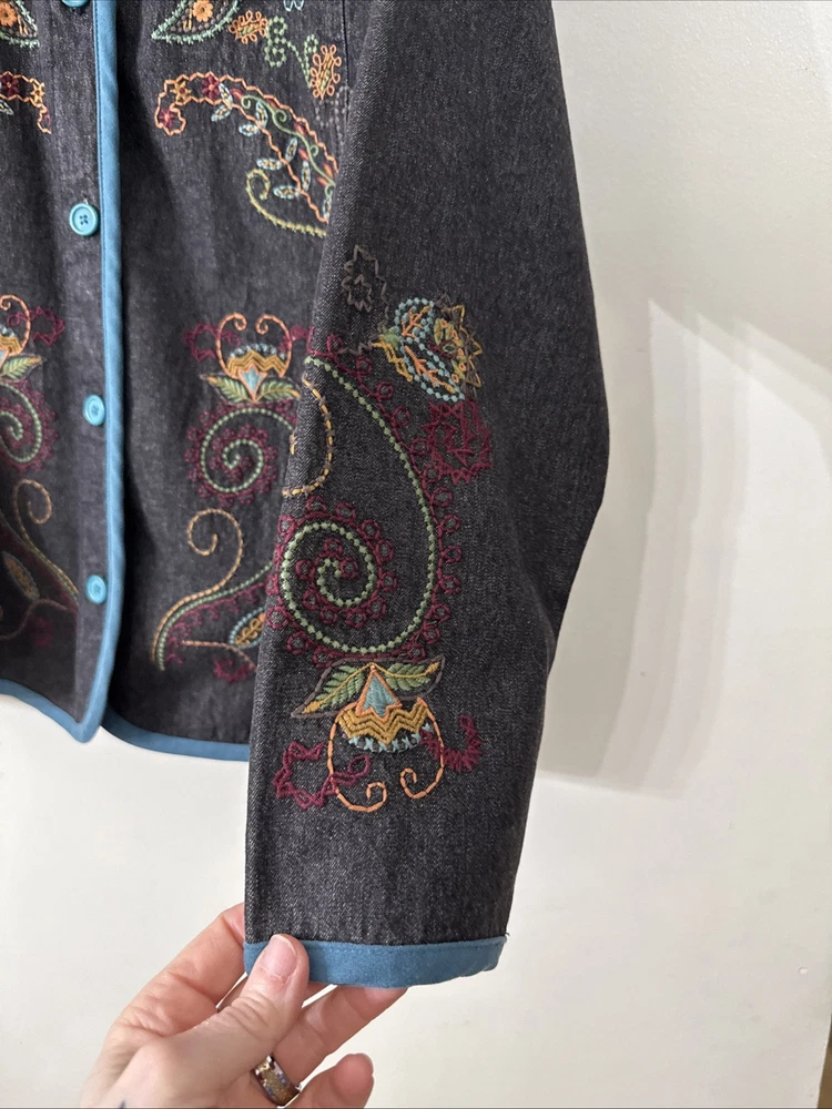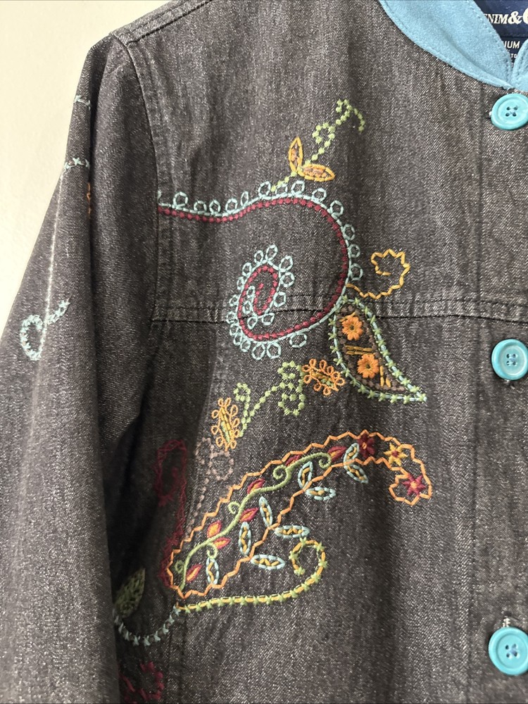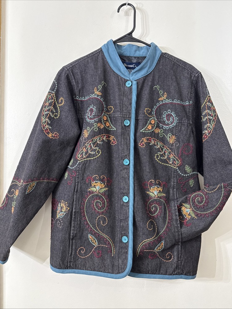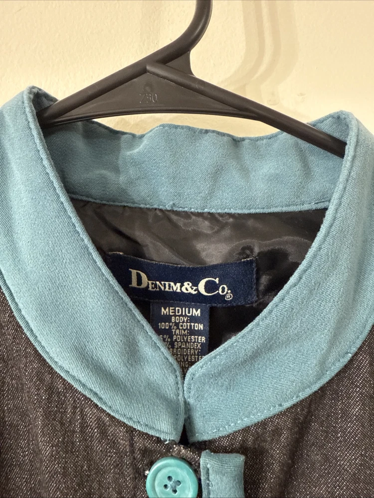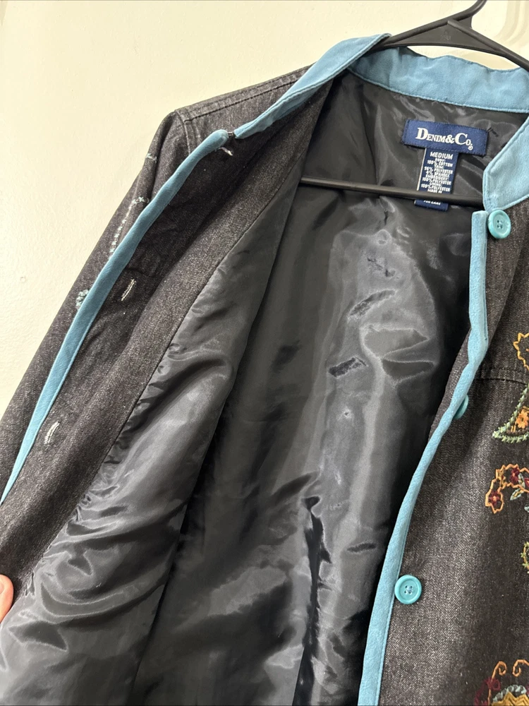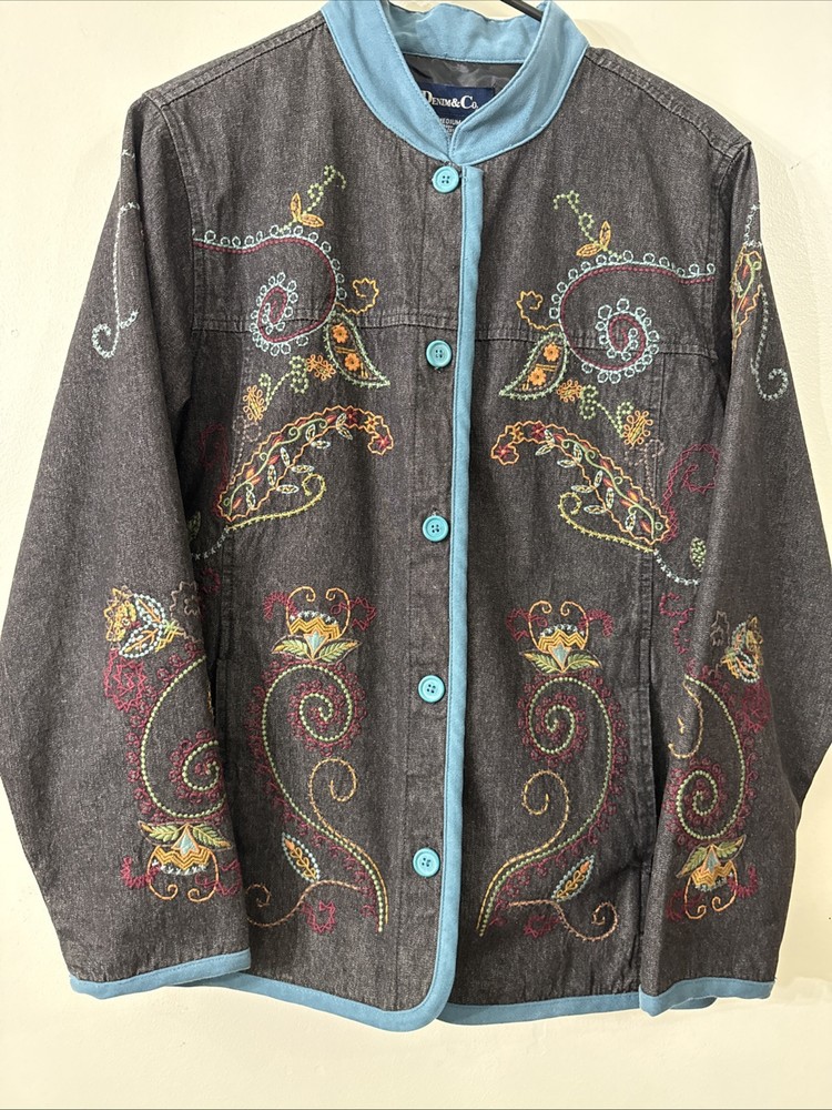 Denim & Co Jean Jacket Womens size medium. This is heavily embroidered on the front, back and down both sleeves. Pockets Lined Peacock blue collar and trim EUC Western Cottage Boho Artsy Measures 21” armpit to armpit 27” shoulder to bottom hem