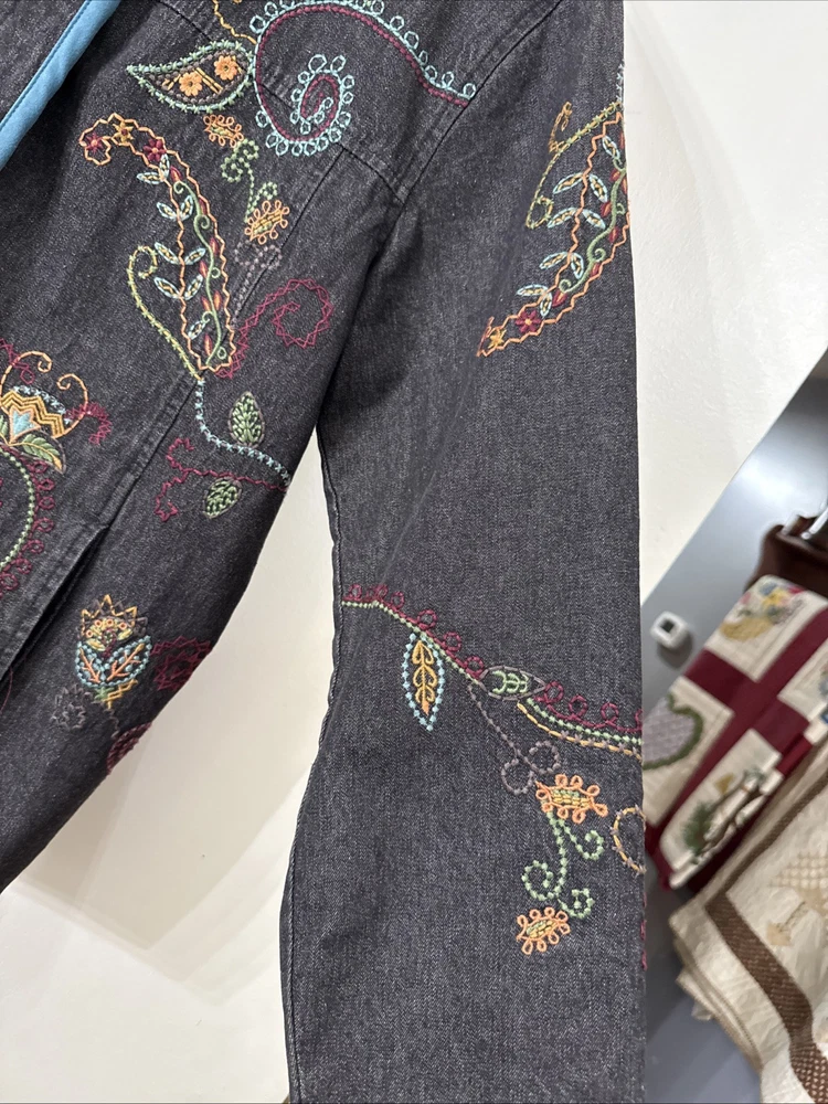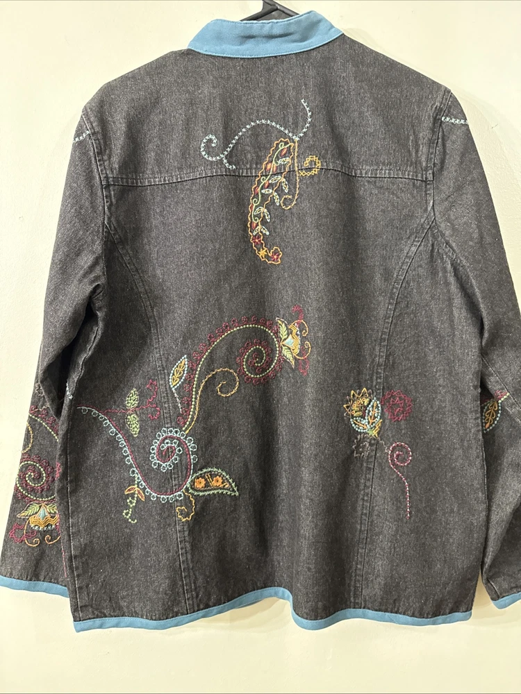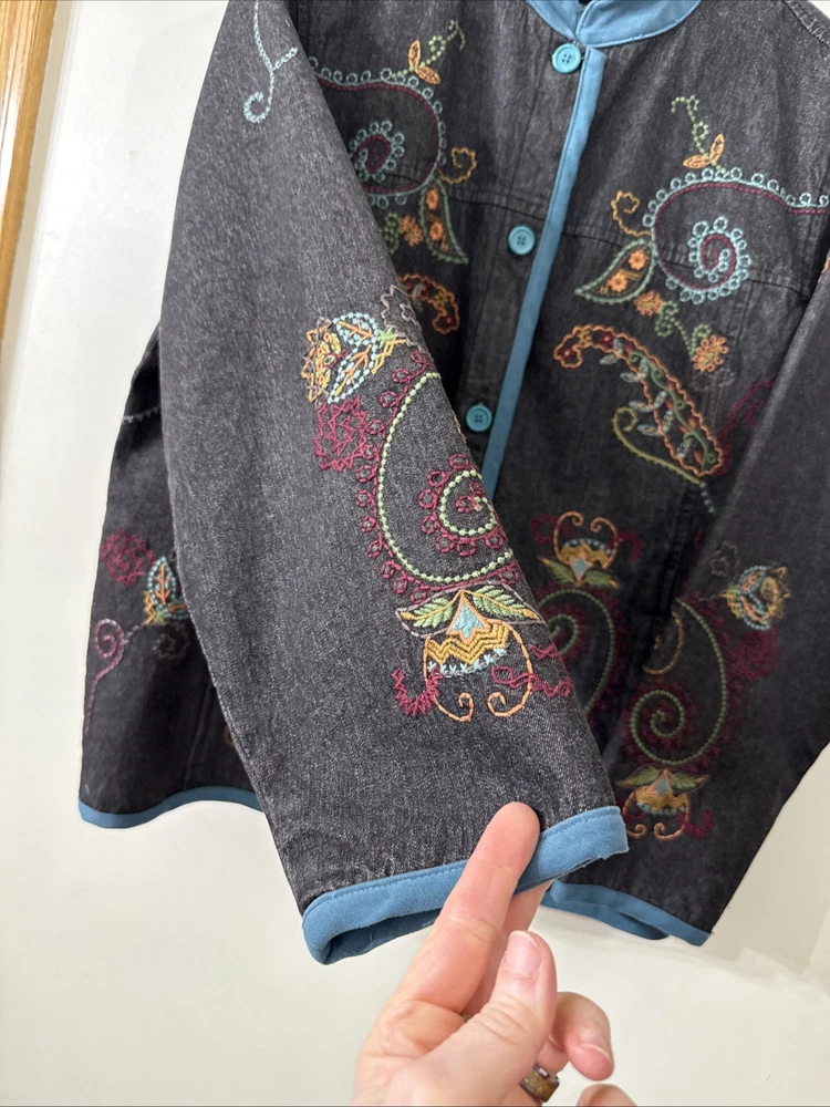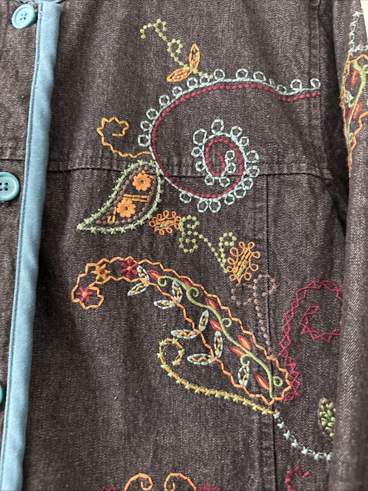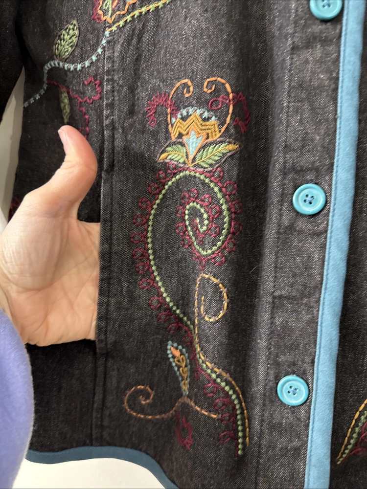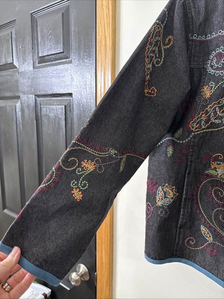 Denim & Co Jean Jacket Womens size medium. This is heavily embroidered on the front, back and down both sleeves. Pockets Lined Peacock blue collar and trim EUC Western Cottage Boho Artsy Measures 21” armpit to armpit 27” shoulder to bottom hem