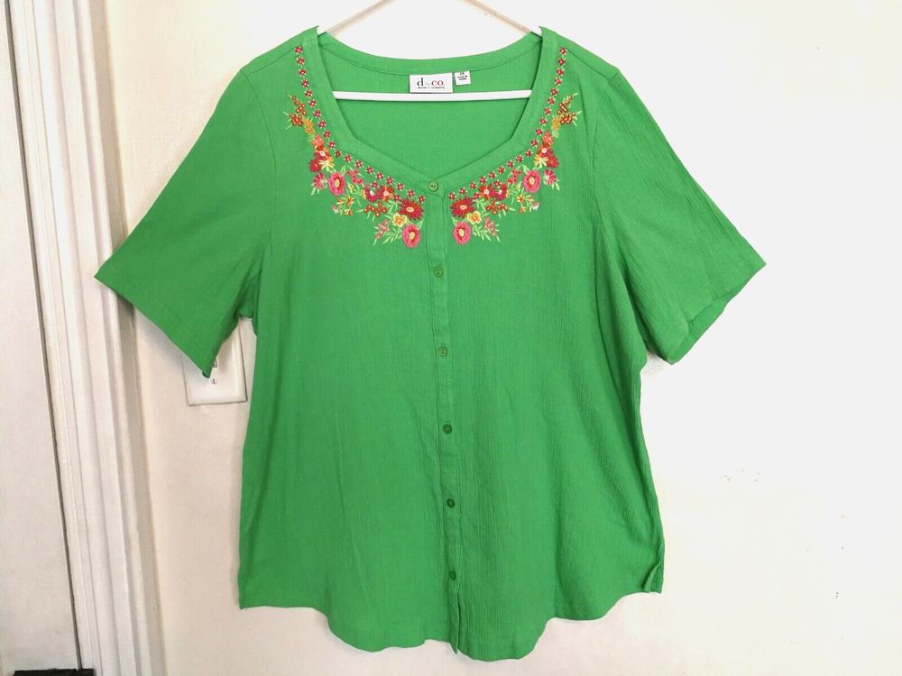 Blouse is in Excellent condition. See pics. This listing is for a Womens, Denim & Co, short sleeve, Button Up, Tunic shirt blouse. Floral design. Green, in color. Size 2X, Plus. -Pit to pit 25" -Shoulder sleeve hem to cuff 11.5 " -Length 30" Free shipping. -1618- 12/16/24