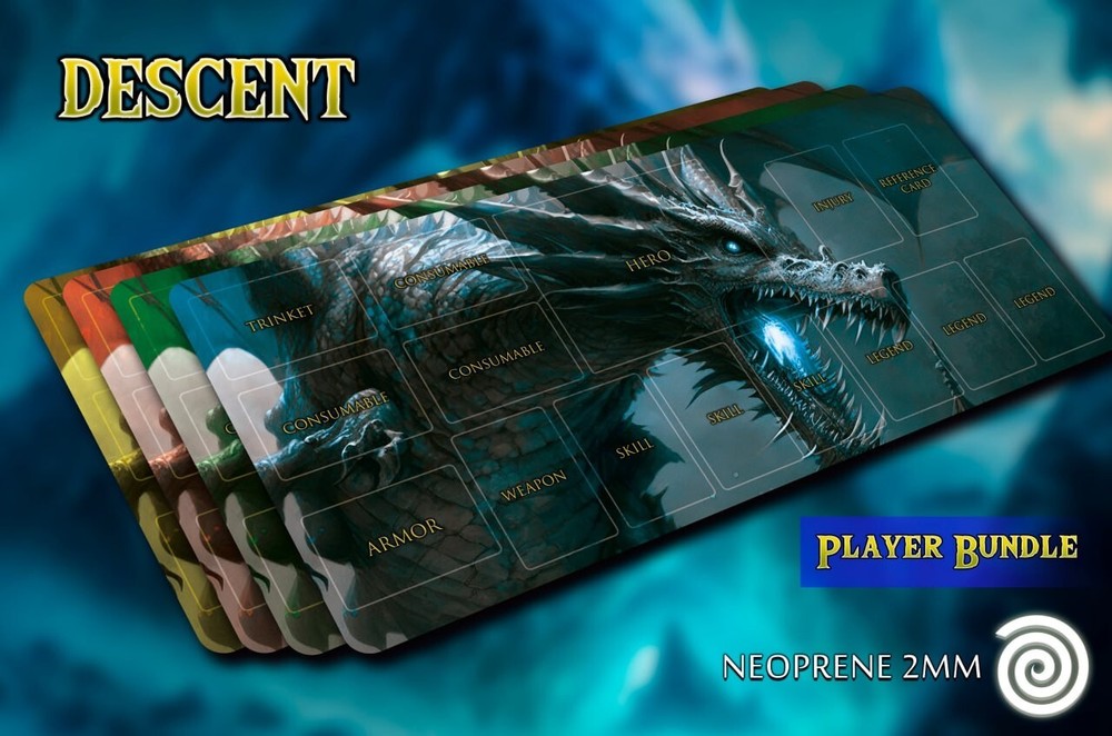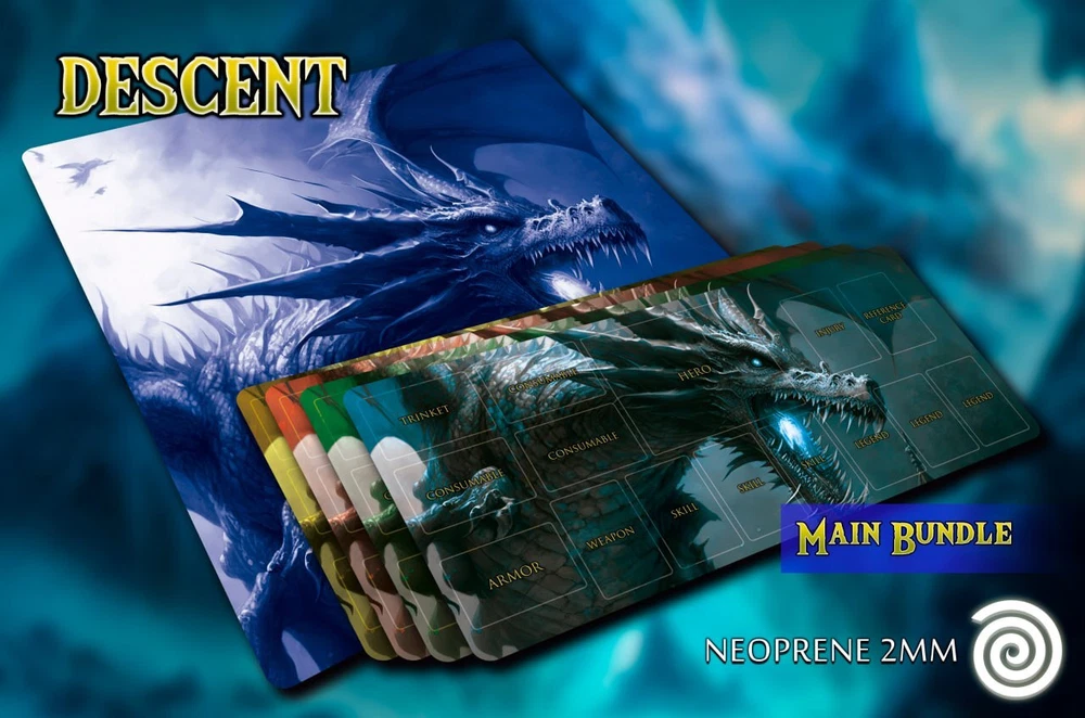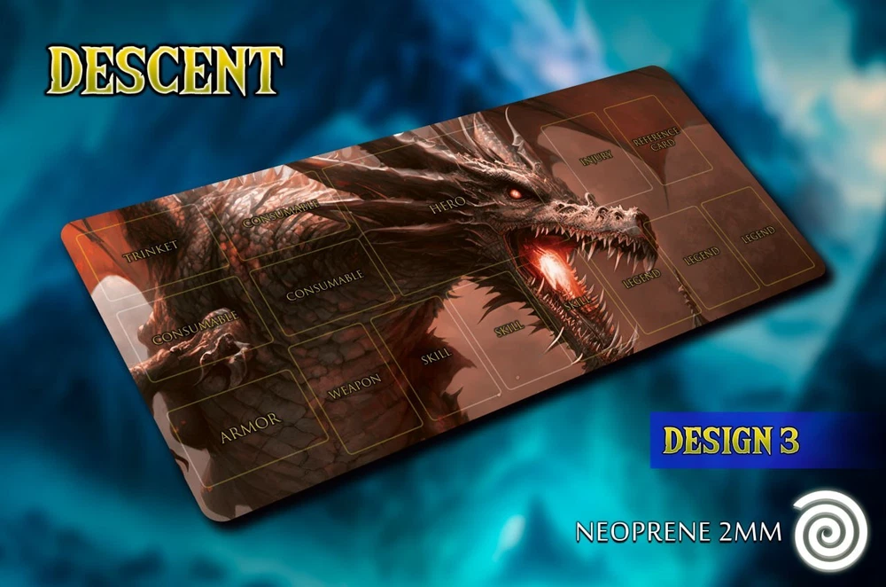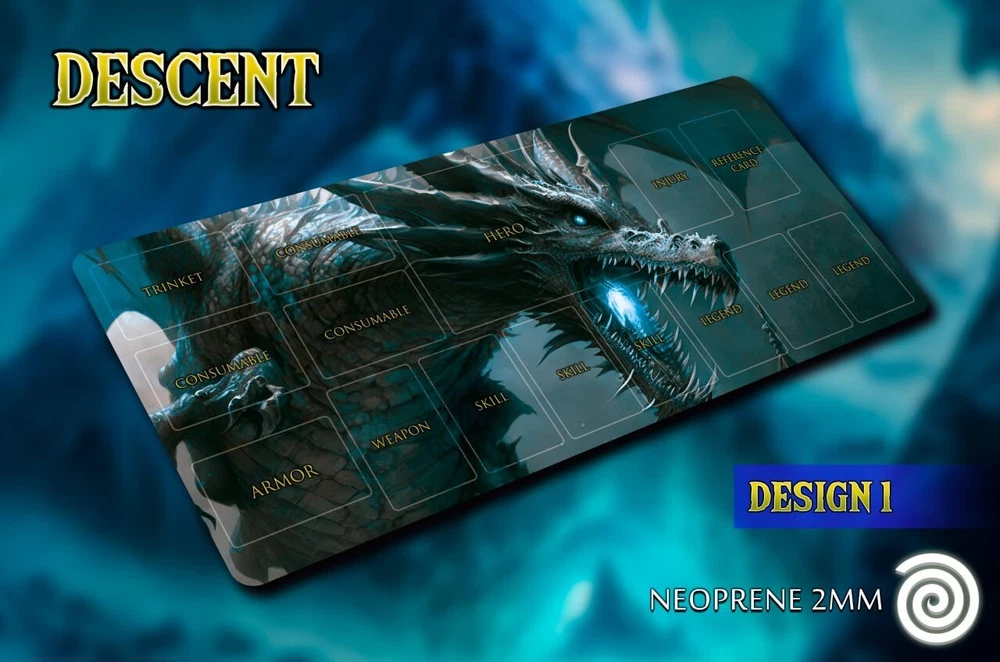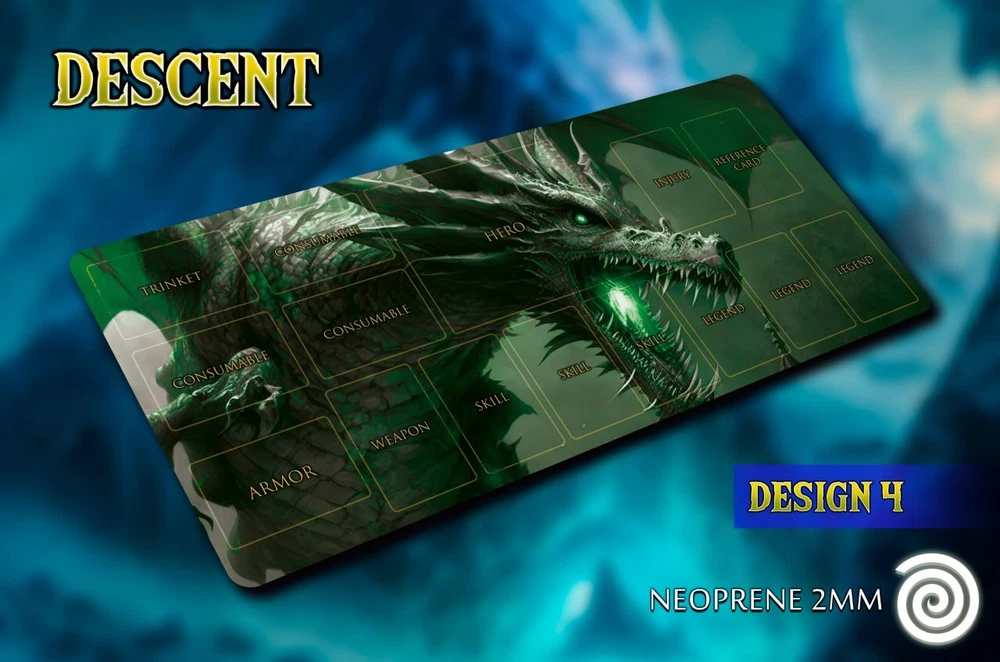 Get the compatible mats for the board game Descent: Legends of the dark, now with an updated design! The Legend slots included. Prepare your games and organize your cards for the campaign. Choose from the following options: Central 90: Central Playmat ideal for placing your campaign scenario. Measures 35.4x 35.4''/90x 90 cm Central 80: Central Playmat ideal to place your campaign scenario. Measures 31.5x31.5''/80x80 cm Main Bundle 90: Central playmat (35.4x 35.4 ''/90x 90 cm) + 4 player mats (10 x17.5''/ 25 x 43 cm). The character mats can be combined as you wish. Main Bundle 80: Central playmat (31.5x31.5''/ 80x80 cm) + 4 player mats (10 x22.8''/ 26 x 58 cm). The character mats can be combined as you like. Player Bundle: The 4 player mats (10 x22.8''/ 26 x 58 cm). Choose the designs in the customization box. You can repeat the same or combine them as you like. 3 players: Three player playmats, choose the designs in the customization box. You can repeat the same or combine them as you want. 2 players: Two player playmats, choose the designs in the customization box. You can repeat the same or combine them as you like. 1 player: One player Playmat, choose the design you want, in the customization box. Unroll and go, your game is ready to start! Shipped rolled up in a sturdy cardboard tube that also serves for storage. Lightweight and flexible 2mm neoprene material allows you to carry it anywhere. Preserves both the table and your board game by preventing friction and cushioning game components. With stitched edges to last a lifetime. Thanks to our textile material, you won't have to endure the annoying reflections of board game boards; facilitating a perfect vision. Easy to clean: although machine washable (cold water) is acceptable, we recommend washing by hand and with products suitable for textiles. Treated material, does not give off bad odor. ☎️ Please add your phone number in the comments for more efficient delivery. Thank you. Compatible product, not official.