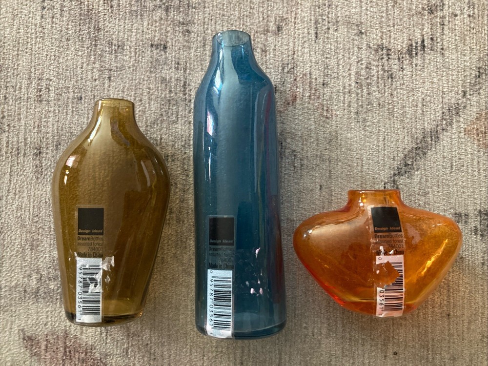 Design Ideas Glass Mid Century Style Bud Vase Set of 3 -Green Orange & Blue. These vases are new with their original manufacturers sticker s but have had the shop stickers removed which were on top of the manufacturer stickers so there may be some partial tag left on the bottle itself . Please ask all questions and see all photos prior to purchasing as all sales our final. Thank you for looking!