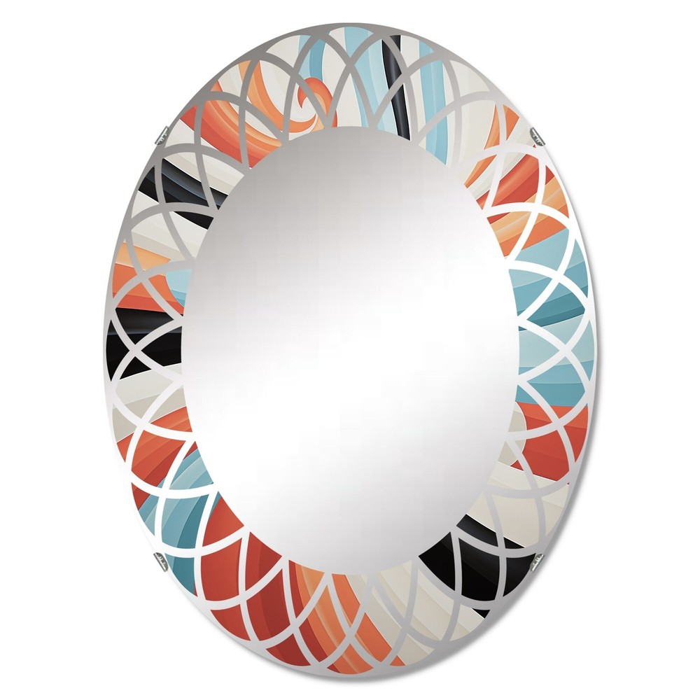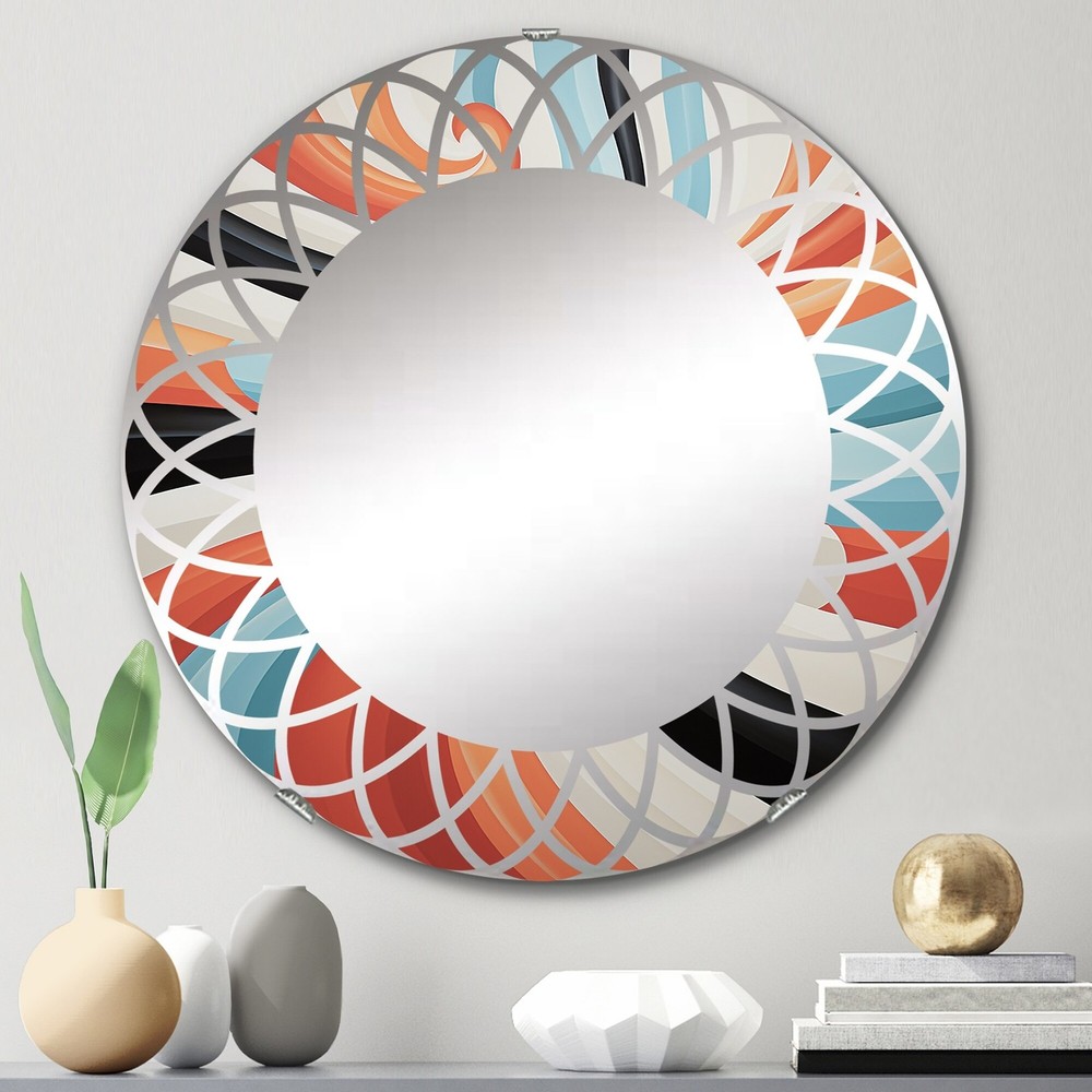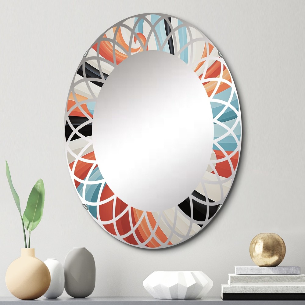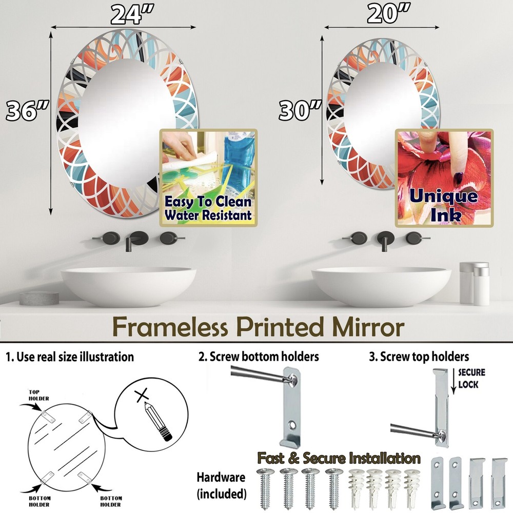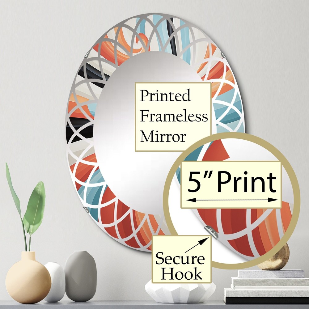 In an industry that has seen very little innovation of the years, DesignArt proudly brings you our exclusive collection of mirrors with printed designs. Mirrors, a staple decor item in every home have now become more than just a mirror- they have become piece of art.Our unique design and exclusive technique allows for the ink to be raised a few millimeters above the mirror, yet remain scratch proof and fade resistant.The mirror itself is of the highest quality measuring 1/4 inch in thickness and providing a crystal clear distortion free reflection. As with the benefits of a traditional mirror, it naturally provides an appearance of increased space in the surrounding area and increased brightness and lighting.Premium backing prevents corrosion in bathroom environments and all mirrors come Free Shipping Over $49.99* Details Designart "Orange Mid Century Optical Illusions I" Abstract Modern Wall Mirror Product Description: In an industry that has seen very little innovation of the years, DesignArt proudly brings you our exclusive collection of mirrors with printed designs. Mirrors, a staple decor item in every home have now become more than just a mirror- they have become piece of art. Our unique design and exclusive technique allows for the ink to be raised a few millimeters above the mirror, yet remain scratch proof and fade resistant. The mirror itself is of the highest quality measuring 1/4 inch in thickness and providing a crystal clear distortion free reflection. As with the benefits of a traditional mirror, it naturally provides an appearance of increased space in the surrounding area and increased brightness and lighting. Premium backing prevents corrosion in bathroom environments and all mirrors come with the wall hangers already installed allowing it to be hung vertically or horizontally. Drywall anchors and screws are also included for your convenience. Each mirror is carefully inspected prior to shipping and packaged securely with several layers of protective packaging, ensuring a safe delivery. Designarts' mirrors are available in the following sizes: Round 35.4" Round 31.4" Round 23.6" Oval 19.6"x29.5" Oval 23.6"x35.4"
