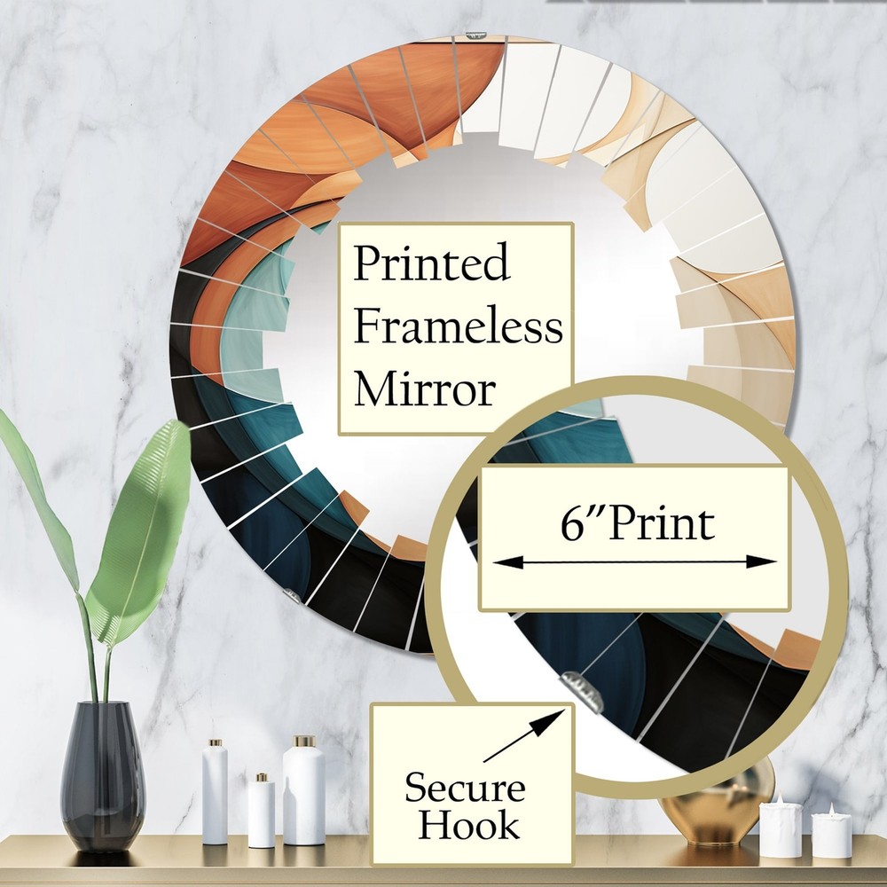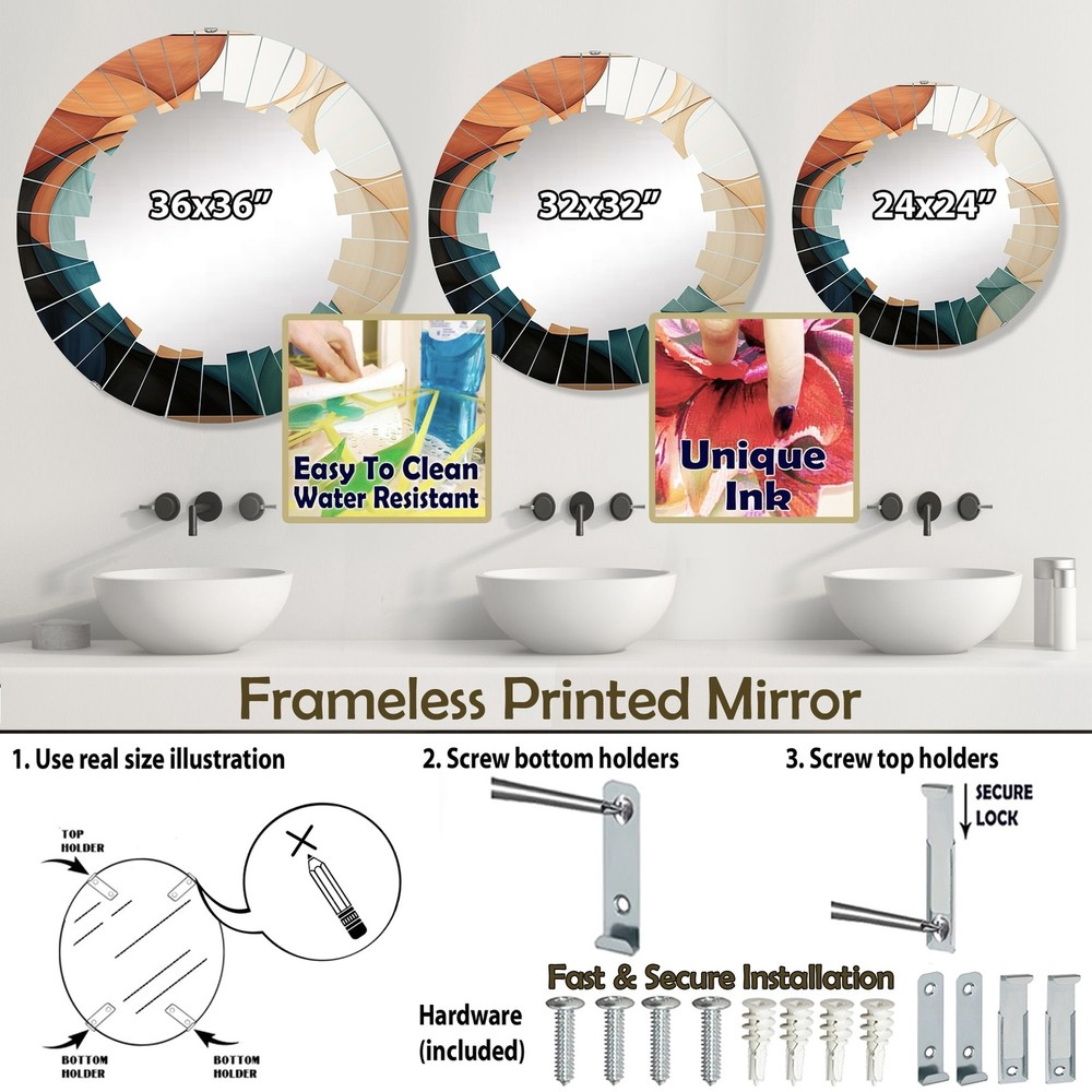 In an industry that has seen very little innovation of the years, DesignArt proudly brings you our exclusive collection of mirrors with printed designs. Mirrors, a staple decor item in every home have now become more than just a mirror- they have become piece of art.Our unique design and exclusive technique allows for the ink to be raised a few millimeters above the mirror, yet remain scratch proof and fade resistant.The mirror itself is of the highest quality measuring 1/4 inch in thickness and providing a crystal clear distortion free reflection. As with the benefits of a traditional mirror, it naturally provides an appearance of increased space in the surrounding area and increased brightness and lighting.Premium backing prevents corrosion in bathroom environments and all mirrors come Free Shipping Over $49.99* Details Designart "Orange Mid Century Organic Harmony I" Abstract Modern Wall Mirror Product Description: In an industry that has seen very little innovation of the years, DesignArt proudly brings you our exclusive collection of mirrors with printed designs. Mirrors, a staple decor item in every home have now become more than just a mirror- they have become piece of art. Our unique design and exclusive technique allows for the ink to be raised a few millimeters above the mirror, yet remain scratch proof and fade resistant. The mirror itself is of the highest quality measuring 1/4 inch in thickness and providing a crystal clear distortion free reflection. As with the benefits of a traditional mirror, it naturally provides an appearance of increased space in the surrounding area and increased brightness and lighting. Premium backing prevents corrosion in bathroom environments and all mirrors come with the wall hangers already installed allowing it to be hung vertically or horizontally. Drywall anchors and screws are also included for your convenience. Each mirror is carefully inspected prior to shipping and packaged securely with several layers of protective packaging, ensuring a safe delivery. Designarts' mirrors are available in the following sizes: Round 35.4" Round 31.4" Round 23.6" Oval 19.6"x29.5" Oval 23.6"x35.4"