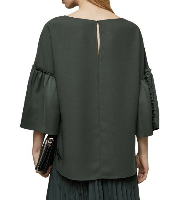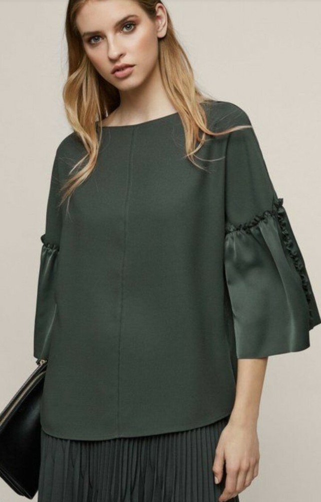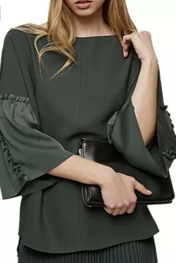 --BRAND NEW WITHOUT TAGS-- Designer REISS Joss loose blouse UK size 10 Bust 46" Hips 40" green ruffle sleeve detail Please note the labels have been cut off to prevent store returns Small damage to the fabric on the sleeve from underarm area