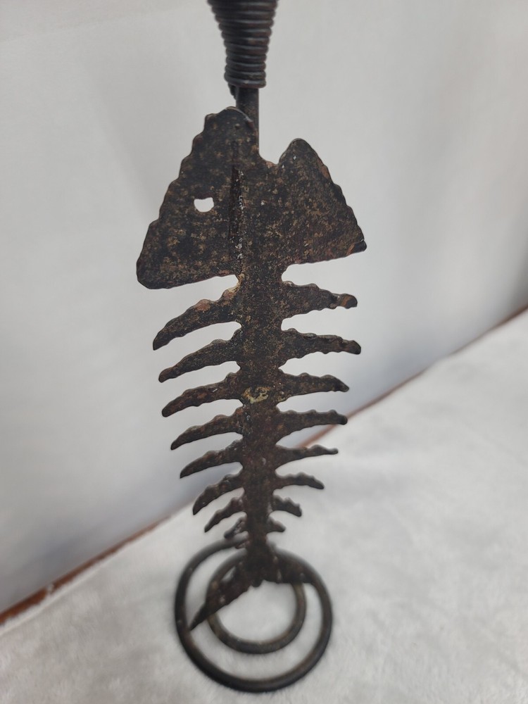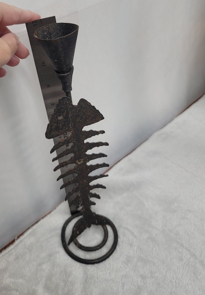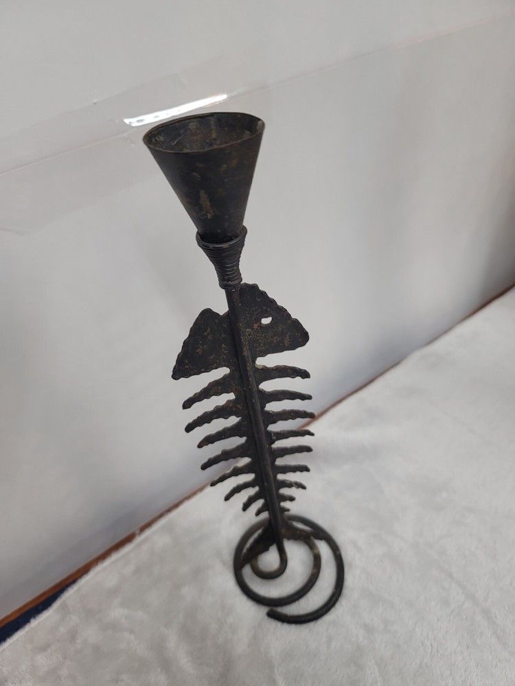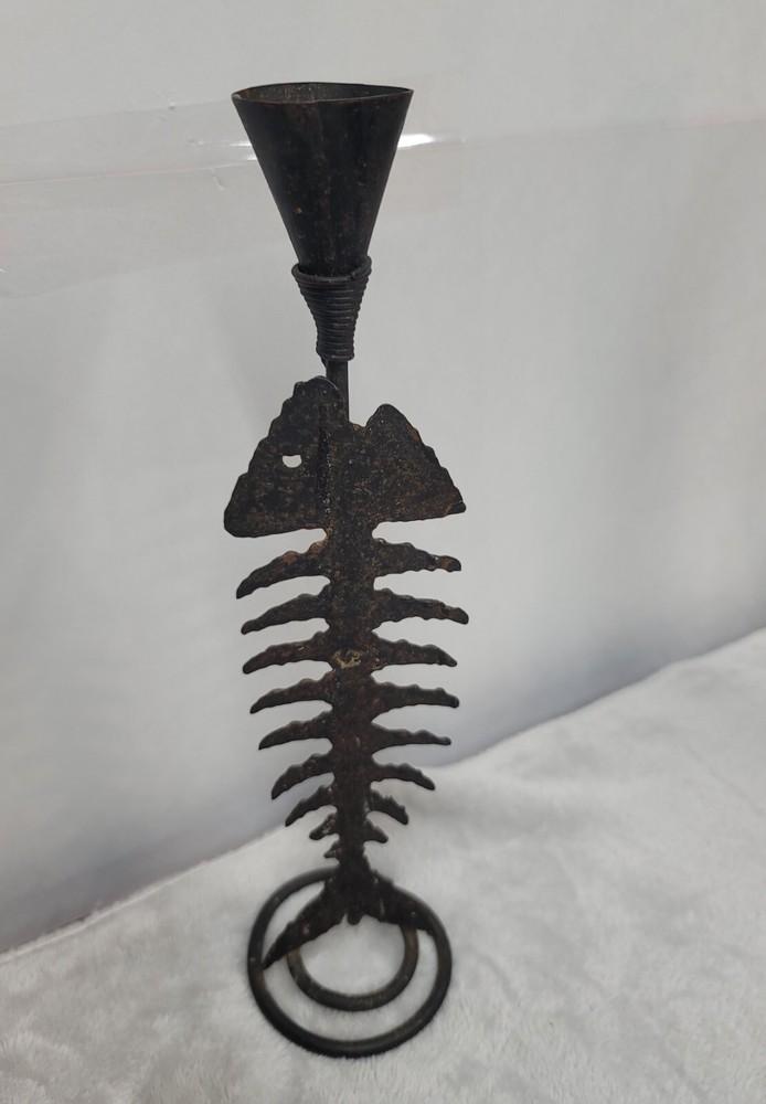 This unique candle holder features a beautiful fish bone pattern and is made of distressed metal. It is perfect for any occasion and will add a touch of rustic charm to your home decor. The medium size and rust color make it suitable for any room, and it can hold a taper candle of your choice. The fish shape and character make it a perfect addition to a lake house, coastal beach cabin or bar. Its metallic finish adds to its charm and it is suitable for all occasions. The candle holder is perfect for adding a touch of the sea to your home decor.