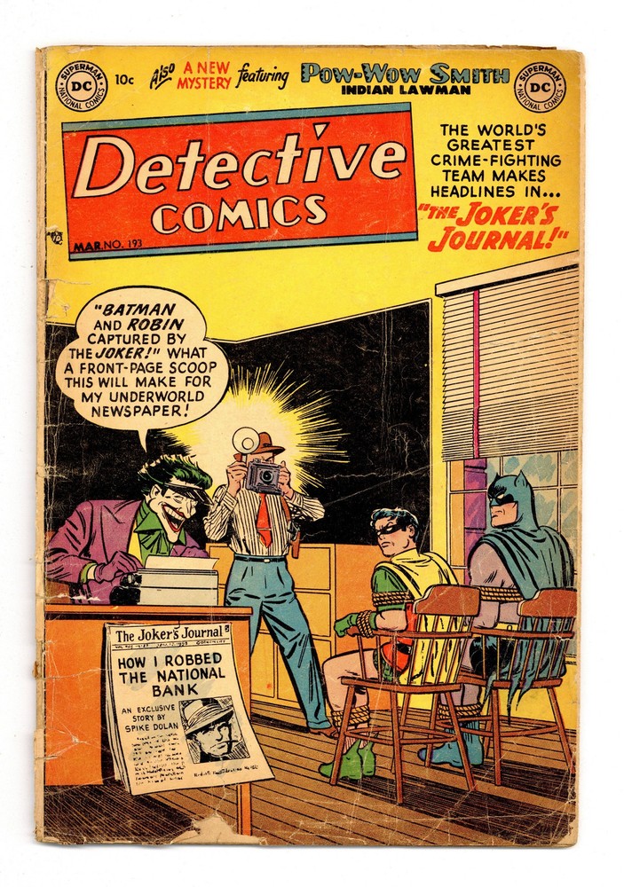 Menu Categories Featured Comics New Comics Comic Book Value Packs Key Comics & First Appearances Pre-Code Horror Comics Good Girl Art Comics Promotional Comics Comics Pre-1940 Comics 1940s Comics 1950s Comics 1960s Comics 1970s Comics 1980s Comics 1990s Comics 2000s Comics 2010-Curent Other Comics Graphic Novels, Books Fanzines Vintage Paperbacks Pulps and Digests Men's Adventure Non-comic Magazines Detective Comics #193 PR 0.5 1953 Grade PR 0.5 Year 1953 Publisher DC Interior is complete. Full length spine split. This is a very low grade item. A comic in PR condition may be missing up to 4 pages (two spreads) of story pages or display severe damage that affects the readability of the book. Allowed defects for this grade include: fully or partially missing pages; water damage, staining, and brittleness; tape or sticker on the cover; writing or other marks on the cover; split or detached spine or centerfold; or other major structural damage and cosmetic flaws. Description Cover by Win Mortimer. Stories by David Vern and unknown. Art by Bob Kane, Lew Sayre Schwartz, Charles Paris, Leonard Starr, Ruben Moreira and unknown. Batman and Robin make headlines in "The Joker's Journal!" by David Vern, Bob Kane, Lew Sayre Schwartz and Charles Paris. Plus: Pow-Wow Smith, Indian Lawman in "The Double Life of Pow-Wow Smith" with art by Leonard Starr; Robotman in "The Super Magnet!"; and Impossible -- But True! tale "Roy Raymond's Rival!" (featuring Roy Raymond) with art by Ruben Moreira. Also: Casey the Cop half-pager by Henry Boltinoff; Varsity Vic half-pager by Boltinoff; and 2-page text piece "Caging the Counterfeiters" by Jack Miller. 44 pages, full color. This item is a consignment This item is a consignment, which means that the price has been set by the consignor rather than by MyComicShop. It is located at our headquarters and ships just as quickly as everything else we carry. The grade and description for this item were assigned by MyComicShop's professional graders, not by the consignor. You can expect the same high quality, reliable grading on consignments that we provide on all other items we offer. Grading & Packing We take pride in our accurate, consistent grading. You can be confident in receiving a well-graded comic when ordering from us. We understand that condition is important to collectors. We pack your comics with professional care and high-quality packaging to insure your purchase reaches you safely. About Us We opened our first comic retail store in 1977 and operated a chain of eight comic book stores in the 80s, 90s, and 2000s before going online-only. We are the world's largest comic book seller and the biggest and most trusted comic seller on eBay with over 3.6 million comics sold. We Buy & Consign We buy tens of thousands of comics every month from collections large and small, old and new. We also accept consignments and will get your comics listed on eBay for you. Check out our website for more info. Copyright © 2025 MyComicShop & Lone Star Comics. All rights reserved.