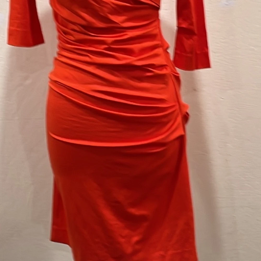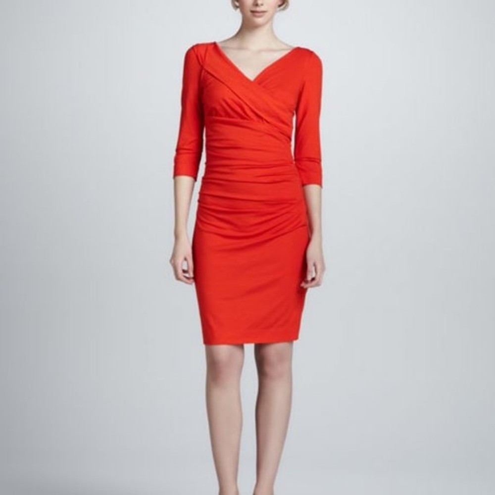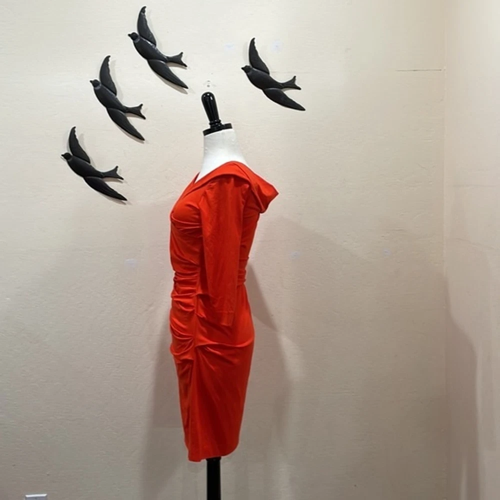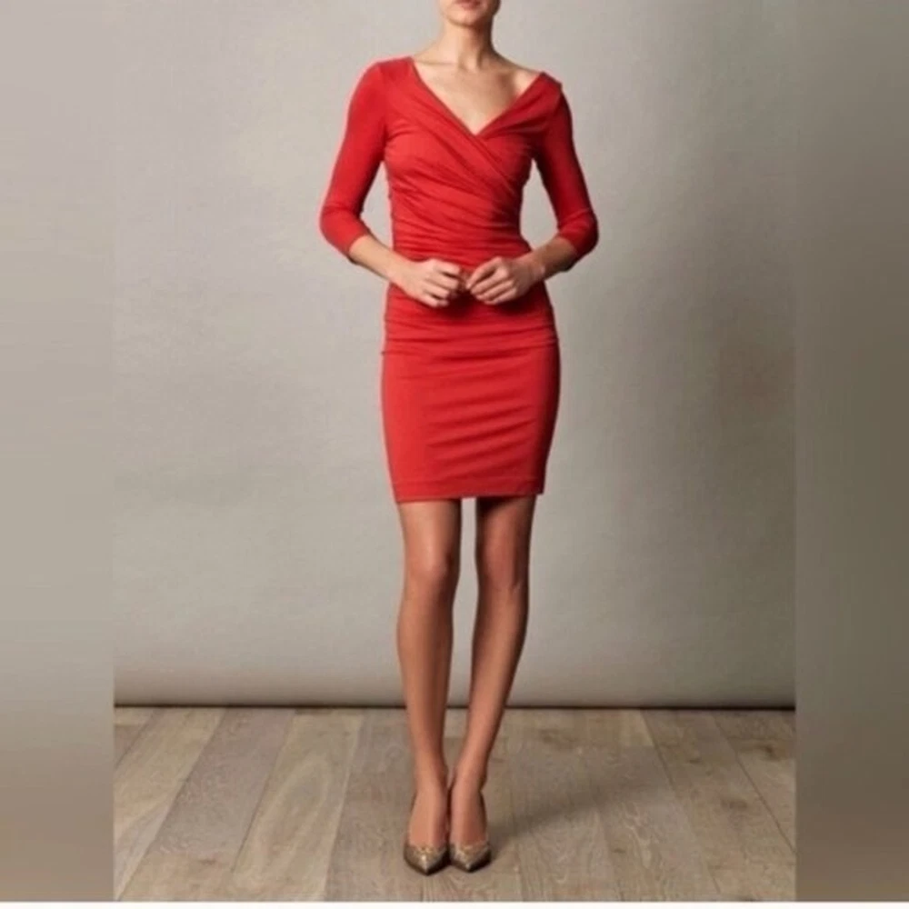 Diane von Furstenberg Bentley dress sweeps across your figure in a purposeful design to veil problematic areas. Very flattering, form-fitting ruched silhouette; 3/4 sleeves; Mid thigh hem; V-neckline.Bias back; 93% viscose / 7% spandex lycra; ; Imported. The result—simply flawless! Approximate measurements laying flat: Bust: 17” Waist: 14" Length: 40" Excellent condition. Smoke & pet free home. Bundle & Save! Ship up to 5 lbs in one box! Diane von Furstenberg Bentley Three-Quarter-Sleeve Ruched Dress Blood Orange - S