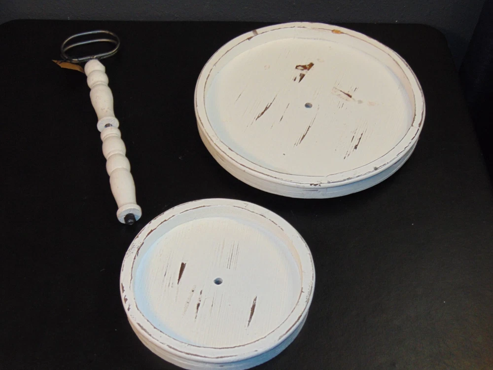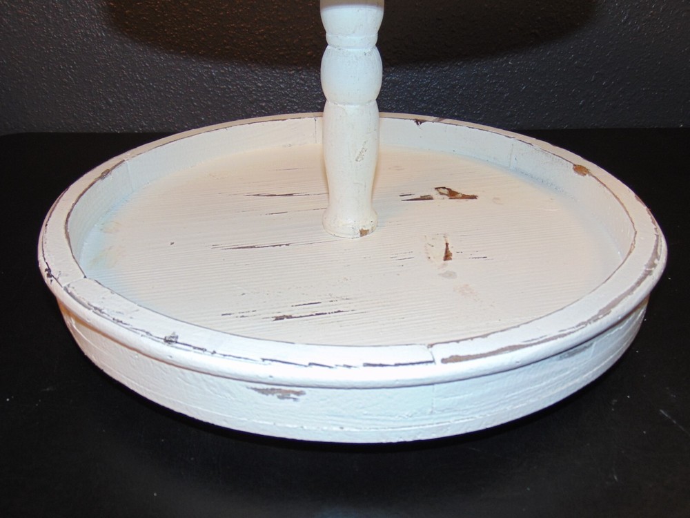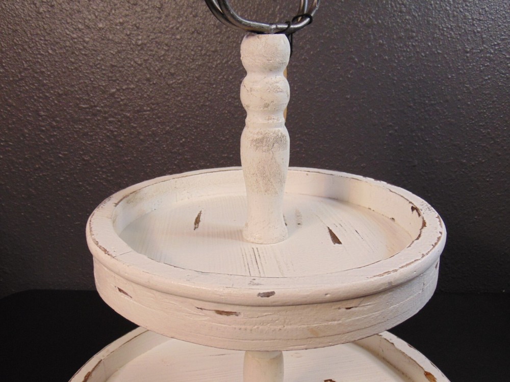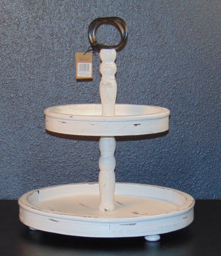 About this item Large tray is 15" wide with 6" between center pole and side allowing larger items to be placed on bottom Small tray is 10" wide with 3. 75" between center pole and side providing ample space for a variety of items Save space on the counter by placing items on this 2-tier tray Handle allows for easy transportation from counter to table or room to room 15"L x 15"W x 18. 5"H Farmhouse Chic Style