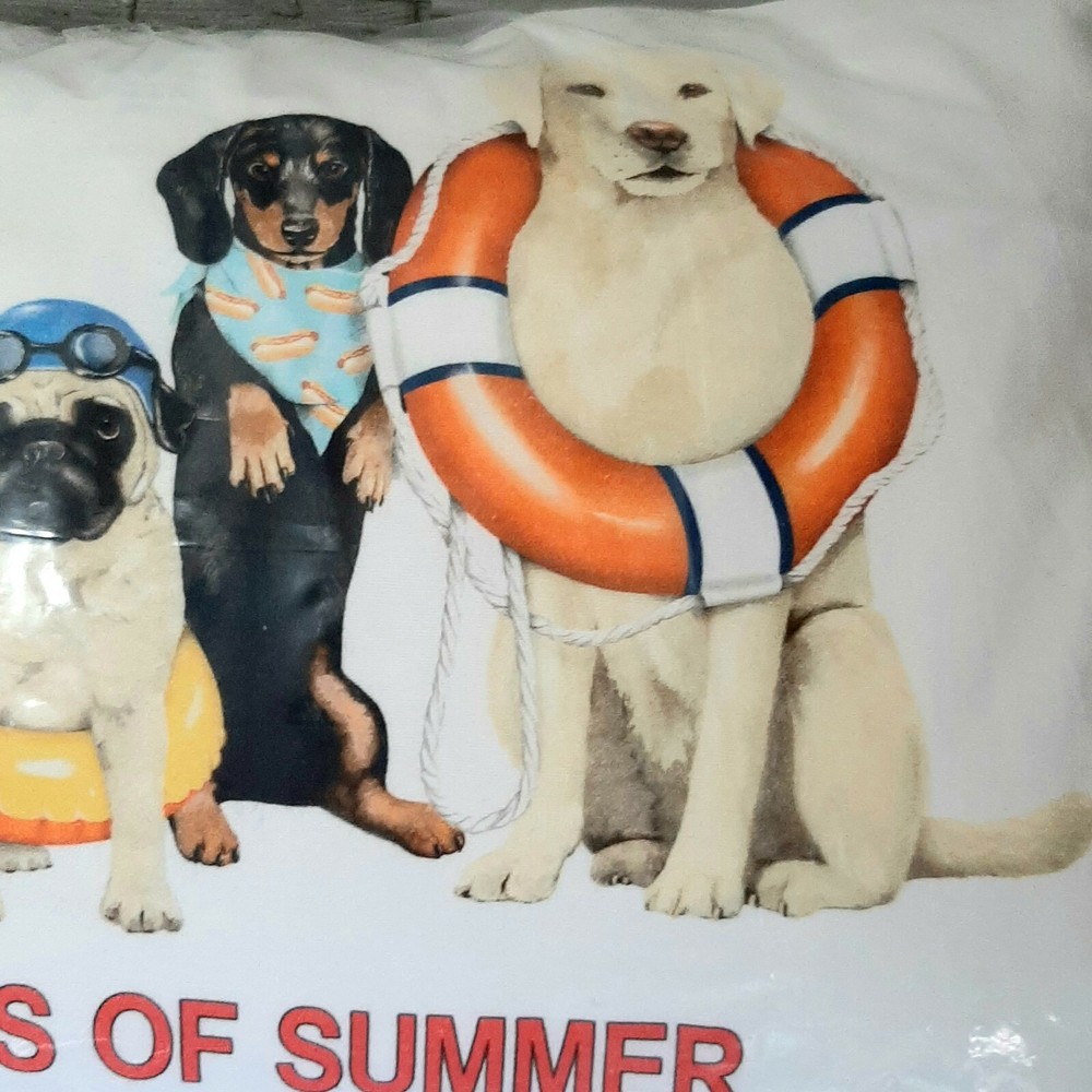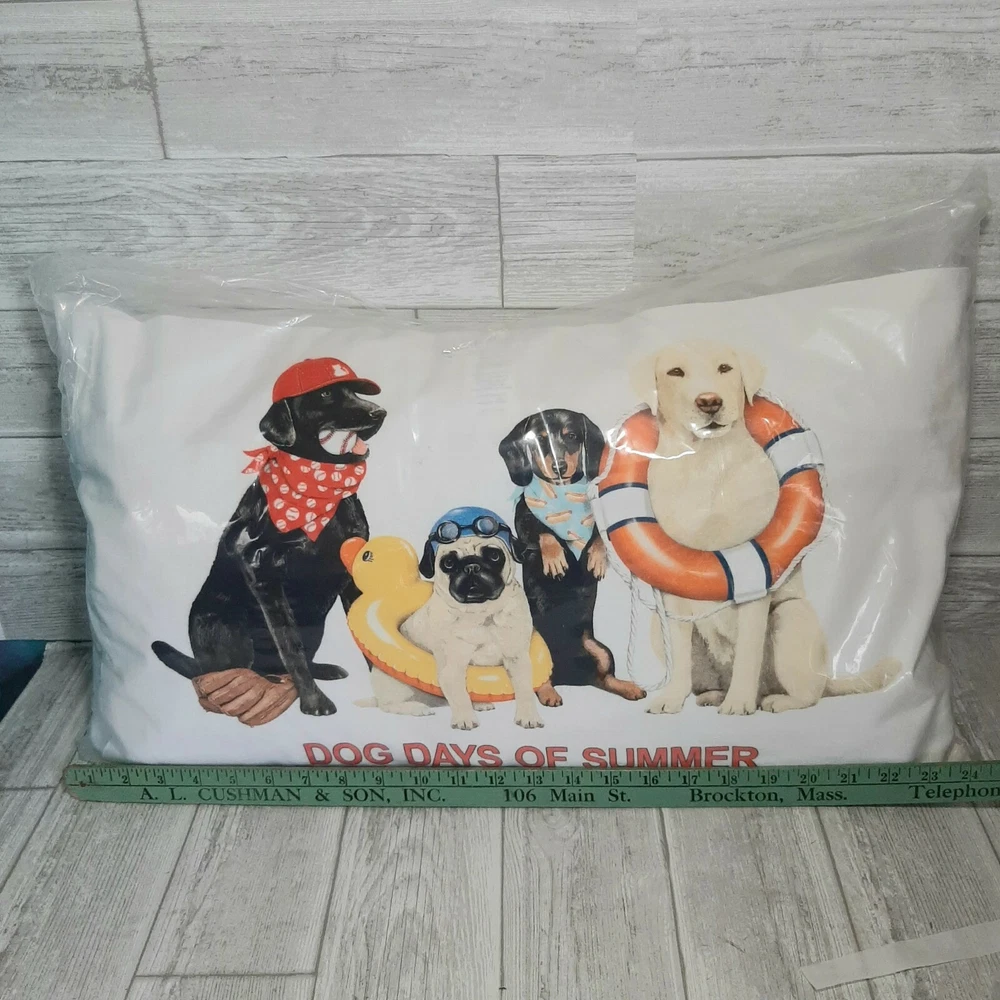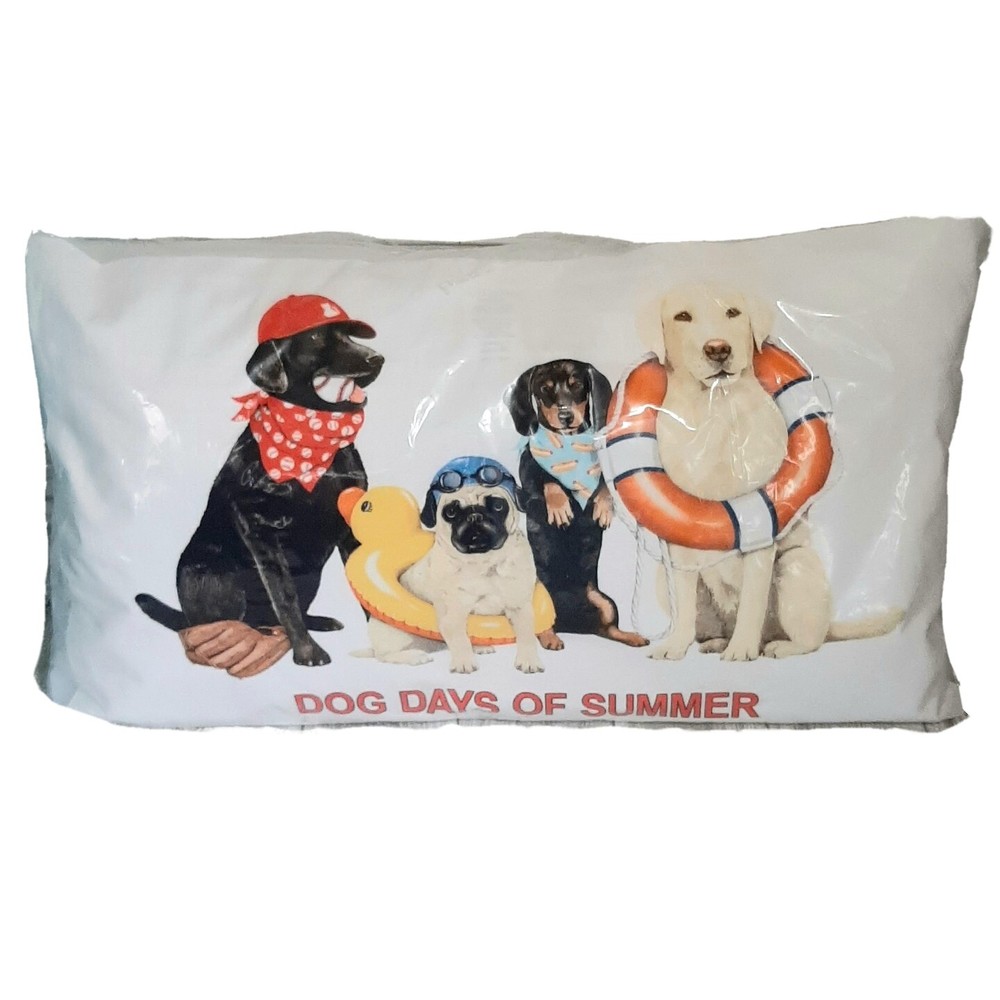 Decorative Accent Pillow Dog Days Of Summer 18" x 24" Long White Summer Dogs. Condition is New. Shipped with USPS Priority Mail. Brand new in manufacturer Packaging Fast shipping 1 day handling 24" long 14" tall Awesome print Great for back of bench in a sun room, accent a bedroom or living space Made in India By creative co-op Thanks for your interest