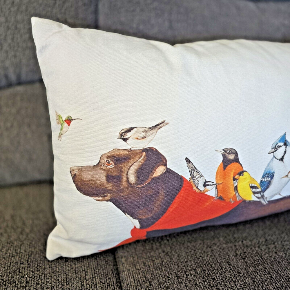This lumbar pillow is a perfect addition to any room in your home. The chocolate lab with birds on its back & head pattern is whimsical and adds a touch of playfulness to your decor. Measuring approx. 25 inches in length, 14 inches in height, and 8 inches in width, this pillow is the perfect size to use as a lumbar support pillow or as a decorative accent piece. Crafted from 100% cotton and 100% polyester, this pillow is both soft and durable. It is machine washable for easy care and maintenance. The zip closure allows for easy removal and cleaning. This pillow is a great choice for women, men, boys, girls, and kids who love pets and want to add a touch of fun to their home decor.