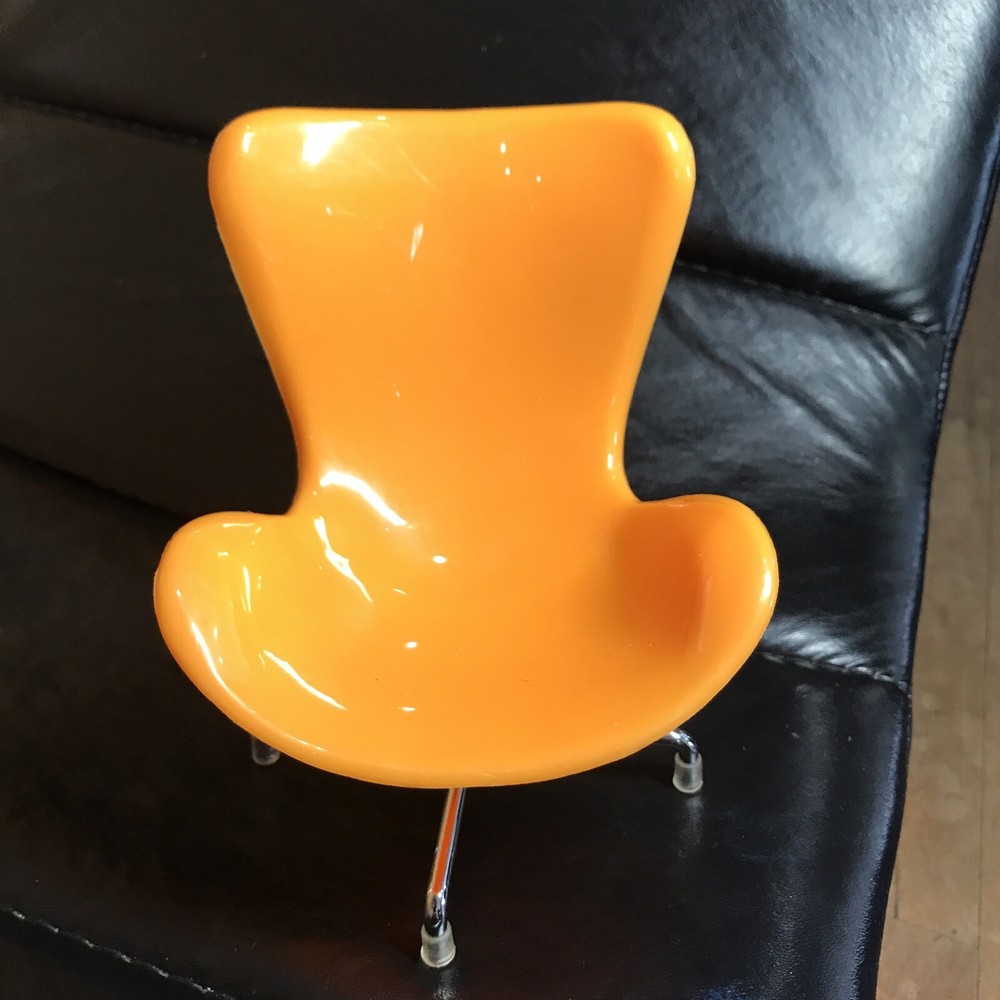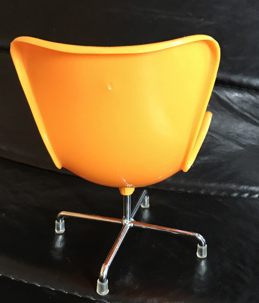 This mid century modern doll chair is the perfect addition to any dollhouse. With a space age design and silver tone, this chair is sure to catch the eye of any doll collector. The chair is made of plastic and metal, making it durable enough for everyday play. This gender neutral chair is compatible with 6-inch dolls and is ideal for any room in the dollhouse. The set includes only the chair and its vibrant orange color is sure to add a pop of color to any decor. Upgrade your dollhouse furniture with this unique and stylish mid century modern doll chair.