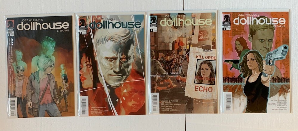 Dollhouse - Comic Book Set - Lot of 4 - Joss Whedon - Dark Horse. First 4 issues of the first ever Dollhouse series based on the Joss Whedon show. Use pictures to judge item for yourself. Auction Comes with everything pictured. Ask any questions before bidding. Payment must be received within 3 days of end of auction. Shipped via USPS Media Mail. Tracking number will be provided.