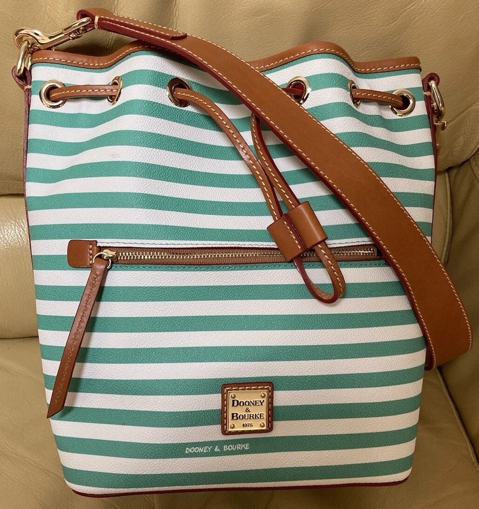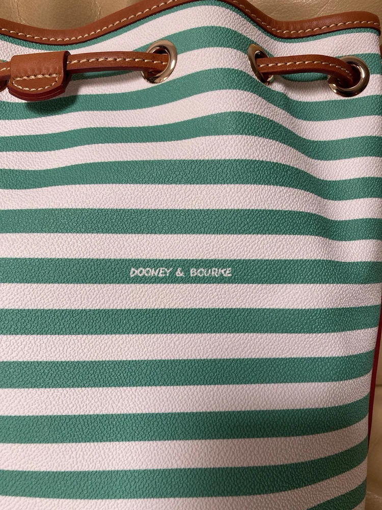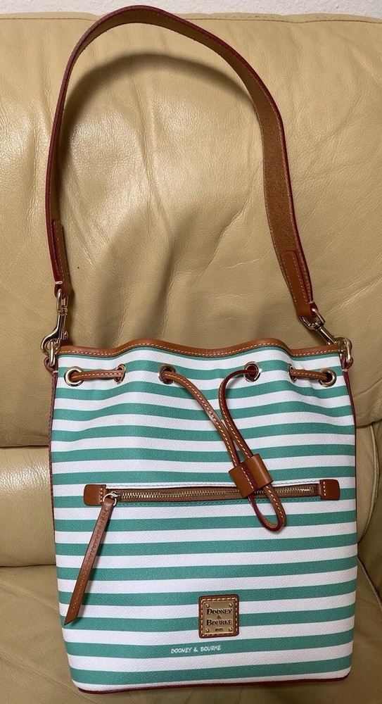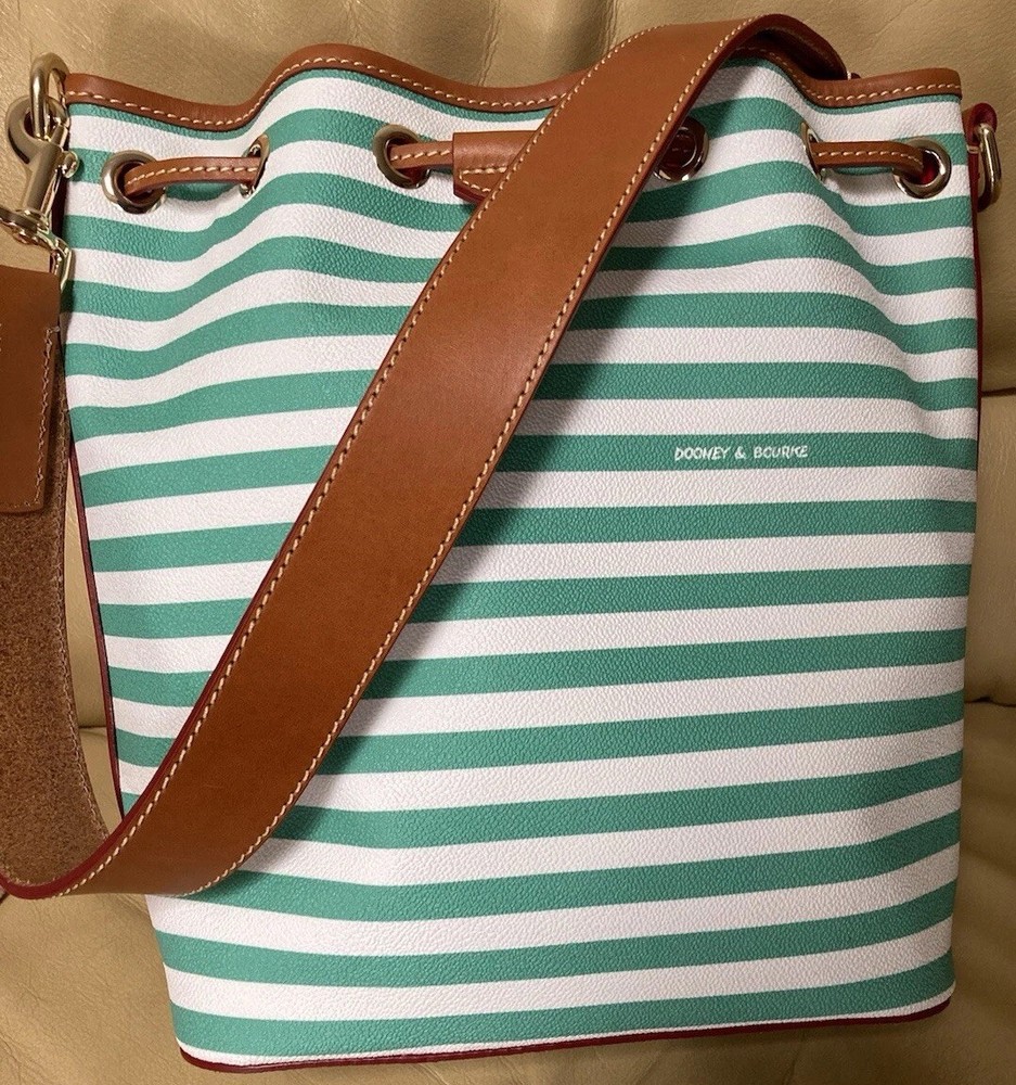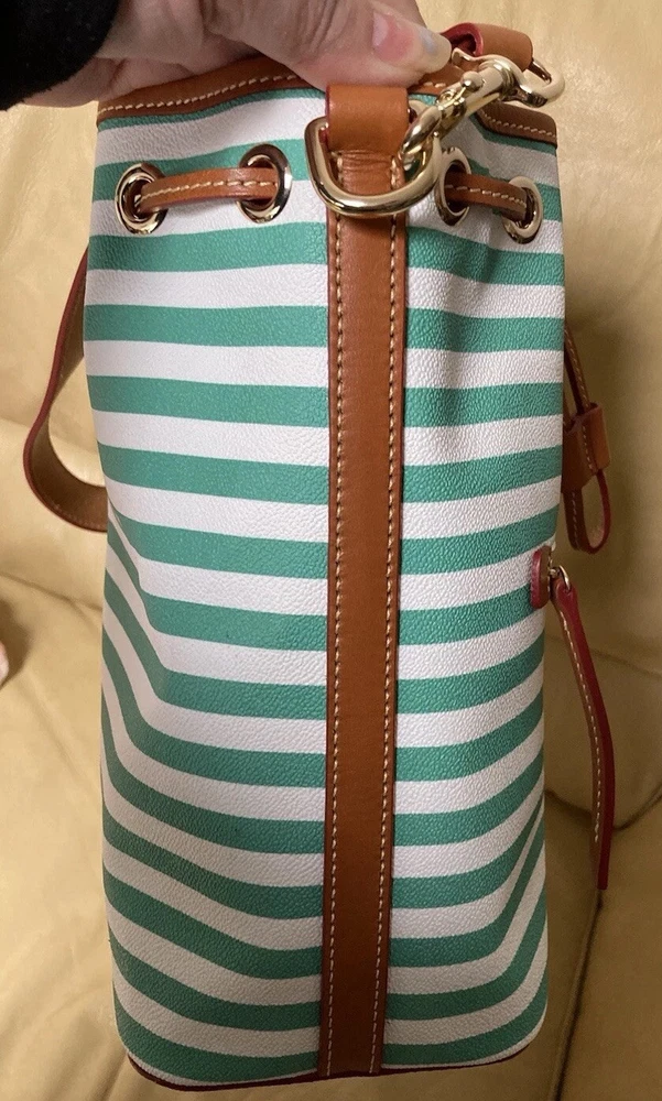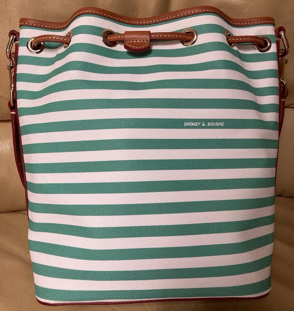 Dooney & Bourke Sullivan Collection. Gorgeous, colorful yet classy stripes! Coated Fabric and Vacchetta Leather. A designer drawstring bucket shoulder bag. It’s perfect for every day or that special occasion! Interior zipper and slip pockets to carry your essentials. Drawstring Closure. Color: Green and white. Brown leather trim. Red Interior lining. Size: 9.5” width/length. 11” height. 5” depth. Strap has 12” drop. Condition: Very good, gently preowned condition. There’s some small scratches and small scuffs on the exterior. There’s a few small wrinkles on the leather trim. Interior lining is pretty clean for a preowned bag. Overall, this is a beautiful handbag! Check out my other Dooney and Bourke listings. I am always adding more! *Leather is a natural substance that has different characteristics and qualities including veining, creases, shading, markings and color variations that are considered natural features of leather, and that make each item unique.