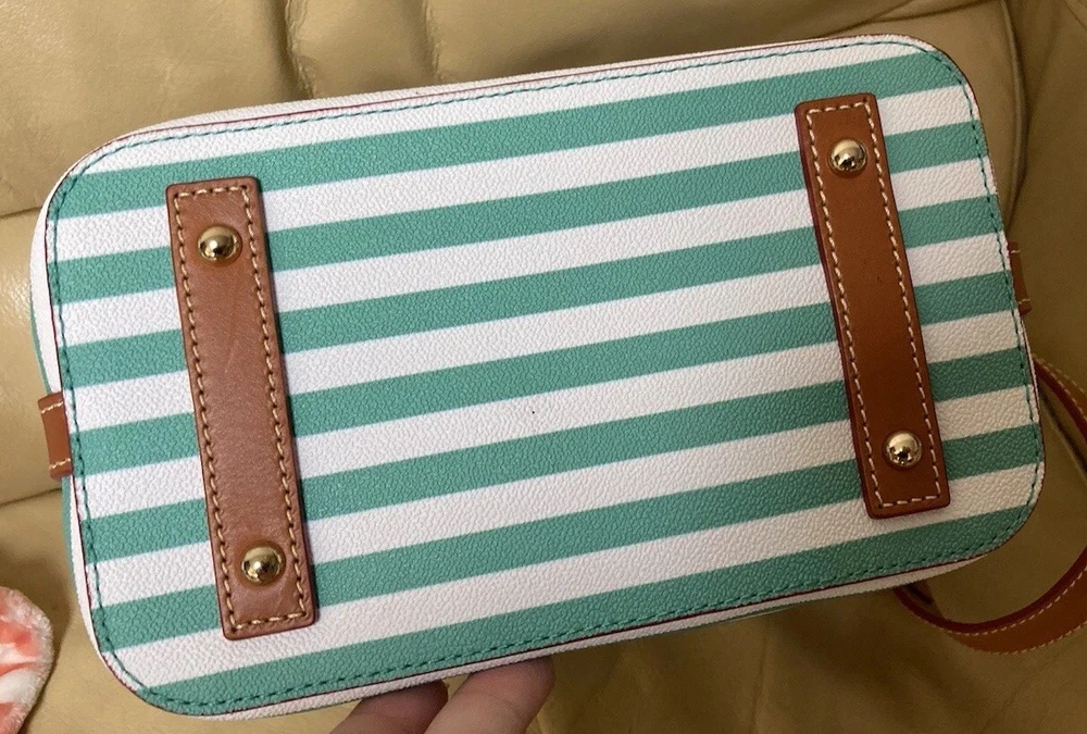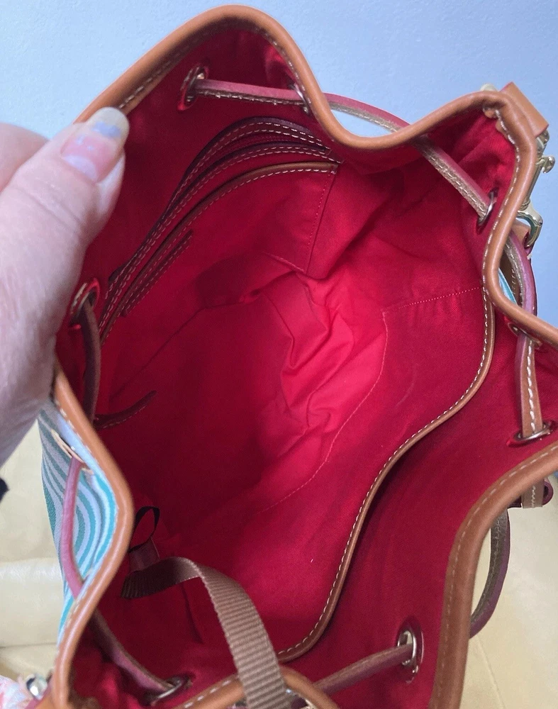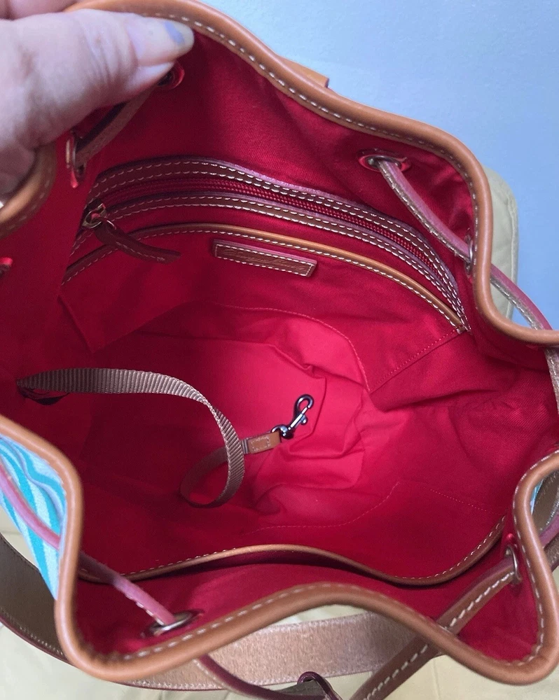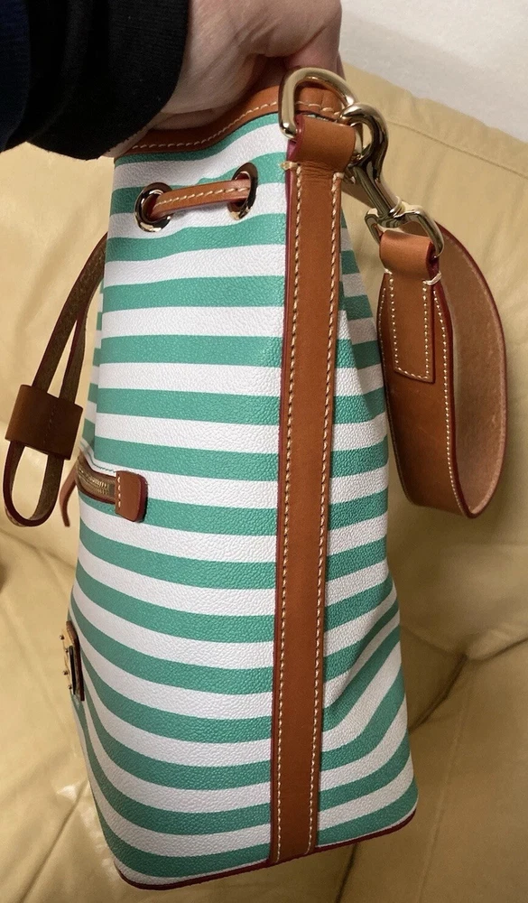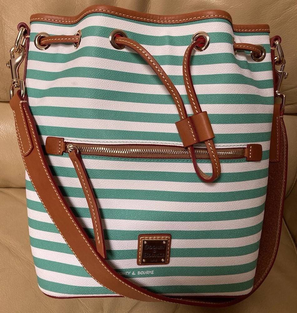 Dooney & Bourke Sullivan Collection. Gorgeous, colorful yet classy stripes! Coated Fabric and Vacchetta Leather. A designer drawstring bucket shoulder bag. It’s perfect for every day or that special occasion! Interior zipper and slip pockets to carry your essentials. Drawstring Closure. Color: Green and white. Brown leather trim. Red Interior lining. Size: 9.5” width/length. 11” height. 5” depth. Strap has 12” drop. Condition: Very good, gently preowned condition. There’s some small scratches and small scuffs on the exterior. There’s a few small wrinkles on the leather trim. Interior lining is pretty clean for a preowned bag. Overall, this is a beautiful handbag! Check out my other Dooney and Bourke listings. I am always adding more! *Leather is a natural substance that has different characteristics and qualities including veining, creases, shading, markings and color variations that are considered natural features of leather, and that make each item unique.
