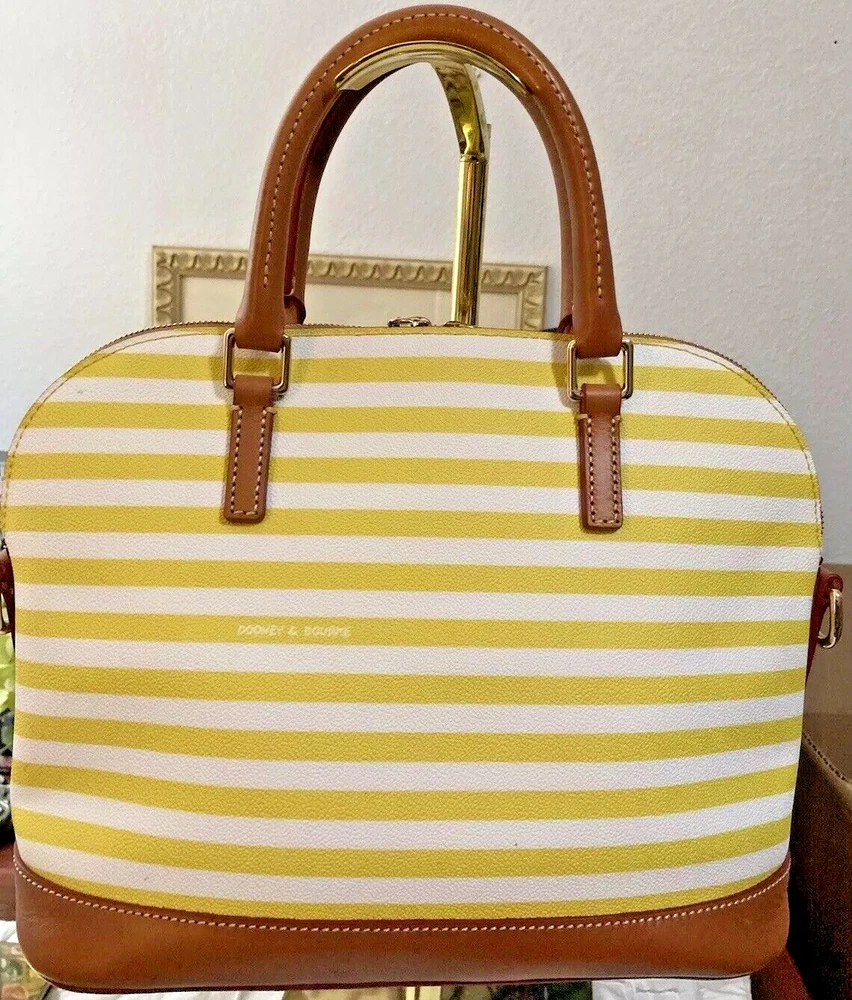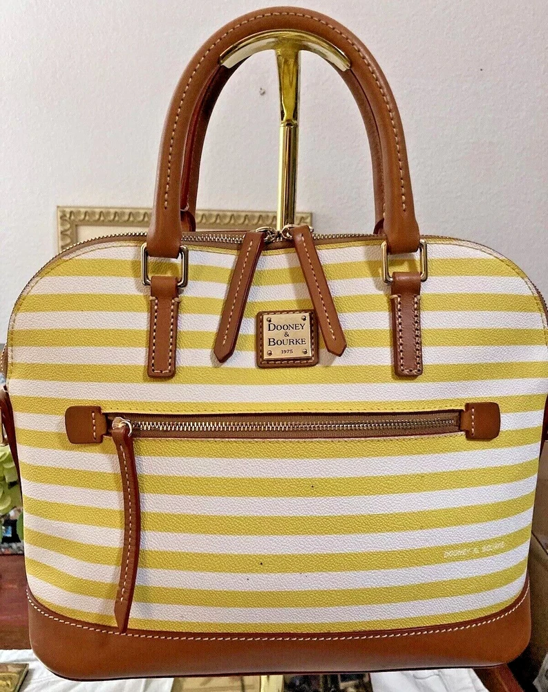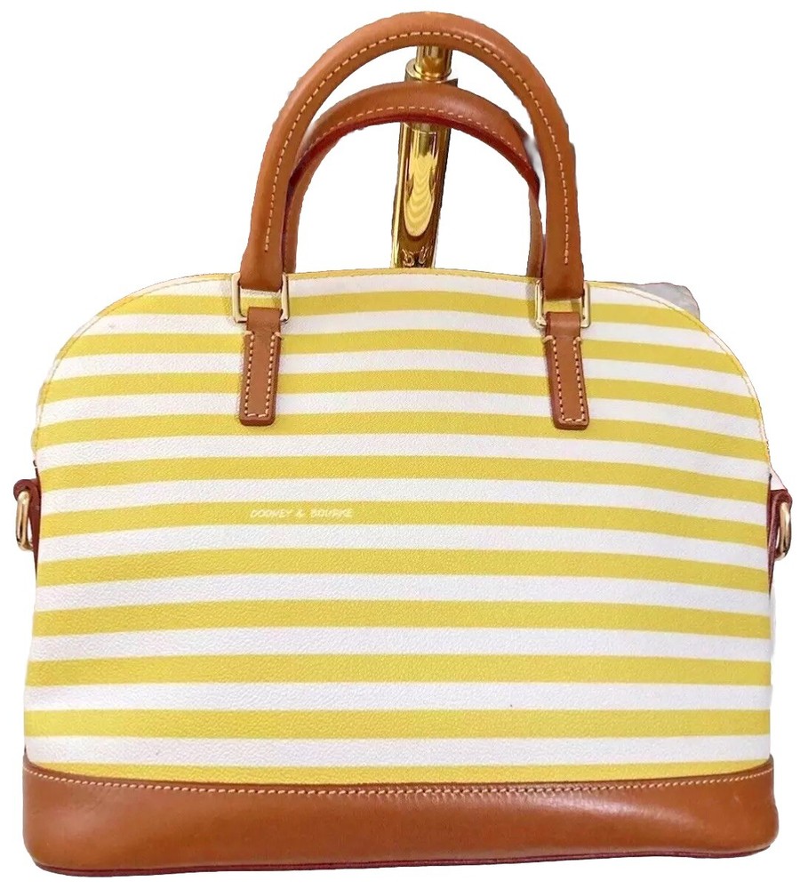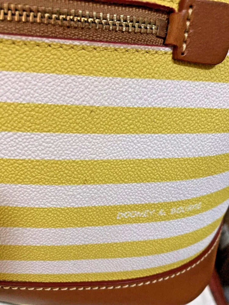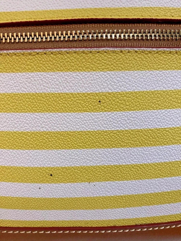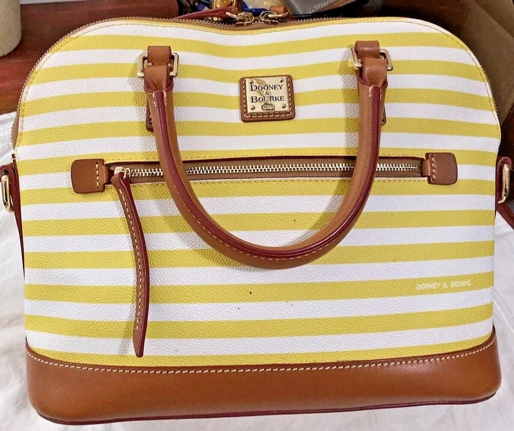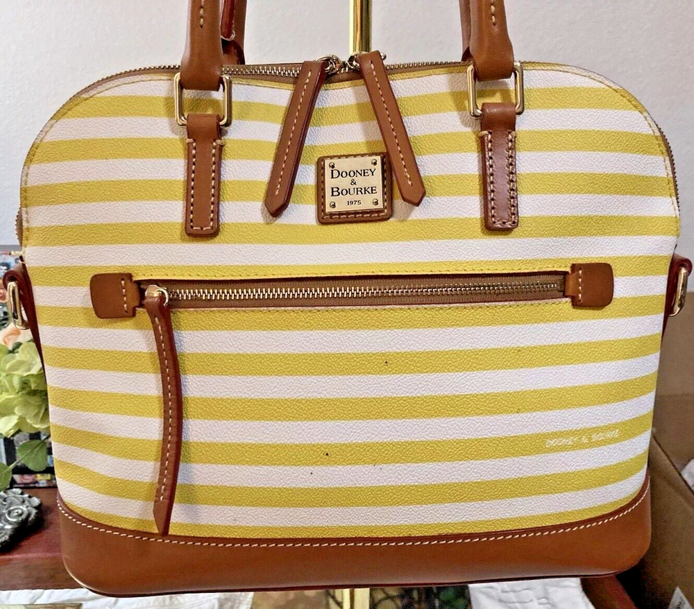 Dooney & Bourke Sullivan Collection. Gorgeous, colorful yet classy stripes! Coated Fabric and Vacchetta Leather. A classic zip pocket Domed Satchel. It’s perfect for every day or that special occasion! Exterior zip pocket. Interior zipper and slip pockets to carry your essentials. Zip around Closure. Inside key leash. Color: Yellow and white. Brown leather trim. Red Interior lining. Size: 14” width/length. 10” height. 7” depth. Handles have 5” drop. Comes with a detachable shoulder strap with extension piece. Condition: Very good, preowned condition. There’s some small scratches and small scuffs on the exterior. There’s a few small wrinkles on the bottom leather trim. Interior has a few spots, but overall is fairly clean for a preowned bag. Overall, this is a beautiful handbag! Check out my other Dooney and Bourke listings. I am always adding more! *Leather is a natural substance that has different characteristics and qualities including veining, creases, shading, markings and color variations that are considered natural features of leather, and that make each item unique.