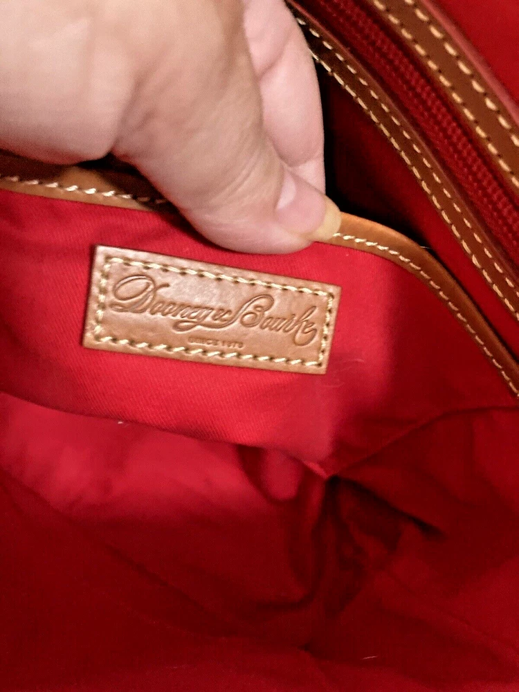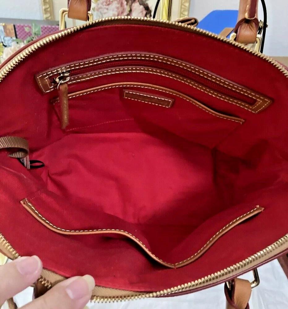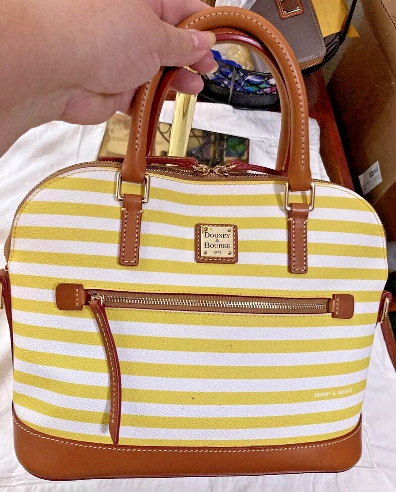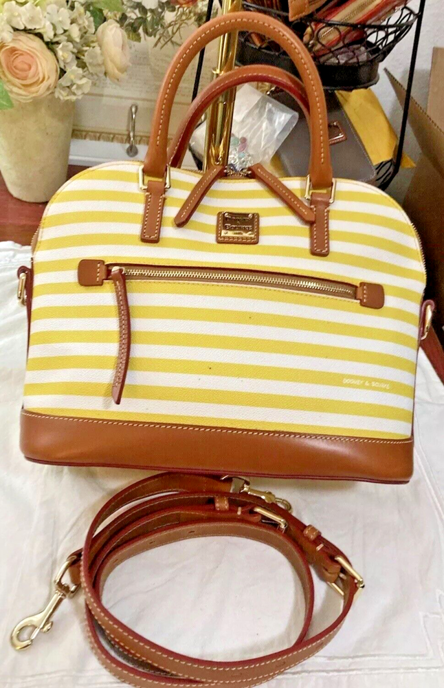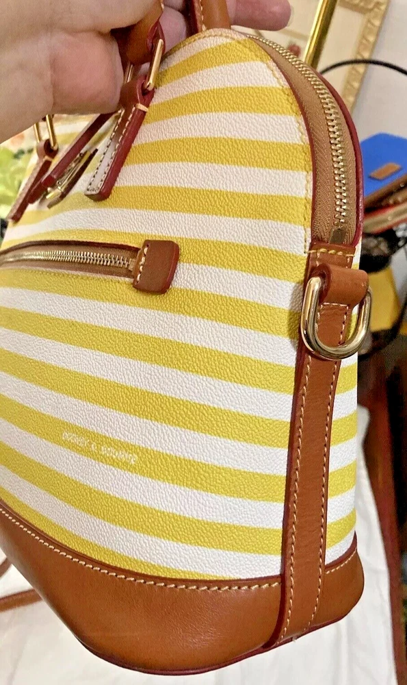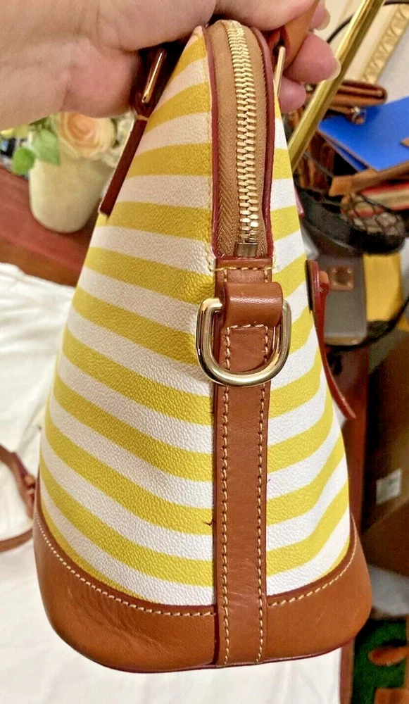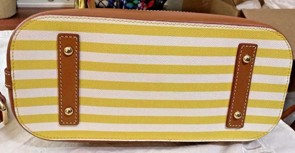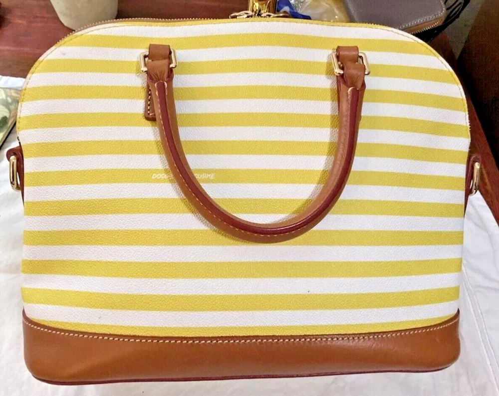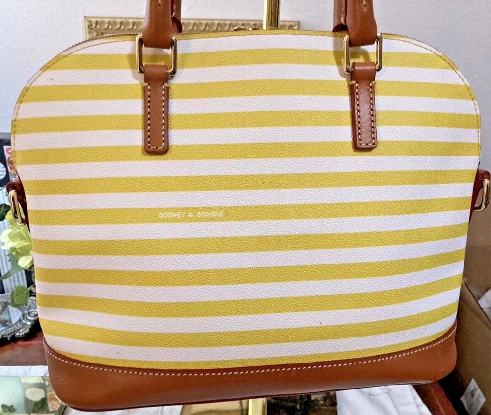 Dooney & Bourke Sullivan Collection. Gorgeous, colorful yet classy stripes! Coated Fabric and Vacchetta Leather. A classic zip pocket Domed Satchel. It’s perfect for every day or that special occasion! Exterior zip pocket. Interior zipper and slip pockets to carry your essentials. Zip around Closure. Inside key leash. Color: Yellow and white. Brown leather trim. Red Interior lining. Size: 14” width/length. 10” height. 7” depth. Handles have 5” drop. Comes with a detachable shoulder strap with extension piece. Condition: Very good, preowned condition. There’s some small scratches and small scuffs on the exterior. There’s a few small wrinkles on the bottom leather trim. Interior has a few spots, but overall is fairly clean for a preowned bag. Overall, this is a beautiful handbag! Check out my other Dooney and Bourke listings. I am always adding more! *Leather is a natural substance that has different characteristics and qualities including veining, creases, shading, markings and color variations that are considered natural features of leather, and that make each item unique.